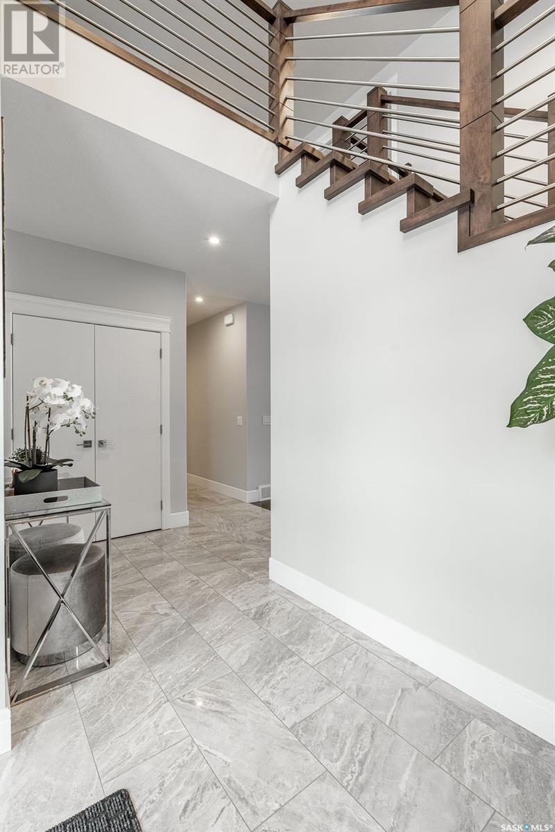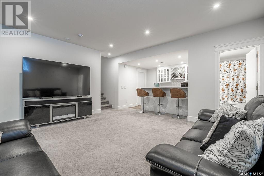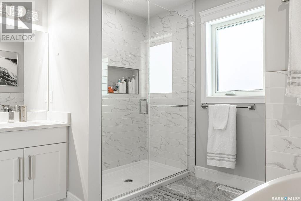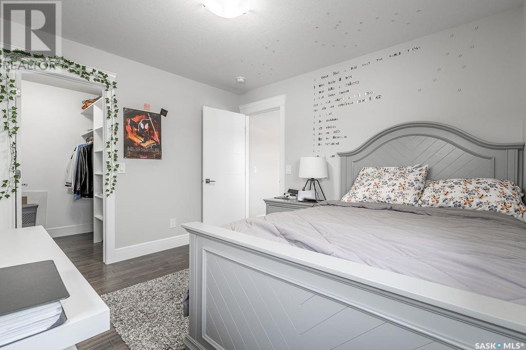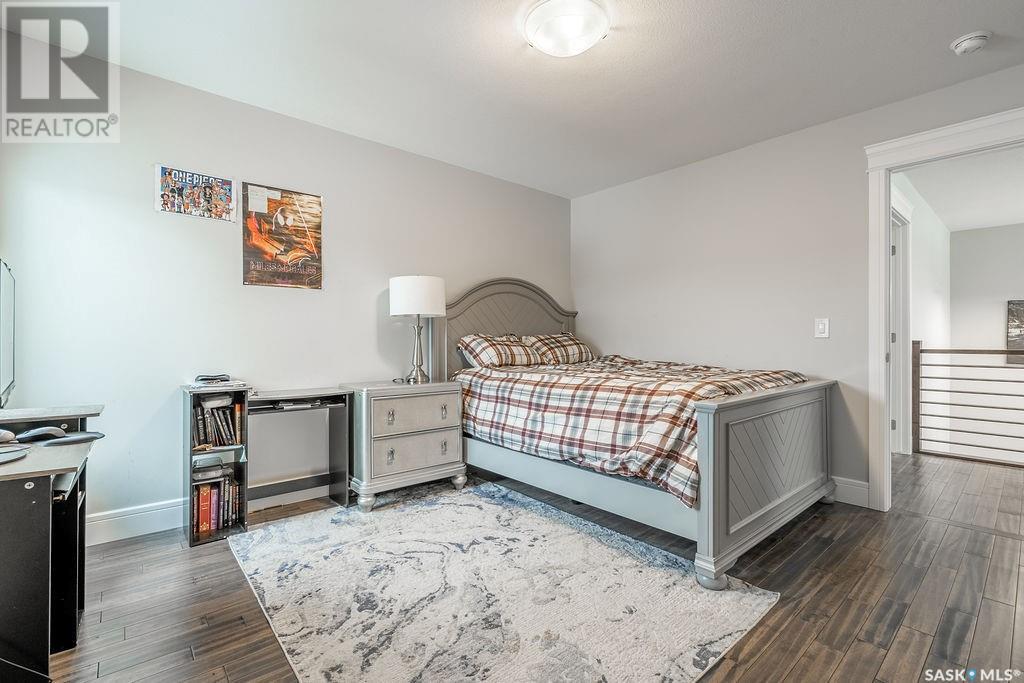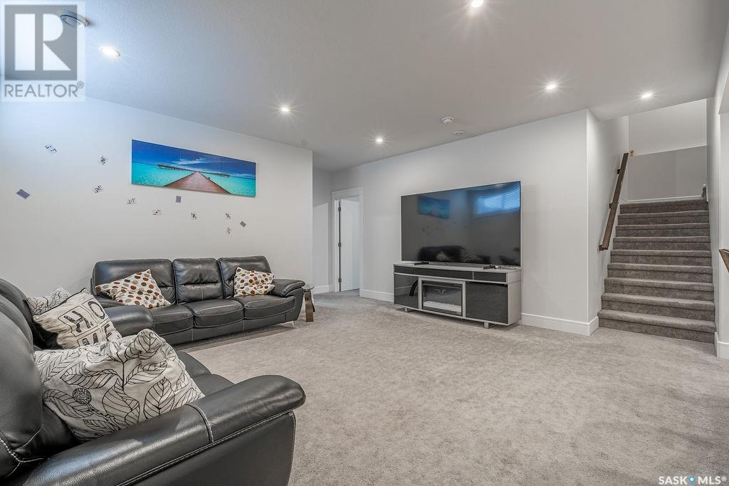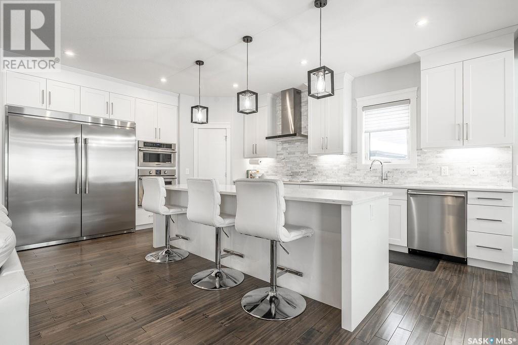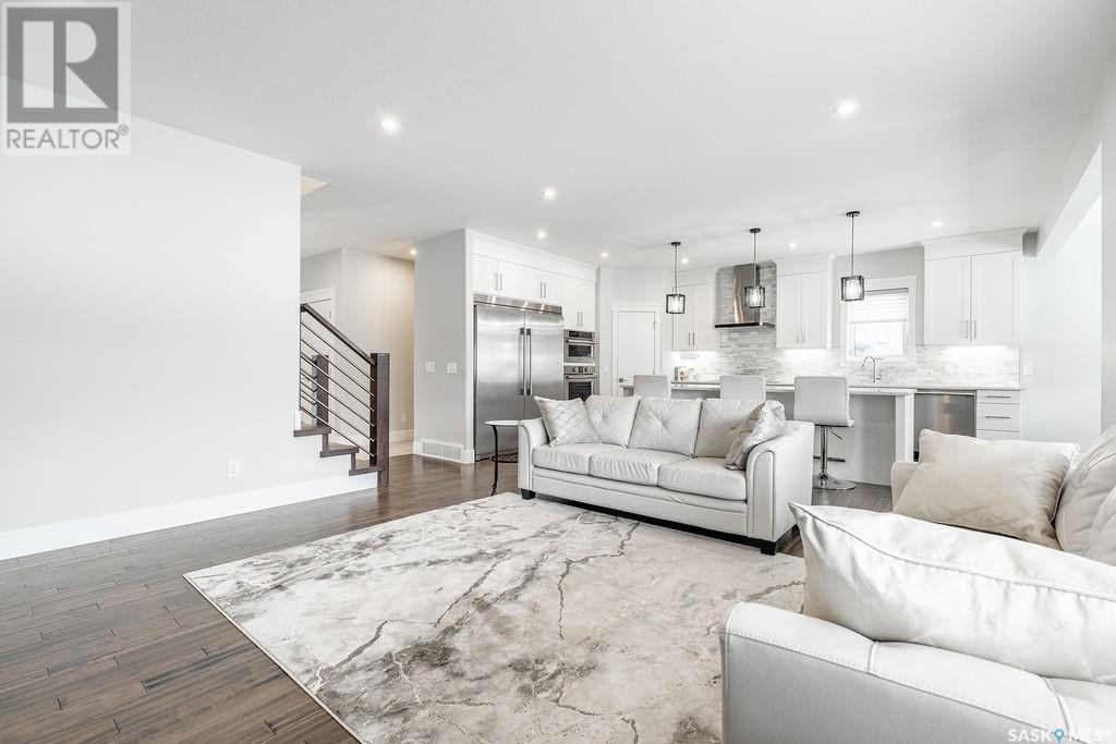 Elegance and function- Are you looking for the full package!? Extra-large 4 car garage, luxury finishes, bonus room, finished basement, oversized en suite and primary bedroom! Look no further, welcome to 515 Kenaschuk Way! No expense has been spared on this luxurious large fully-finished two-story. Porcelain tile and hand scraped hardwood throughout. Walk into a soaring two-story front entryway leading into your open concept main floor. The living room has a beautiful electric fireplace with a stone and live edge mantle and large windows overlooking the covered deck. The kitchen has an 11 foot eat-up island, full height white cabinets, professional-style appliances including induction cooktop and separate full-sized side-by-side fridge & freezer, wall oven, and walk-through pantry. The dining area has a wall of windows overlooking the backyard. Mudroom area to the garage and 2-piece powder room round out this floor. The open staircase over-looks the foyer and leads you to the spacious 2nd floor where you will find a large bonus room, three bedrooms, two bathrooms and a gorgeous laundry room. The primary en-suite has an elegant freestanding tub, walk-in glass shower, marble porcelain tile, in floor heat, a vanity with two sinks, a walk-in closet with fitted drawers and shelving. The basement includes two more bedrooms, family room, perfect wet bar for entertaining, utility room and another four piece bathroom. The backyard is fully fenced and has trees, lawn and a garden. The massive four car heated garage has a door that drives right through to the backyard. This house has been outfitted with blinds, air conditioning and beautiful landscaping. Close to all amenities and easy access to the Chief Mistawasis bridge. Call your agent for your showing today. (id:43042)
