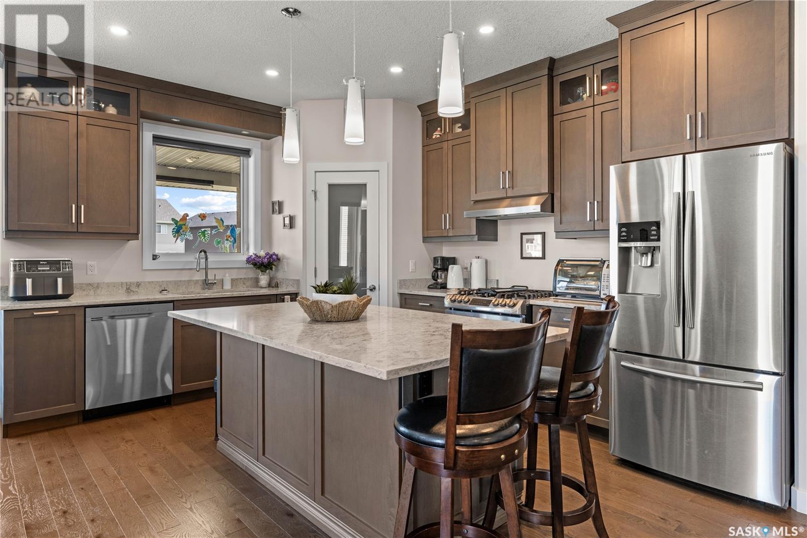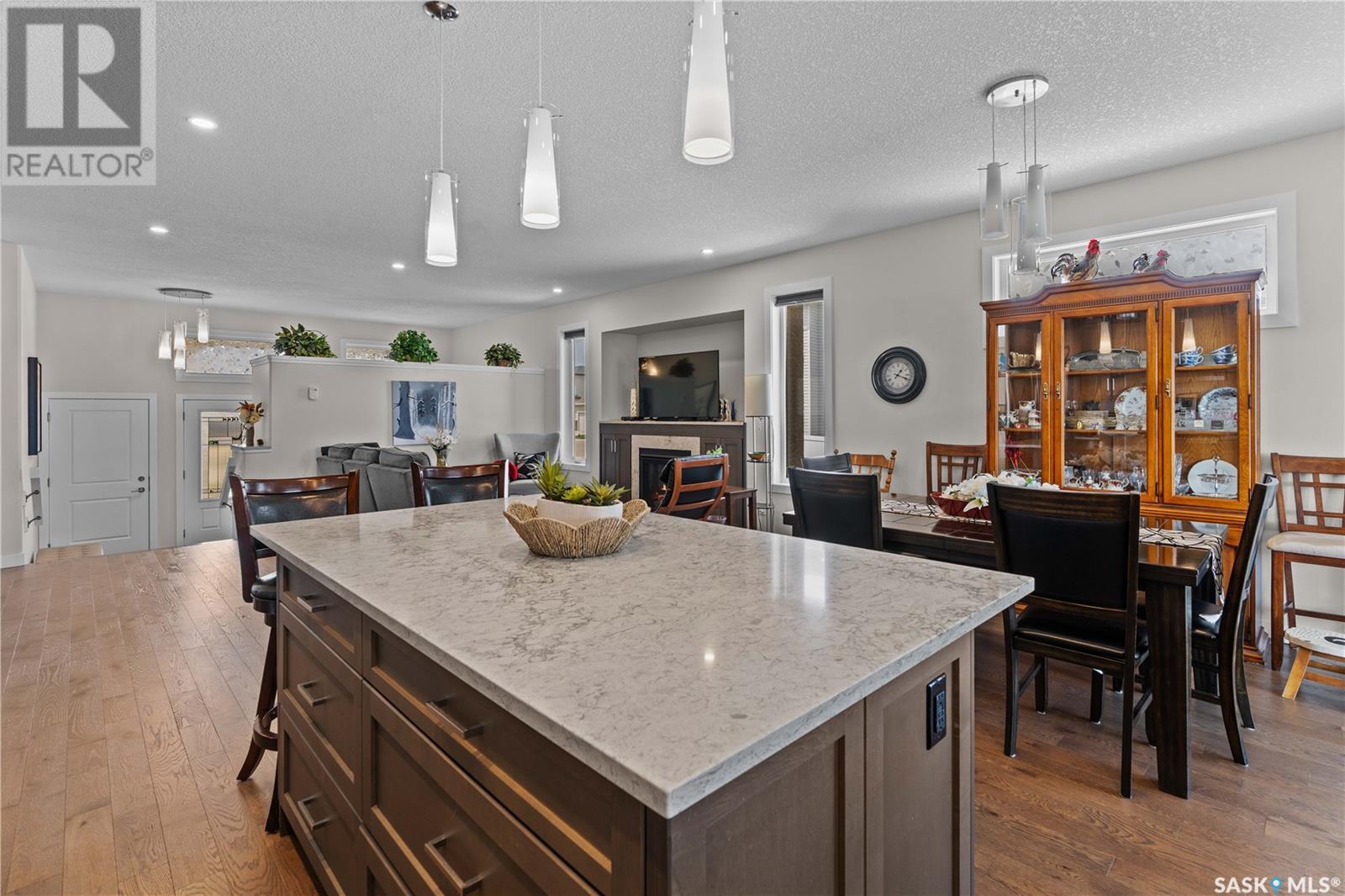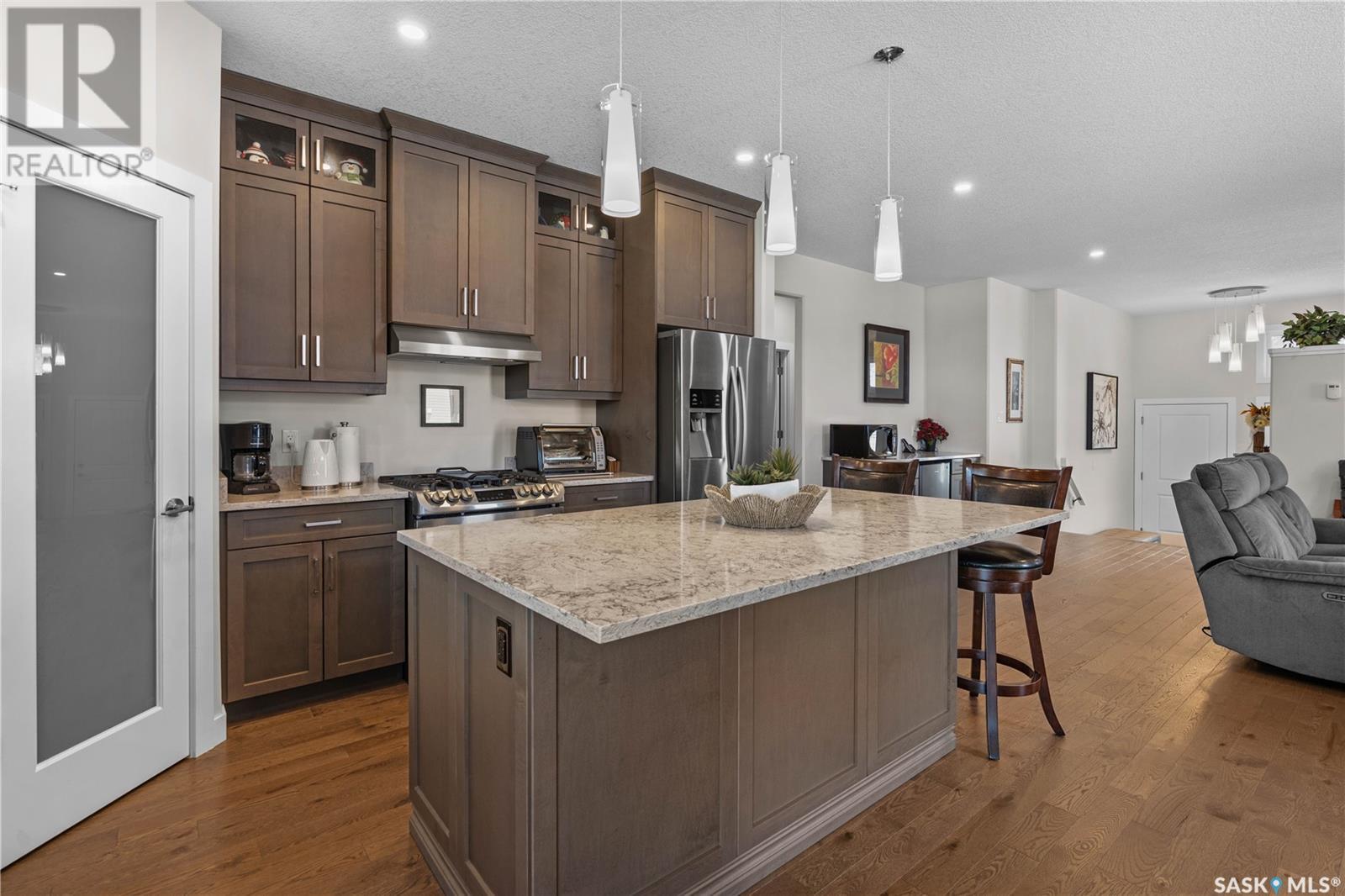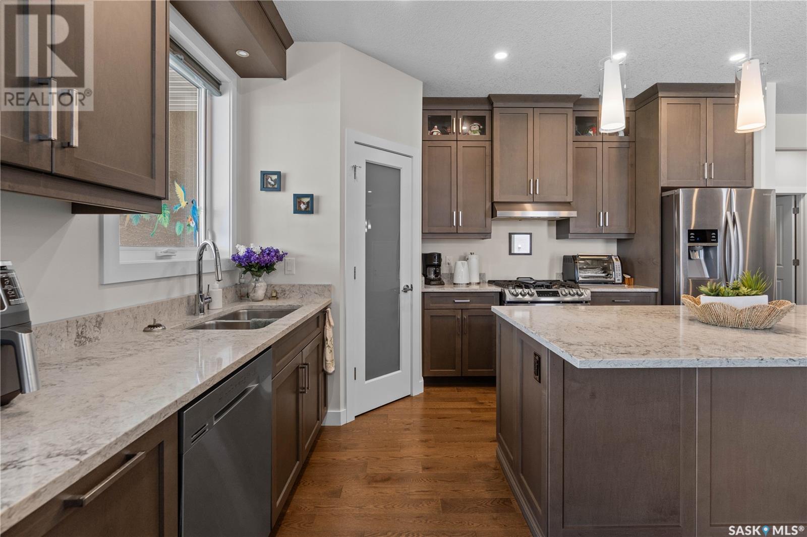 Welcome to 5206 Green Cr E. This spacious and beautiful bungalow is located in the Greens on Gardiner. The home is approximately 1610 square feet and is welcoming and bright from the moment you enter into the large foyer area! This home has been built with pride and has many wonderful features including quartz countertops that match the gas fireplace and gorgeous hardwood flooring throughout most of the main level. From the front entrance you come into a very large great room area that is open to the beautiful kitchen and adjoining dining area. From the dining area you can exit onto the covered deck that is completely maintenance free and is constructed with dura deck covering and metal railings. This is a wonderful place to have morning coffee and the best part is that it backs onto the walking path. Back inside, you find 3 good sized bedrooms. The master is a good size and has a 4 piece ensuite and walk-in closet! The main floor bathroom and separate laundry area complete this level of the home. There is direct entry to the fully insulated and heated over sized double garage. The basement is fully finished with large rec-room, wet bar, 3 nice sized bedrooms 4pc bathroom and generous storage room. This home has high end finishings throughout and is ready for its new family. It is close to all amenities and children can take the walking path to school! A must see! (id:43042)