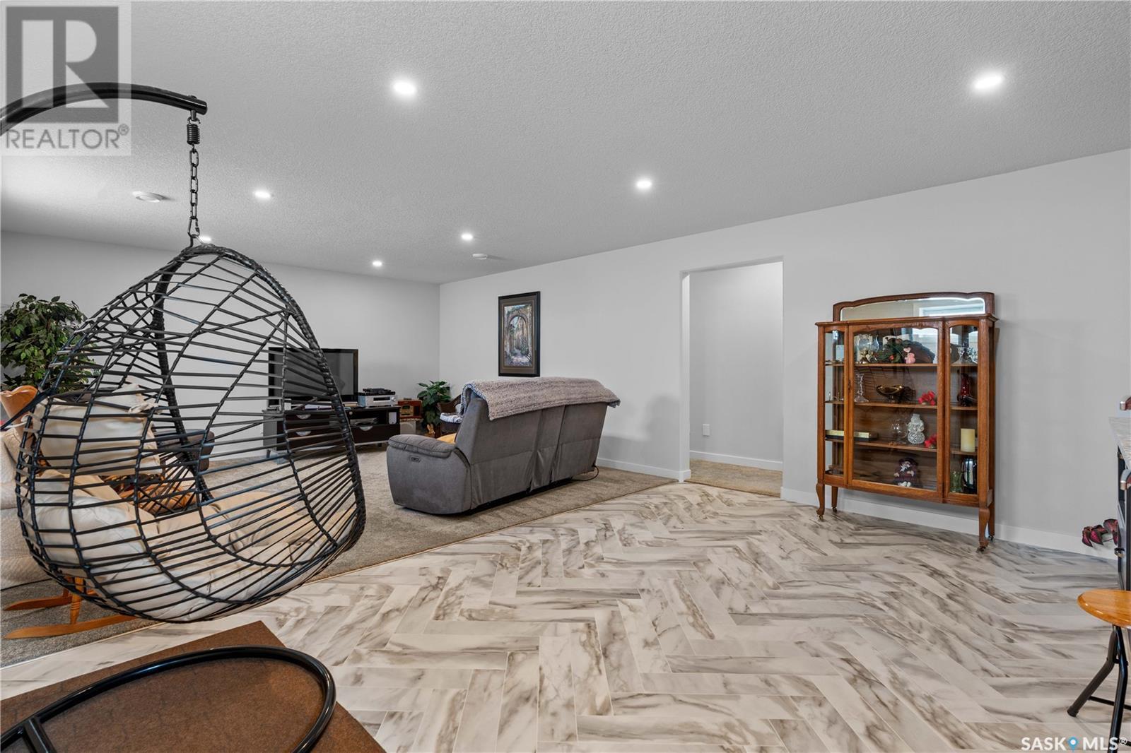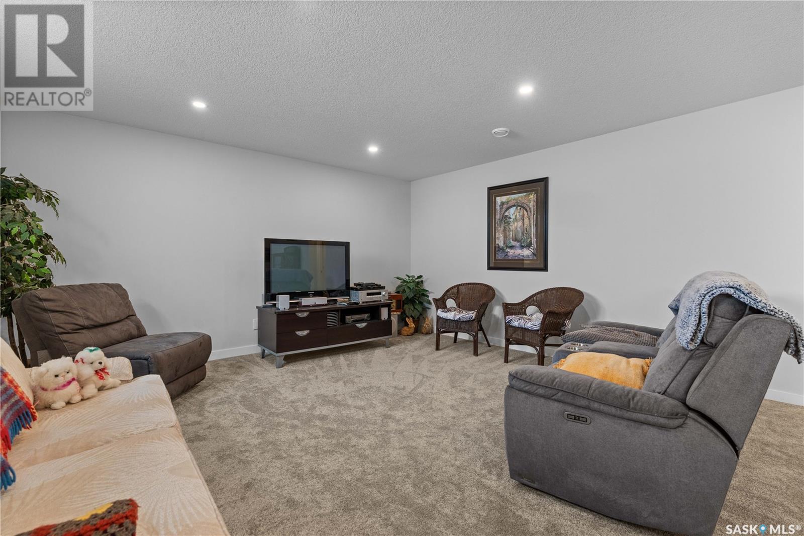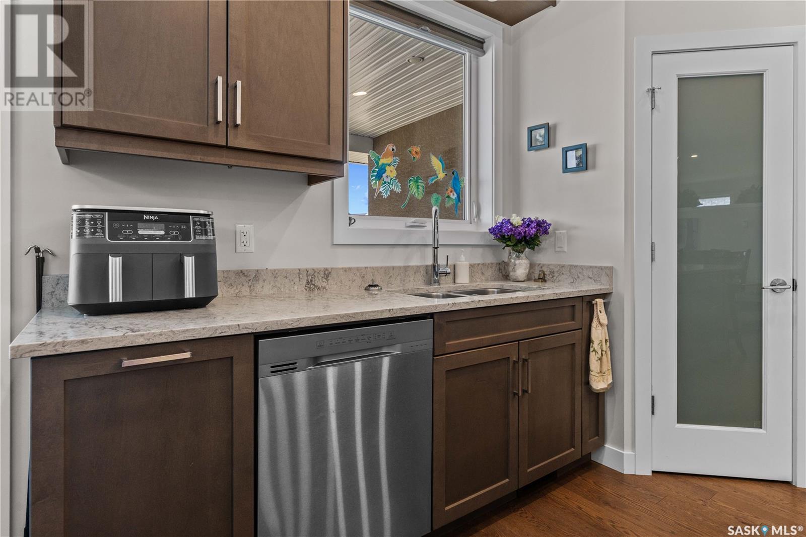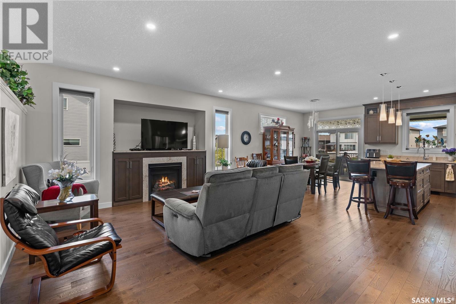 Welcome to 5206 Green Cr E. This spacious and beautiful bungalow is located in the Greens on Gardiner. The home is approximately 1610 square feet and is welcoming and bright from the moment you enter into the large foyer area! This home has been built with pride and has many wonderful features including quartz countertops that match the gas fireplace and gorgeous hardwood flooring throughout most of the main level. From the front entrance you come into a very large great room area that is open to the beautiful kitchen and adjoining dining area. From the dining area you can exit onto the covered deck that is completely maintenance free and is constructed with dura deck covering and metal railings. This is a wonderful place to have morning coffee and the best part is that it backs onto the walking path. Back inside, you find 3 good sized bedrooms. The master is a good size and has a 4 piece ensuite and walk-in closet! The main floor bathroom and separate laundry area complete this level of the home. There is direct entry to the fully insulated and heated over sized double garage. The basement is fully finished with large rec-room, wet bar, 3 nice sized bedrooms 4pc bathroom and generous storage room. This home has high end finishings throughout and is ready for its new family. It is close to all amenities and children can take the walking path to school! A must see! (id:43042)