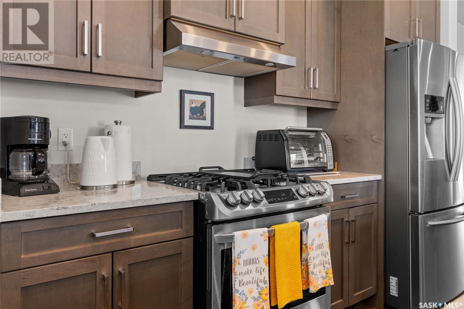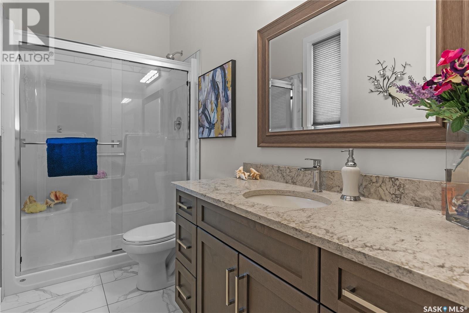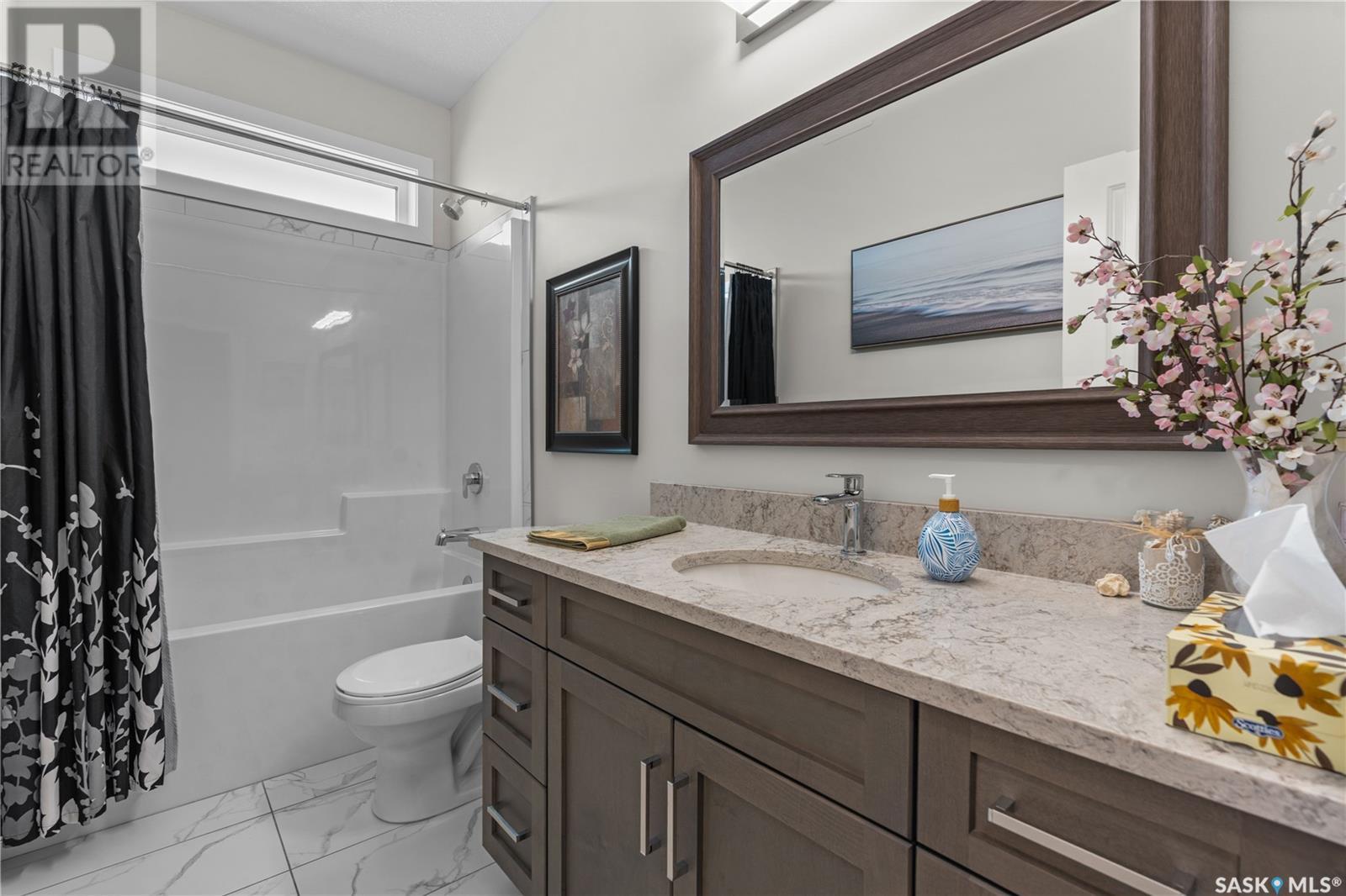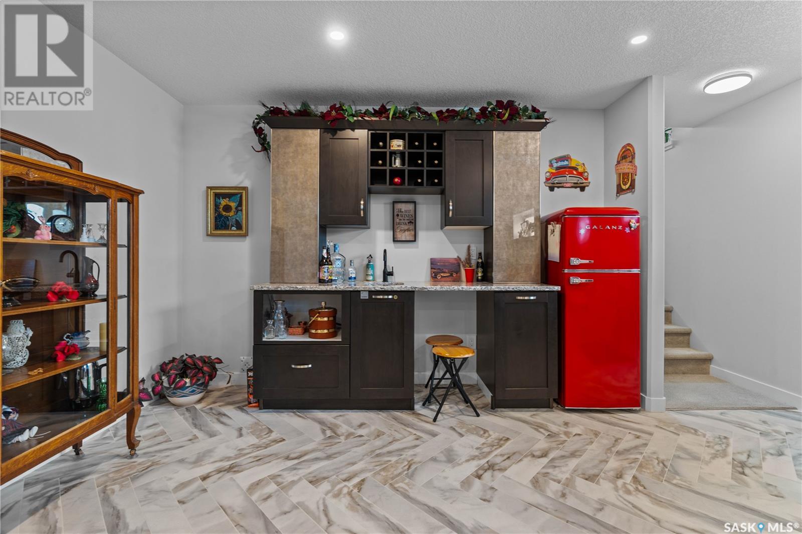 Welcome to 5206 Green Cr E. This spacious and beautiful bungalow is located in the Greens on Gardiner. The home is approximately 1610 square feet and is welcoming and bright from the moment you enter into the large foyer area! This home has been built with pride and has many wonderful features including quartz countertops that match the gas fireplace and gorgeous hardwood flooring throughout most of the main level. From the front entrance you come into a very large great room area that is open to the beautiful kitchen and adjoining dining area. From the dining area you can exit onto the covered deck that is completely maintenance free and is constructed with dura deck covering and metal railings. This is a wonderful place to have morning coffee and the best part is that it backs onto the walking path. Back inside, you find 3 good sized bedrooms. The master is a good size and has a 4 piece ensuite and walk-in closet! The main floor bathroom and separate laundry area complete this level of the home. There is direct entry to the fully insulated and heated over sized double garage. The basement is fully finished with large rec-room, wet bar, 3 nice sized bedrooms 4pc bathroom and generous storage room. This home has high end finishings throughout and is ready for its new family. It is close to all amenities and children can take the walking path to school! A must see! (id:43042)