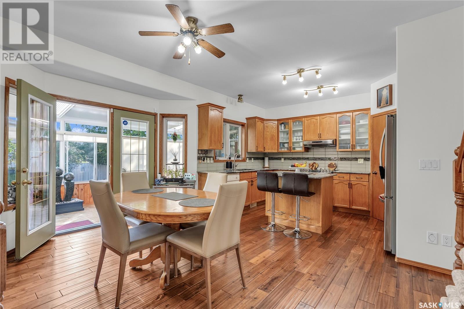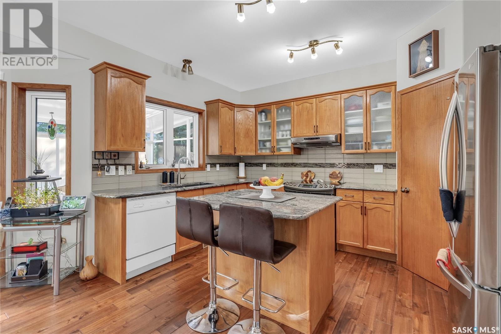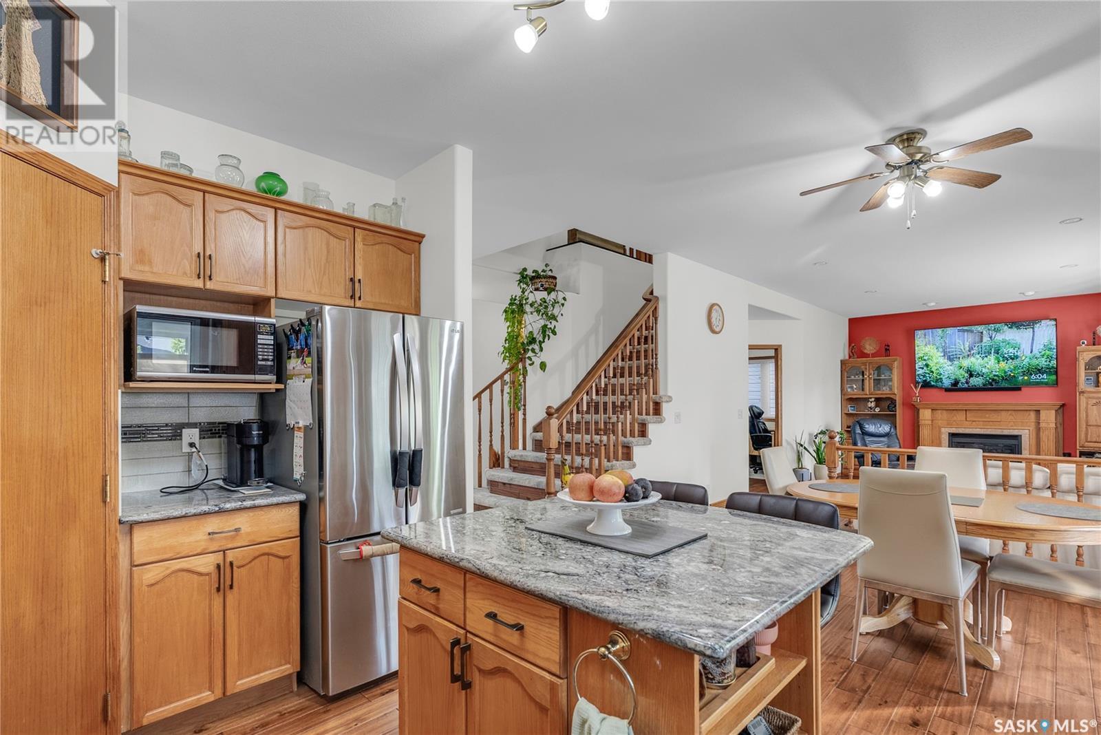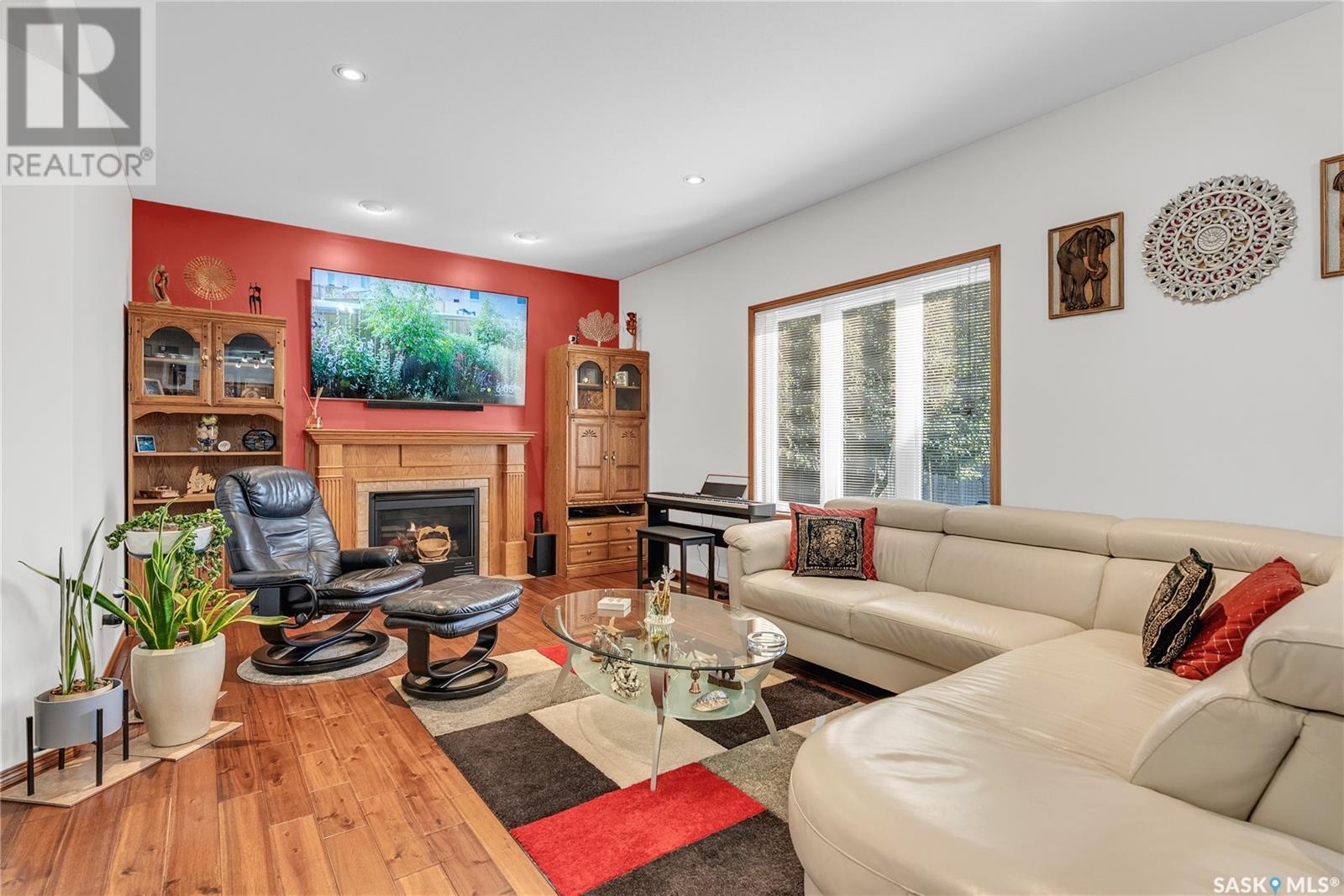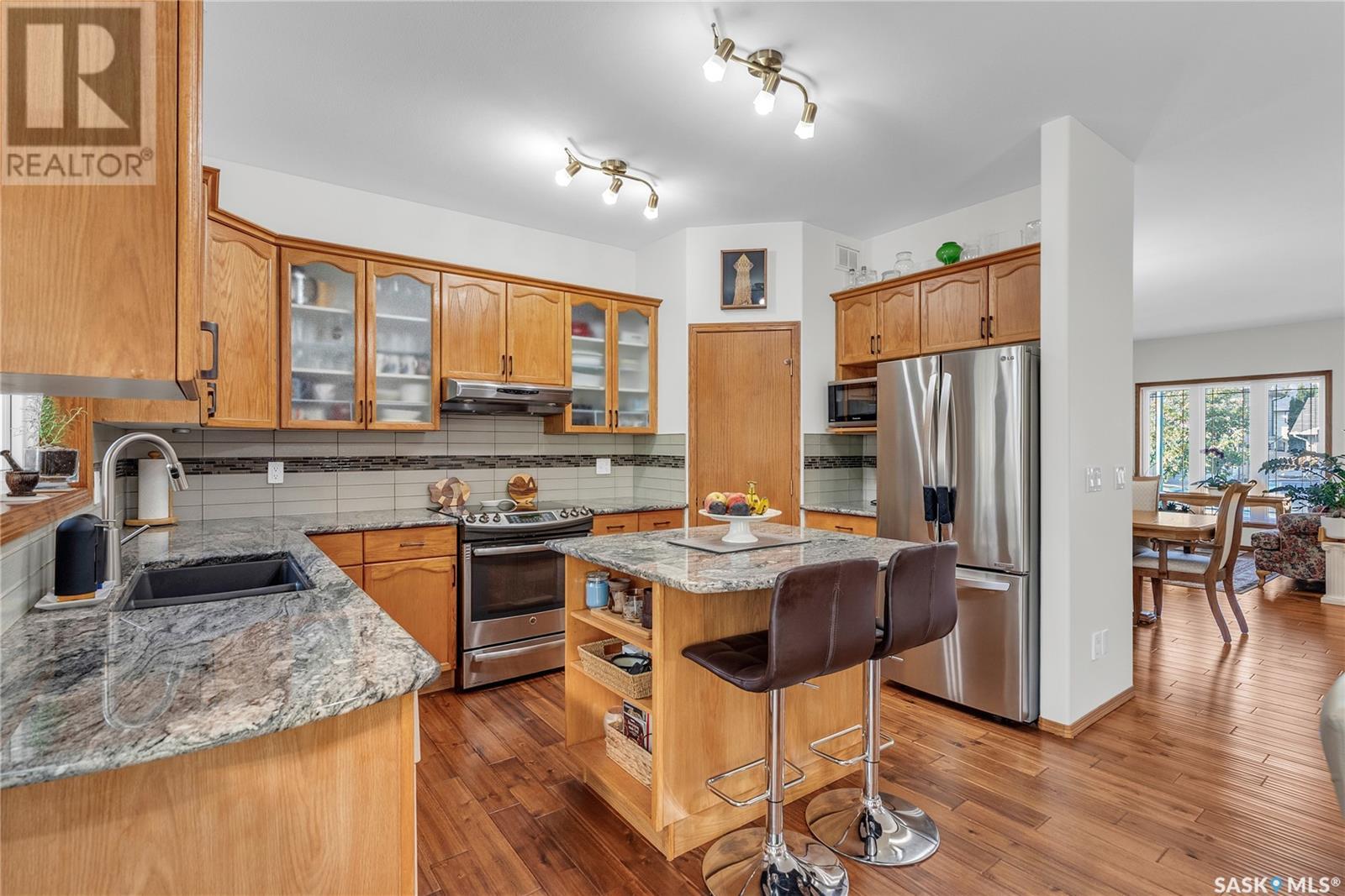 Welcome to 531 Kucey Crescent – A Beautifully Updated Family Home in Arbor Creek. Ideally located in the highly sought-after neighborhood of Arbor Creek, this spacious 1,893 sq ft two-storey split is just steps from Arbor Creek Park. Inside, you're greeted by a bright and spacious foyer that flows into a bayed front living room and a formal dining area—perfect for entertaining. The main floor showcases beautiful hardwood and tile flooring throughout. The oak kitchen offers both style and functionality, featuring granite countertops, a Sil-Granite sink, tiled backsplash, ample cabinetry (including frosted glass accents), an island with seating and pendant lighting, plus stove, dishwasher, fridge & hood fan. Enjoy casual meals in the bayed dining nook with direct access to the sunroom and mature backyard—complete with a brick patio, and lush landscaping. The cozy family room features a gas fireplace with oak mantle and tiled hearth, recessed lighting, and a welcoming ambiance. A main-floor den, 2-piece powder room, and a laundry room with pocket door and built-in shelving round out the main level.Upstairs, the primary suite offers hardwood floors, a walk-in closet, and a 3-piece ensuite with a tile and glass shower featuring a body sprayer. Two additional bedrooms and a beautifully updated 3-piece main bath—with a 5-foot tile and glass shower also equipped with a body sprayer—complete the upper level. The fully developed basement provides even more space with a large family room with wet bar, games area, two additional bedrooms, a 3-piece bath with jetted tub and handheld shower, plus dedicated storage and utility room. Additional features include a 24x22 attached garage, central air conditioning, central vac, window treatments, and great curb appeal. (id:43042)