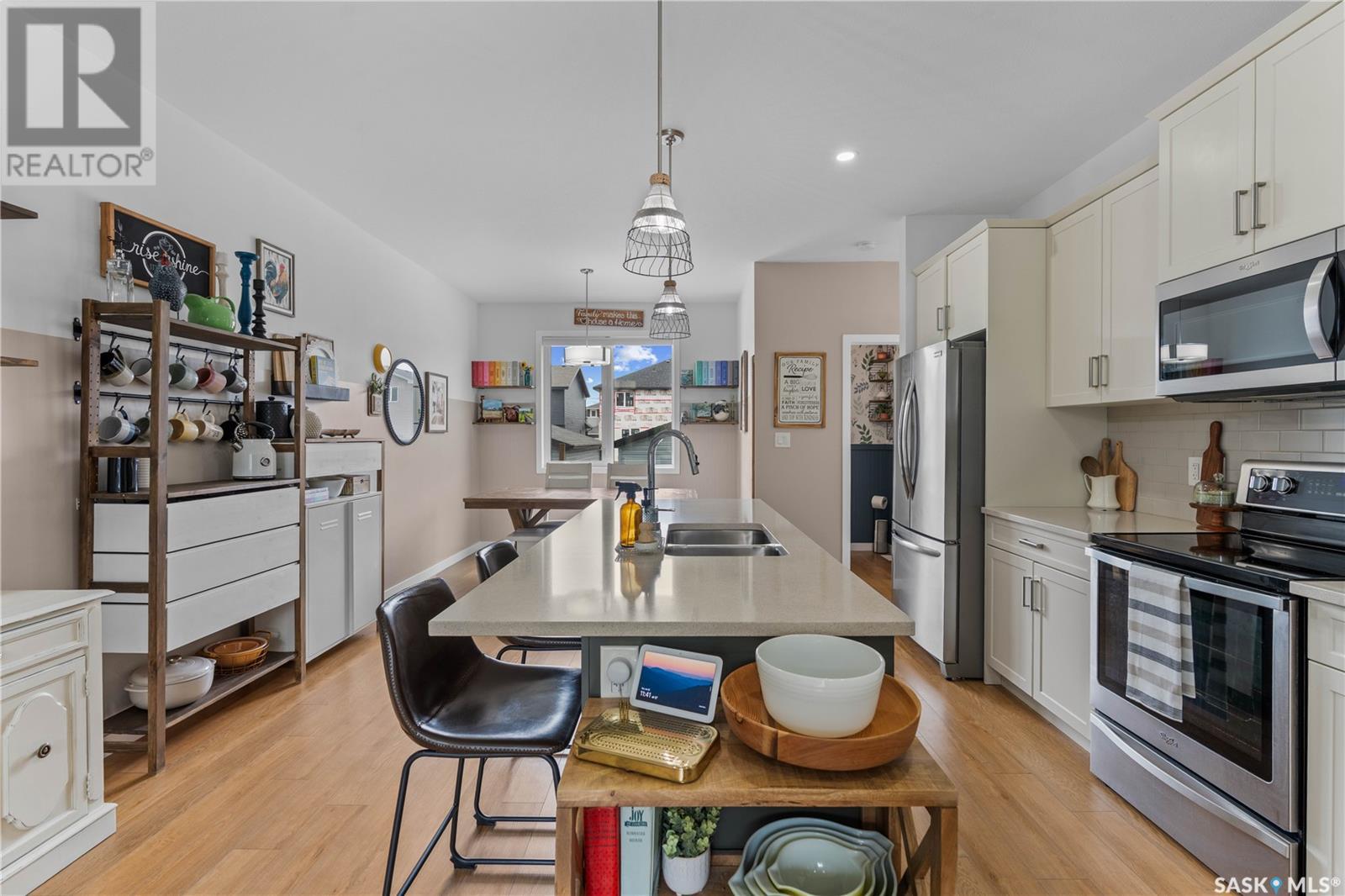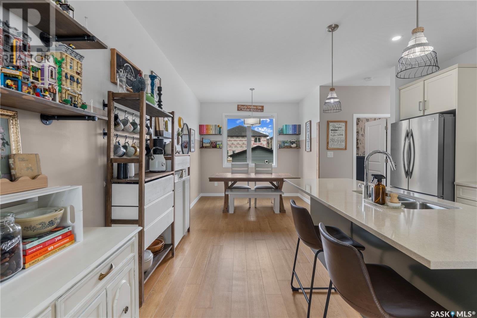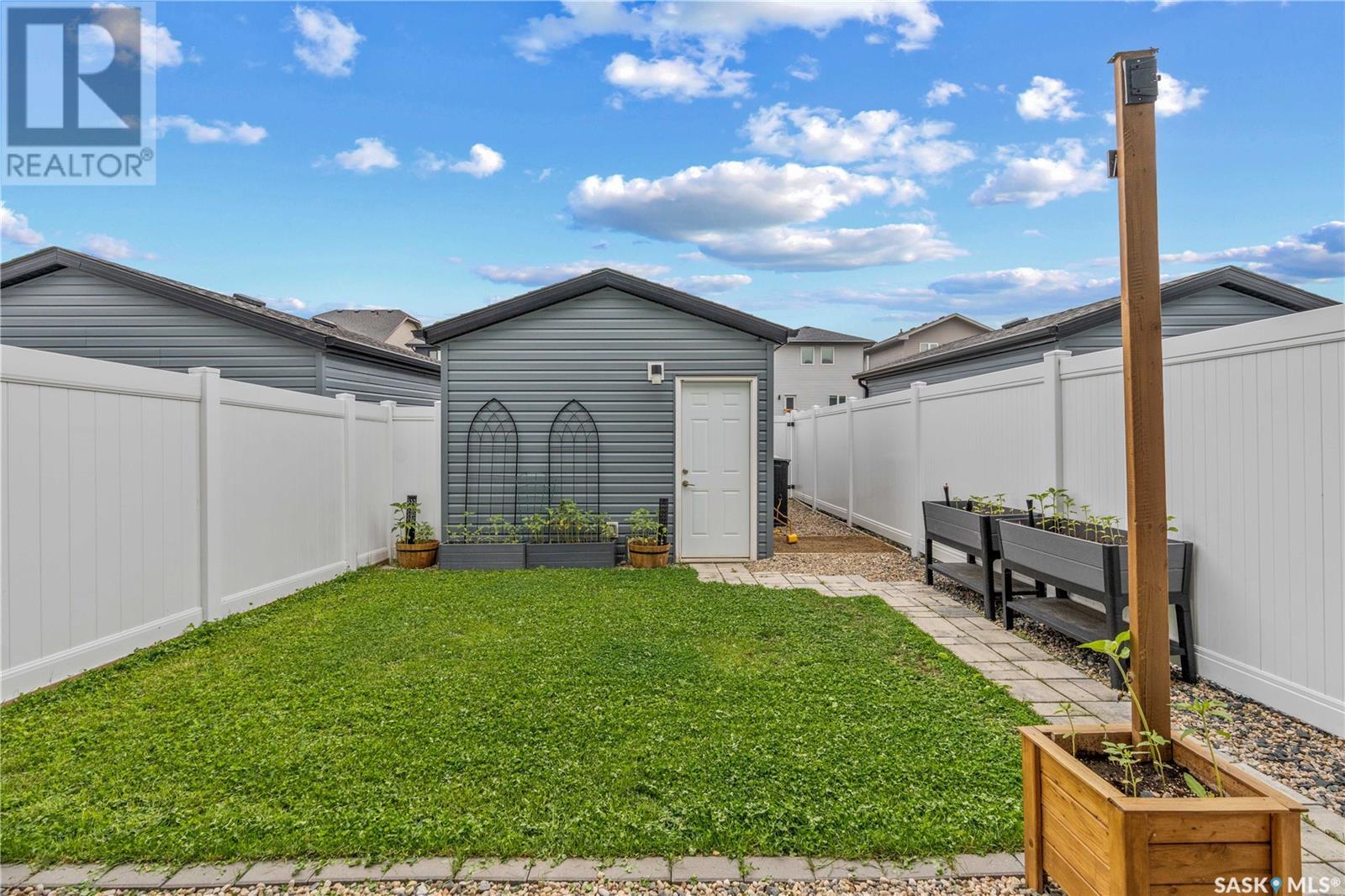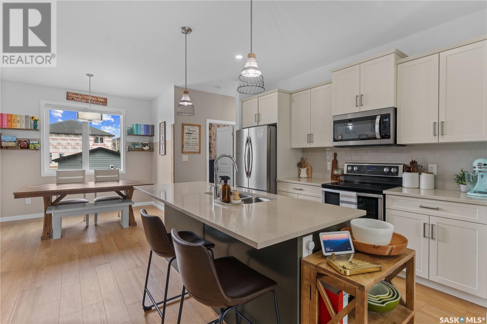 This modern 1,360 sq. ft. townhouse, built in 2021, is situated in the vibrant and family-friendly community of Eastbrook in Regina. The main floor boasts an open-concept design with 9-foot ceilings, featuring a spacious living room, a dining area, half washroom and a contemporary kitchen equipped with a sit-up island, corner pantry, stainless steel appliances, and quartz countertops. Upstairs you will find a large primary bedroom with a walk-in closet and 4-piece ensuite, two additional bedrooms, 4 piece common washroom and a laundry area. The basement is unfinished, offering potential for customization. The backyard is fully landscaped, fenced and includes a detached garage Located within walking distance to schools, parks, shopping plaza, and restaurants, and just a 2-minute drive to Costco. this home is very well kept by the homeowners, offers both comfort and convenience. (id:43042)