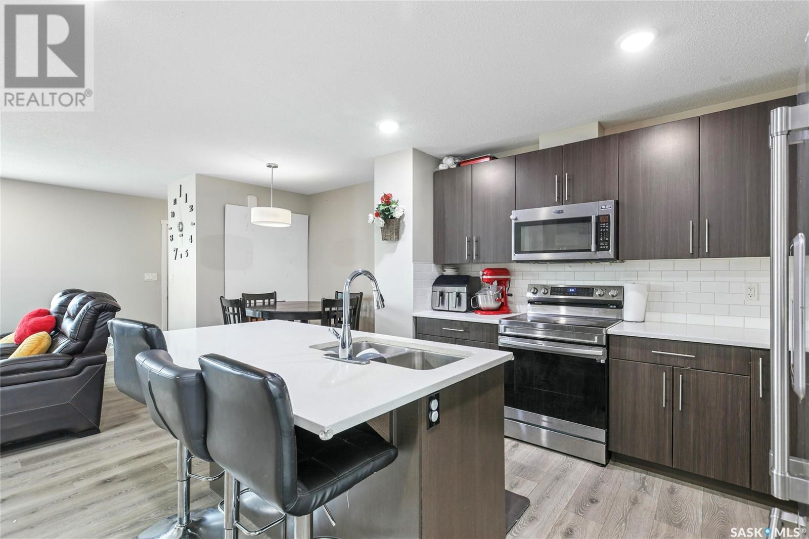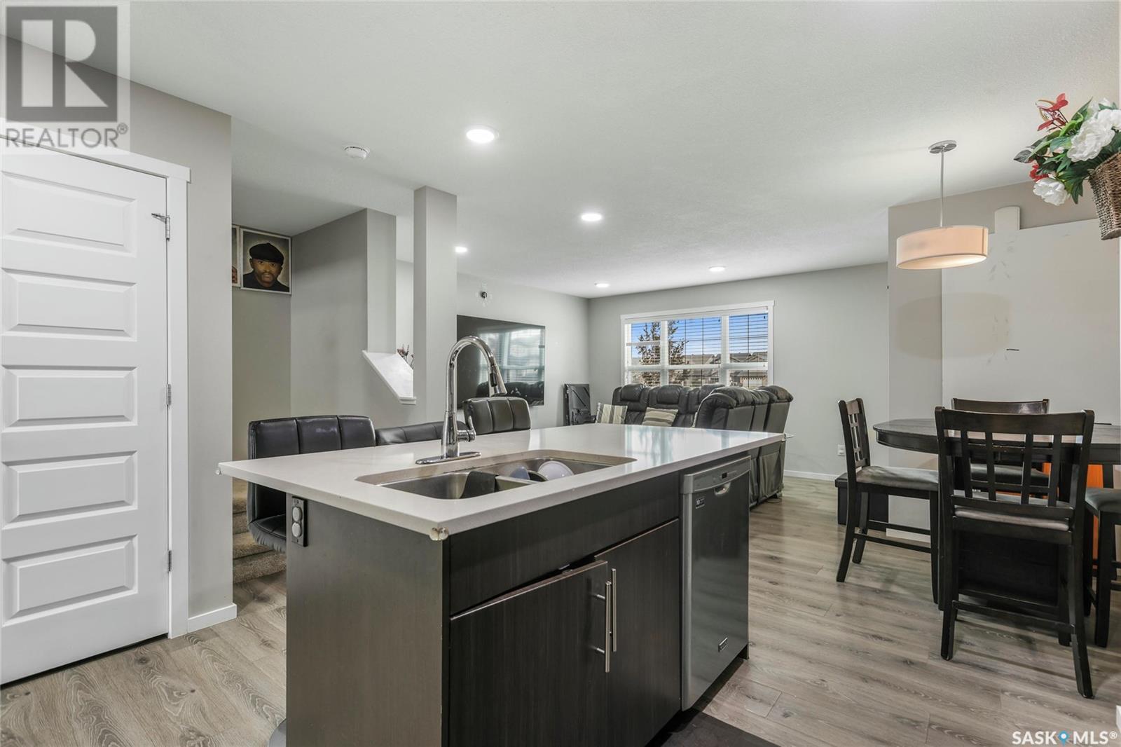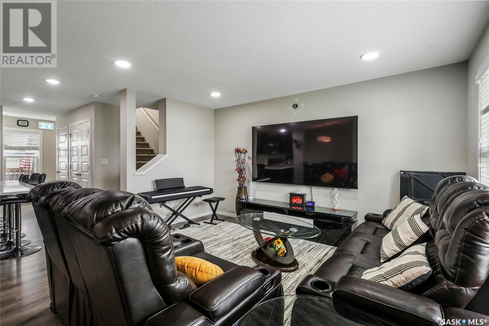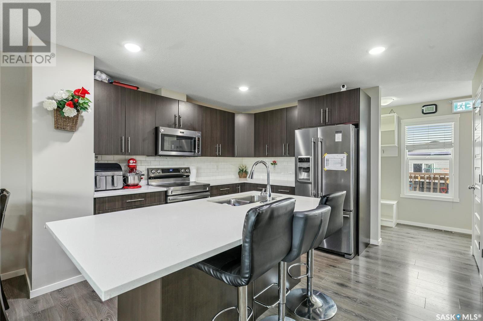 Cutely and beautifully 4 bedrooms, 4 bathrooms 2 storey townhouse located in Greens on Gardner, one of Regina's newest neighborhoods, peaceful and pride itself for diversity. This immaculate home showcase balcony that overlooks the opposite field with splendor. Upon entry, you are welcome by the modern open plan living space with recessed lighting, sizable living room and dining area, visitors washroom and a prettily kitchen fitted with quartz countertops, breakfast bar, dark brown cabinets, decorative backsplash, and stainless-steel appliances. 2nd level features hallway with carpet floors and an upstairs landing, sizable primary bedroom with 3pc en suit and walk-in closet, two good size bedrooms, 4pc bathroom complement this level. Basement level is fully finished with spacious recreational room, sizable bedroom, 3pcs bathroom, laundry room and utilities room for storage. Backyard door leads to large deck, fully graded low maintenance Xeriscape, solid durable PVC fence, and a large single detached garage. Short walking distance to schools, daycare, parks, shopping centres, restaurants, and 6 minutes drive to Costco. (id:43042)