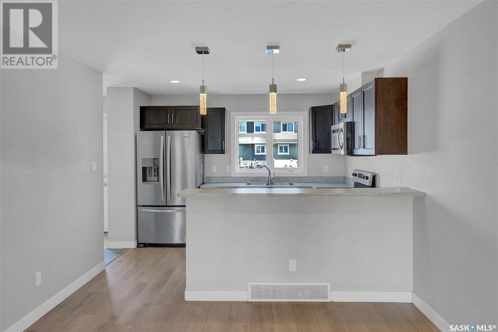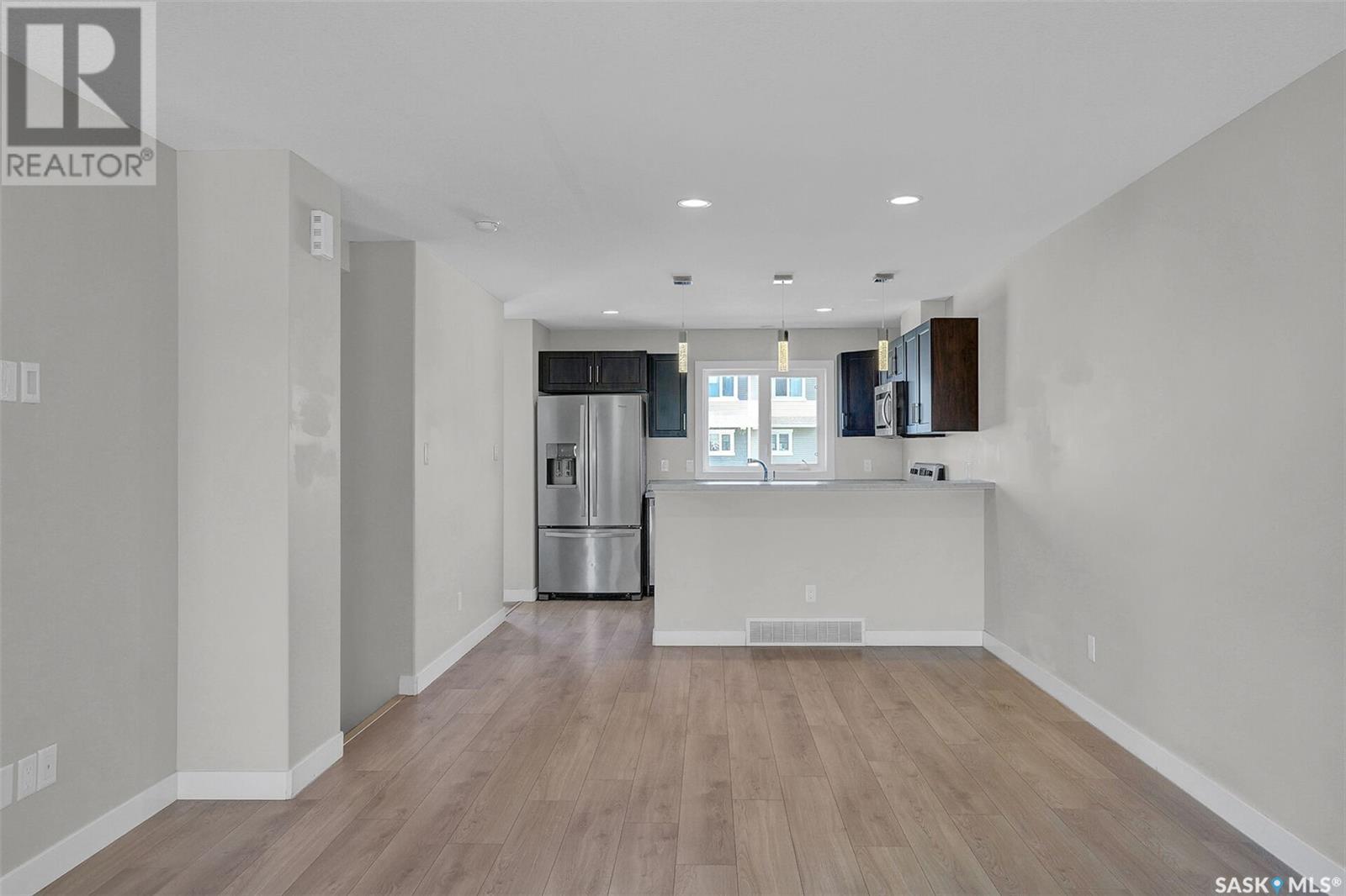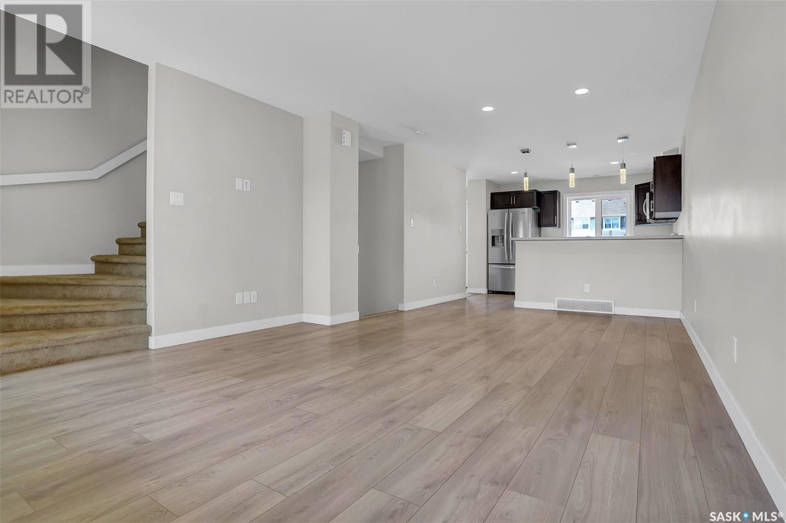 Desirable Townhouse style home (not a condo!) located in Harbour Landing with 3 bedrooms and 2 bathrooms. Quality construction built by Northridge Homes, this two storey plan offers an open concept on the main floor featuring laminate flooring in the living room that continues through to the kitchen and dining. Functional kitchen with eating bar has plenty of cabinets and countertop work-space with all appliances included. A spacious back landing leads to the back yard which is utilized as parking. A convenient powder room is found off the living room where stairs lead to the lower level which is open for development. Upstairs has 3 bedrooms and the full main bathroom. Call today to arrange your private viewing! (id:43042)