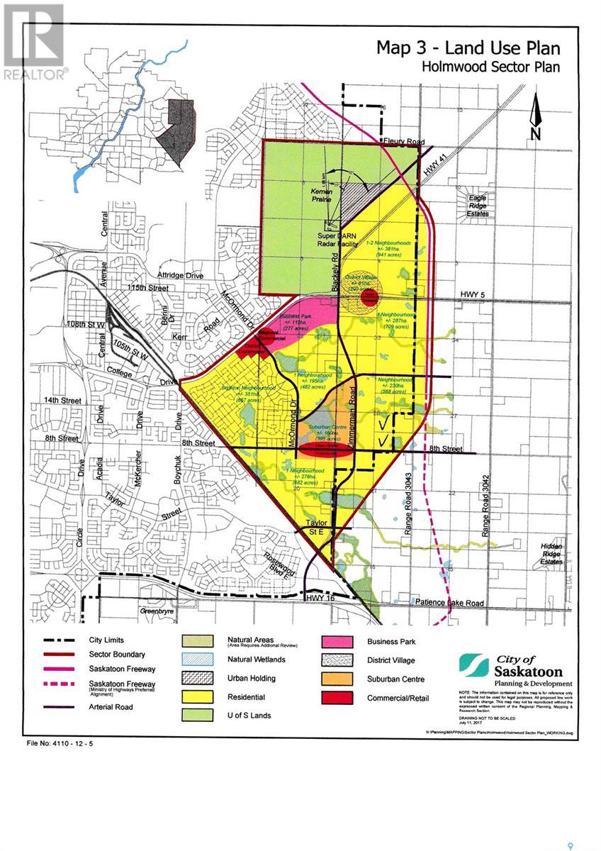 This 80 - acre parcel of land in Saskatoon is a remarkable opportunity for anyone interested in residential development. Located in the Holmwood Sector and officially designated for residential growth as part of Neighborhood 4, this property boasts a strategic position just 2 kilometers east of McOrmand Road on 8th Street East. This prime location not only ensures ease of access but also offers high visiblity, making it an attractive option for developers and investor eager to contribute to Saskatoon's dynamic growth story. This City of Saskatoon Sector Plan supports residential development in this area, adding an extra layer of crediblity and potential for future expansion. For those with a keen eye on investment, this property is ideal for both immeidate development and long - term gains. (id:43042)