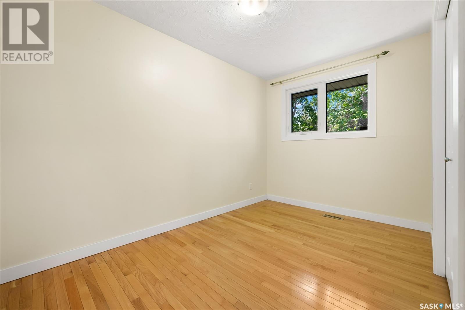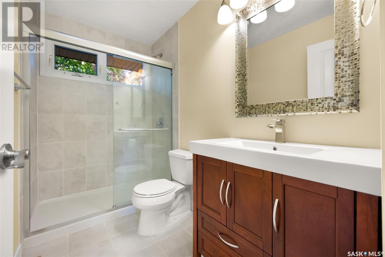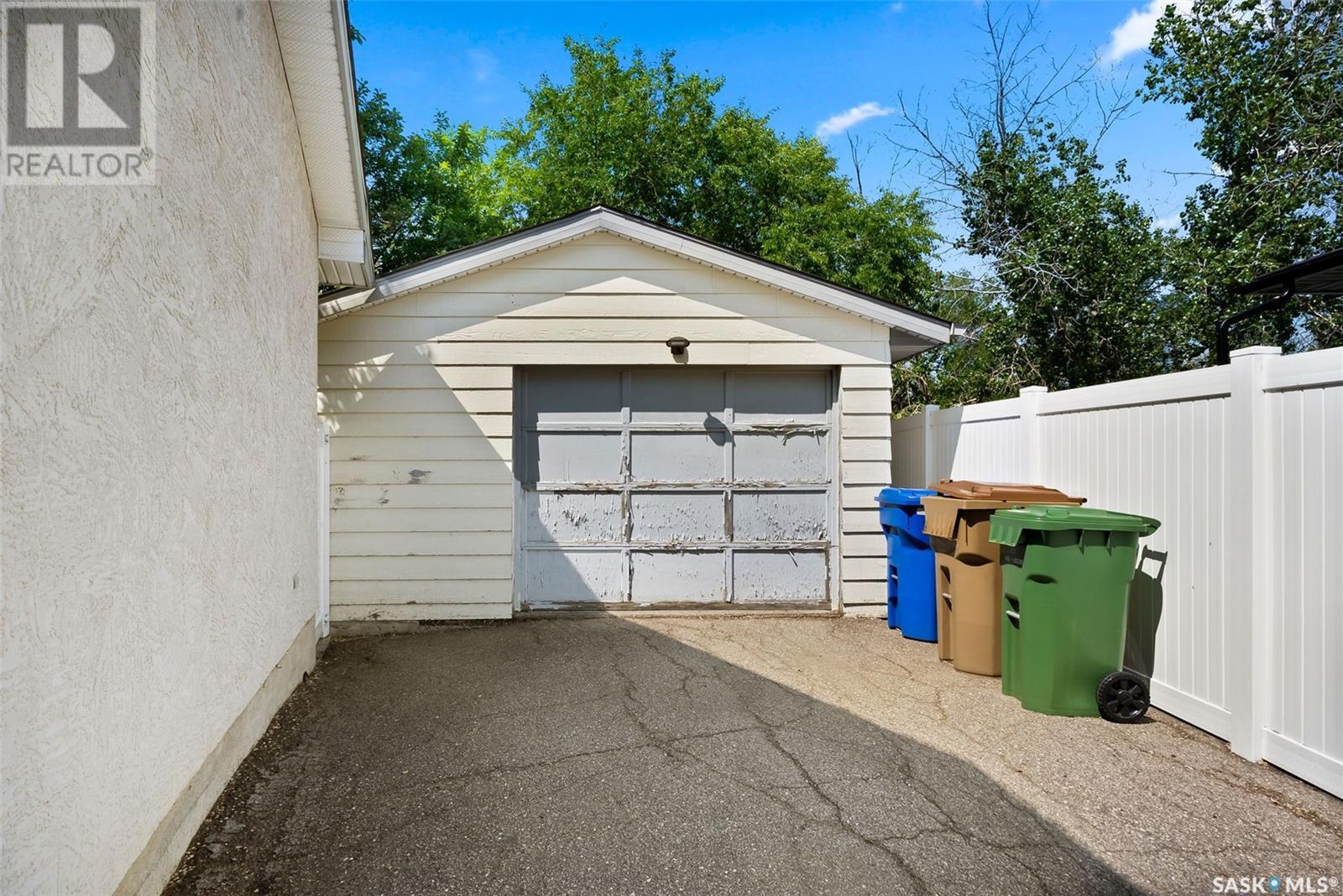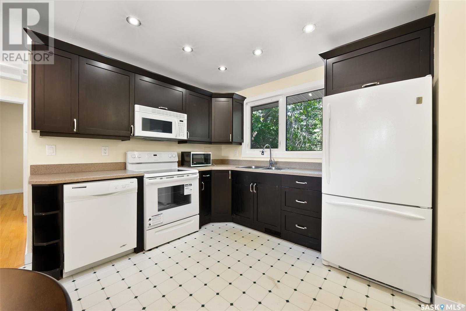 Backing a park and tucked on a quiet crescent, this solid bungalow offers a wonderful blend of updates, location, and charm — just steps from schools and east-end amenities! The main floor features newer windows and gleaming hardwood floors that flow through the bright front living room, now opened up to the stylish kitchen. You’ll love the espresso-toned maple cabinetry, generous pantry over the stairs, and included stove and built-in dishwasher. Fresh paint gives the space a clean, move-in-ready feel. Two nicely sized bedrooms and a fully renovated 3-piece bath (2016) complete the main level, showcasing a stunning tiled walk-in shower, new vanity, toilet, updated lighting, and tile flooring. Downstairs, the newer basement development offers a bright and spacious rec room with a wet bar — perfect for entertaining — along with a third bedroom and a second updated 3-piece bath with corner jetted tub. There’s also a large laundry/utility room that houses the washer and dryer and extra storage under the stairs. Outside, enjoy the privacy of the fully fenced backyard with a raised pressure-treated deck, interlocking brick firepit patio, and a garden space behind the garage. The oversized single garage includes a newer opener, and the front yard offers charming raised garden beds. Notable upgrades include new shingles on house and garage installed in 2021, newer washer, dishwasher and oven (all 2016), new DUCANE gas 2 stage high eff. Furnace installed June 2025, 60 ft of new white PVC fencing installed on the east side of the home in 2021. (id:43042)