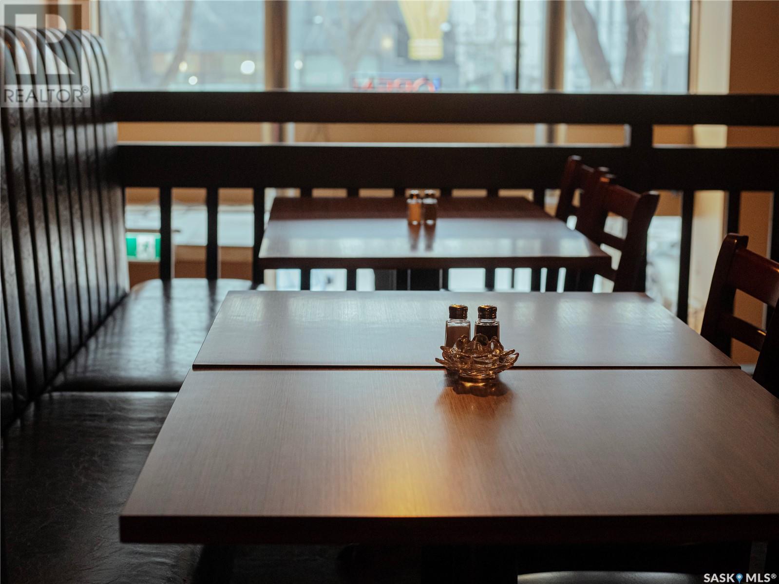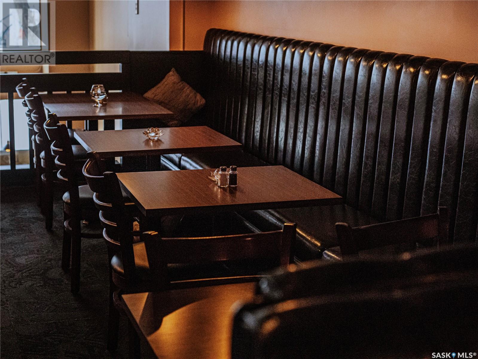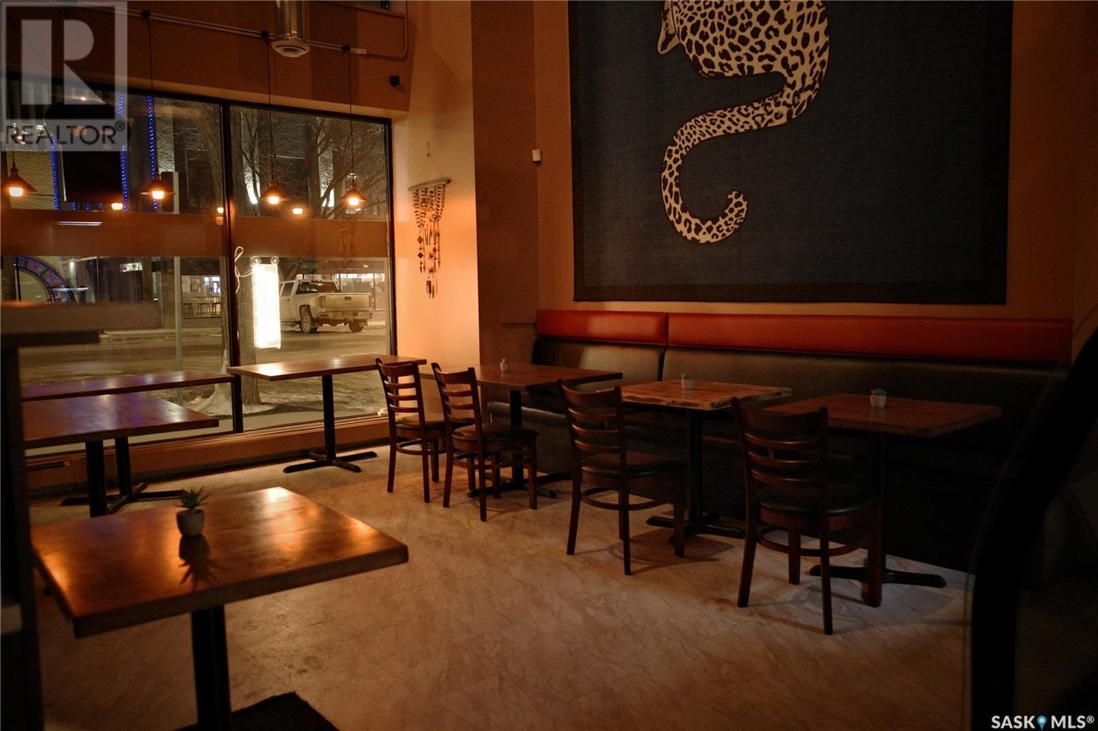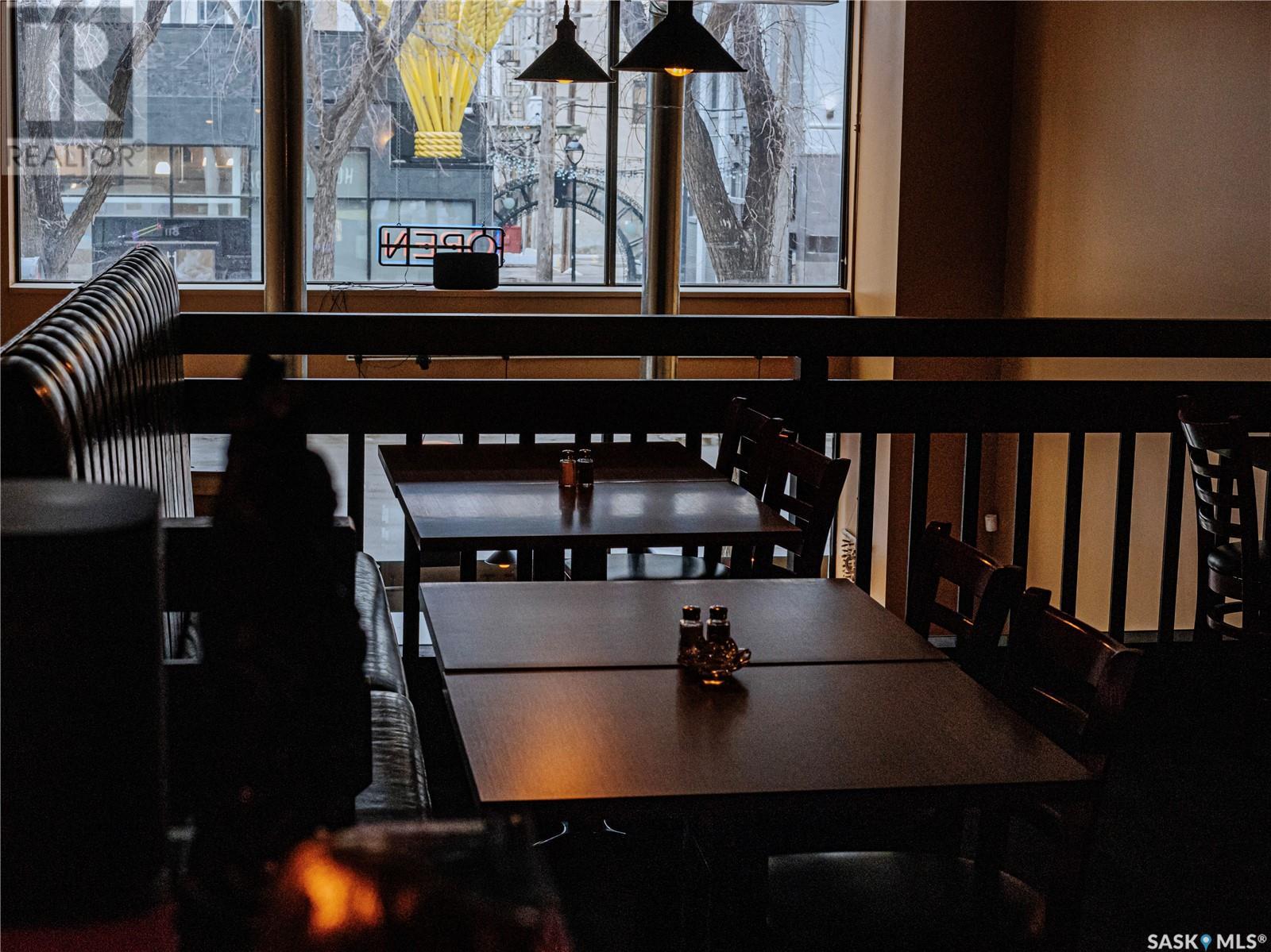 Prime restaurant location in the heart of Saskatoon ready to be taken over by an aspiring entrepreneur or experienced restaurateur. Located steps away from the busiest mall in Saskatchewan, Midtown Plaza, the heavy foot traffic around this location boasts substantial potential for any business owner. This restaurant space is a unique 2 storey unit with a maximum occupancy of 75 (from previous SLGA liquor license) with the kitchen, a stage, first dining area and one bathroom on the ground floor and a second dining area, a bar and two additional bathrooms upstairs. Beautifully renovated with high quality booths and tables upstairs. Attractive lease in place until 2031, currently $6,800/ month + utilities. (id:43042)