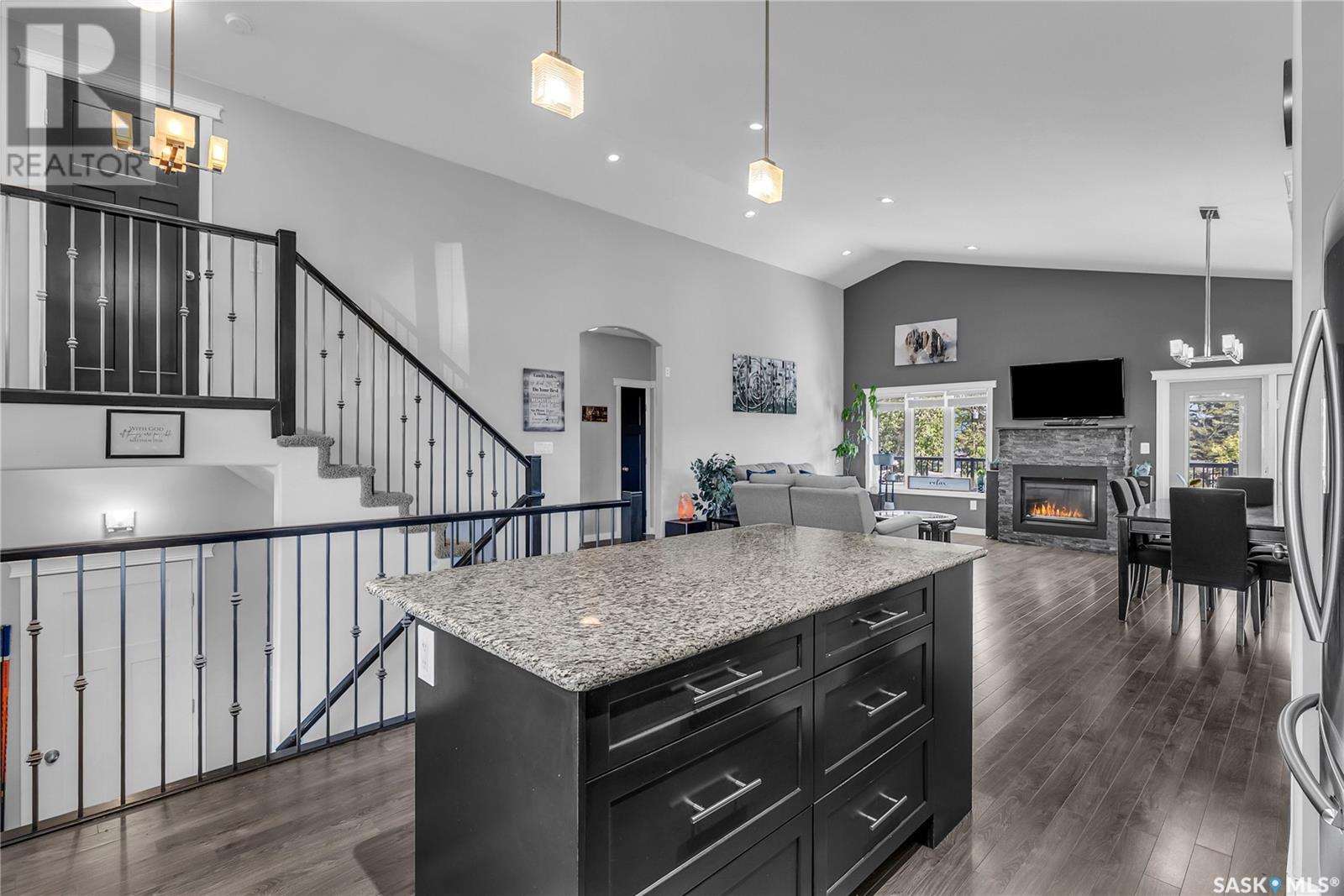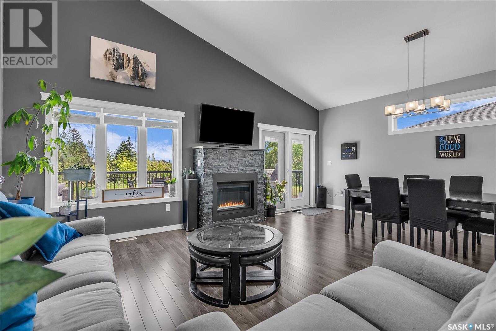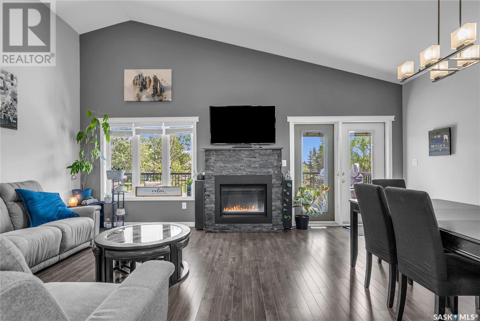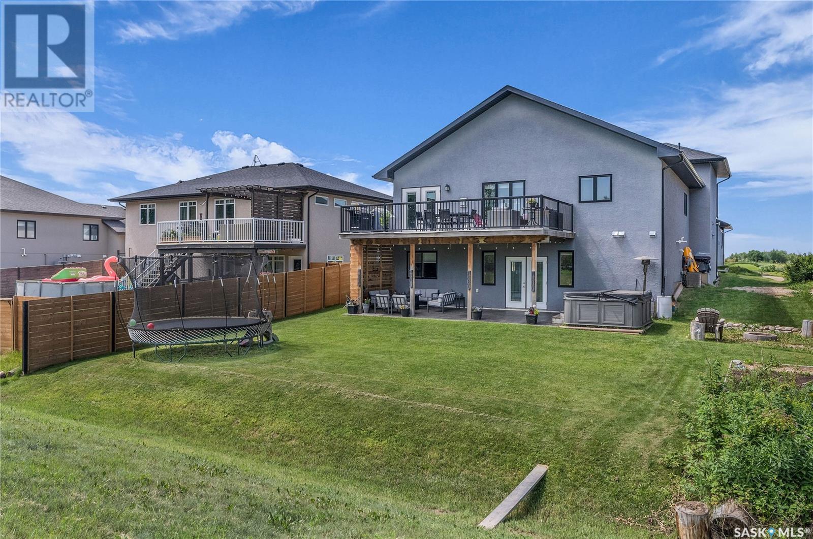 Welcome To Shields on Lake Black Blackstrap. We have a 1530 sq ft modified Bi-level with a fully finished walkout basement situated on a Cue-de-sac. Main floor features wide open floor space with with lots of window's, beautiful kitchen with granite countertops, stainless steel appliances and pantry to optimize storage, you have a large spacious family room great for entertaining and Sunday dinners, great living room with vaulted ceiling and a natural gas fire place, finishing off main floor with 2 larger bedrooms with a 4 pc bath. Moving up to the spacious primary bedroom you have with large walk in closet, his & her sinks along with an upgraded shower. Moving down to your walk out basement you have a nice wide open plan with a great Tv area for family movie nights, with lots of room to add a pool or ping pong table, 2 nice sized bedrooms, along with nice sized utility room for additional storage. Moving outside you have a nice upper deck with some golf course and lake views, the lower patio gives you some shade and will keep you outta the rain. Others features include a double heated garage, central A/C and a great sized yard with fire pit area and the hot tub is negotiable. Best part about this listing is you have Golf course, beach area, sports court, you can apply for dock space to keep your boat in the water and its only 25 mins to Saskatoon (id:43042)