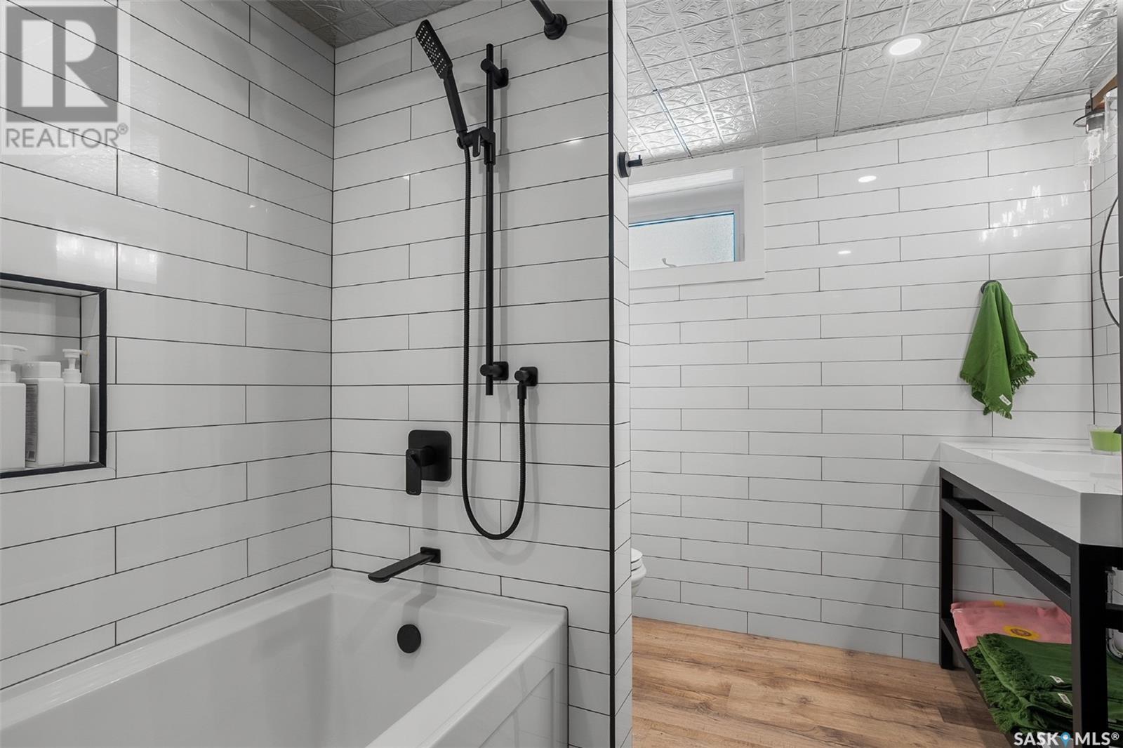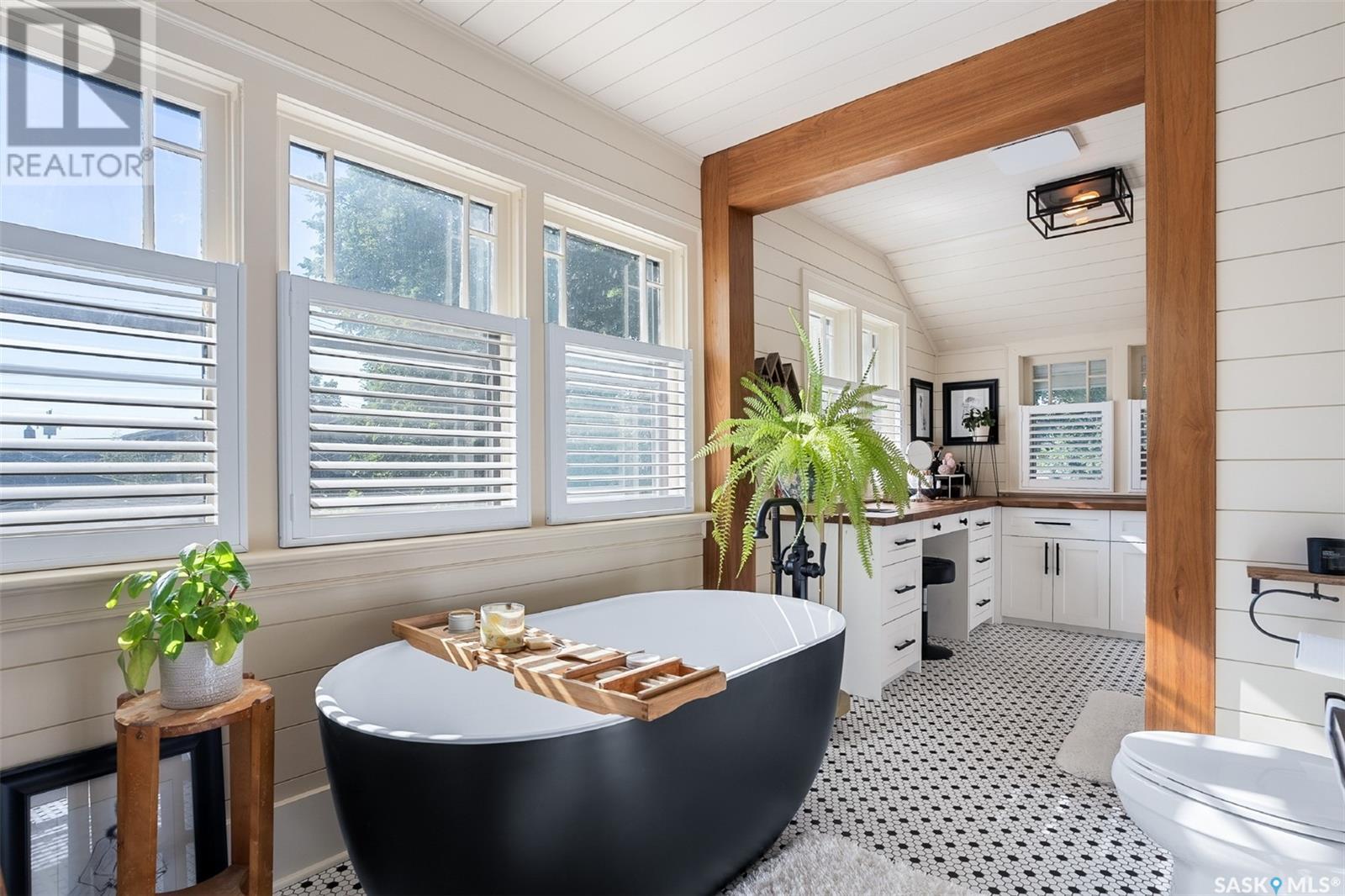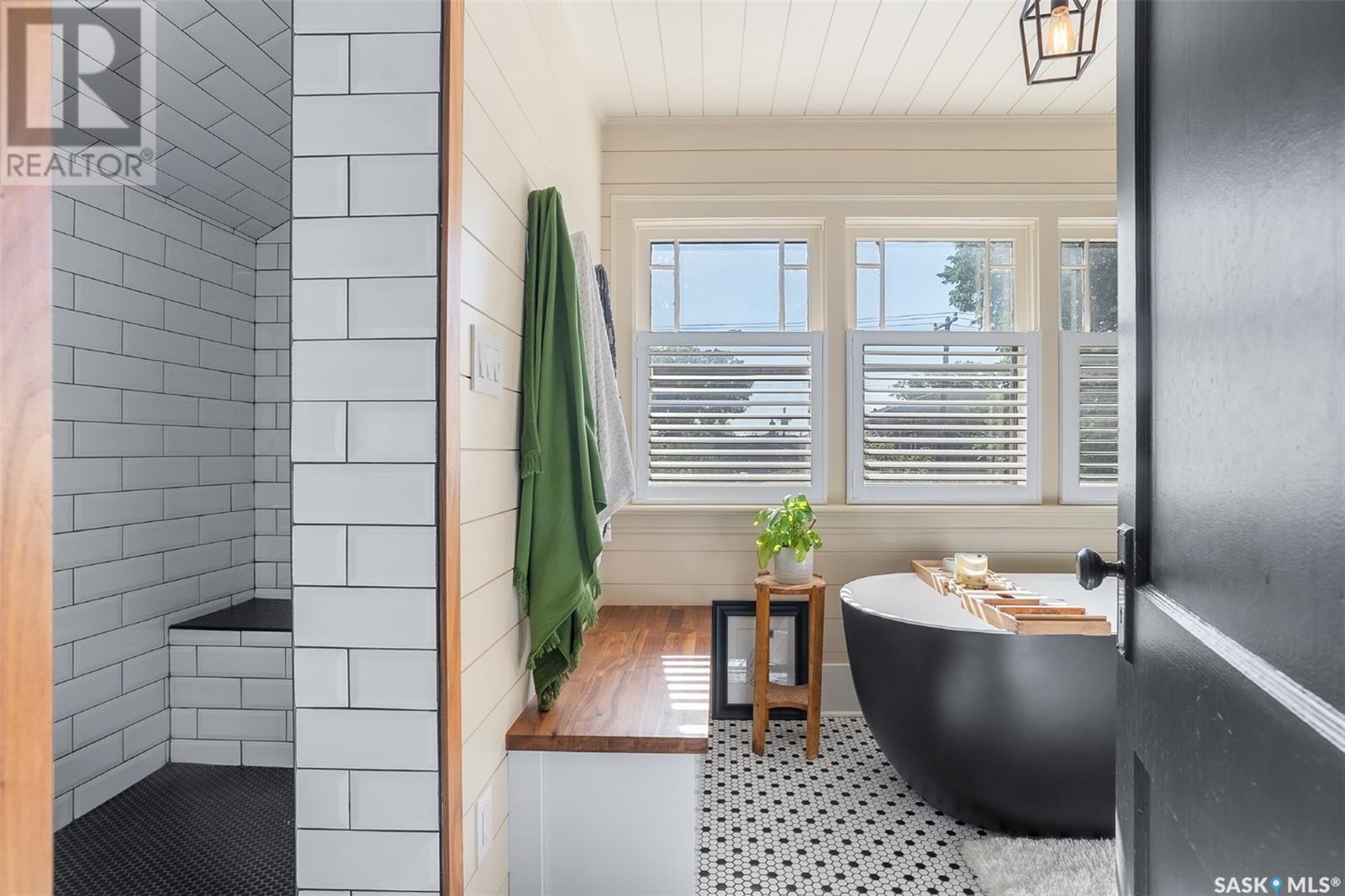 Welcome to 703 4th Avenue North—where timeless charm meets modern upgrades. This beautifully renovated two-storey home in the heart of City Park offers over 1,806 sq ft of living space with 4 bedrooms and 4 bathrooms. The main floor features hardwood and tile throughout, a cozy wood-burning fireplace in the living room, and a formal dining area perfect for entertaining. The custom kitchen blends style and function with high-end finishings. A den and 2-pc powder room complete the main level. Upstairs you'll find three spacious bedrooms, each with bathroom access. The primary suite is a true retreat, showcasing a stunning 5-piece ensuite with soaker tub, steam shower, built-in makeup vanity, and loads of natural light. The walk-in closet is equally impressive, offering ample space and organization. The fully developed basement adds even more living area with a family room, an additional bedroom and den, a 3-pc bathroom, and a stylish wet bar—ideal for guests or relaxing. There's also plenty of storage in the utility room. Extensive updates include a new furnace (2018), tankless water heater, water softener, and reverse osmosis system (2021), plus new A/C and garage heater (2023). Situated on a mature corner lot with great street parking, this property also features a massive 25' x 29' heated double detached garage—perfect for vehicles, tools, or a workshop. Just steps from City Hospital, close to the U of S and RUH, and near downtown and the river. This is a rare opportunity to own a one-of-a-kind home in one of Saskatoon's most sought-after neighborhoods. (id:43042)