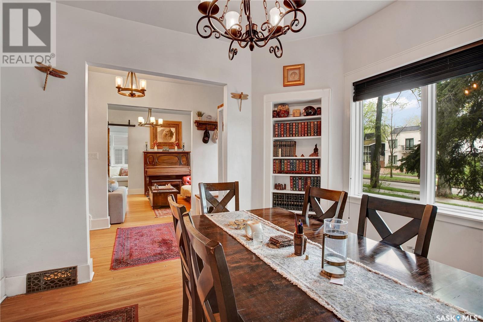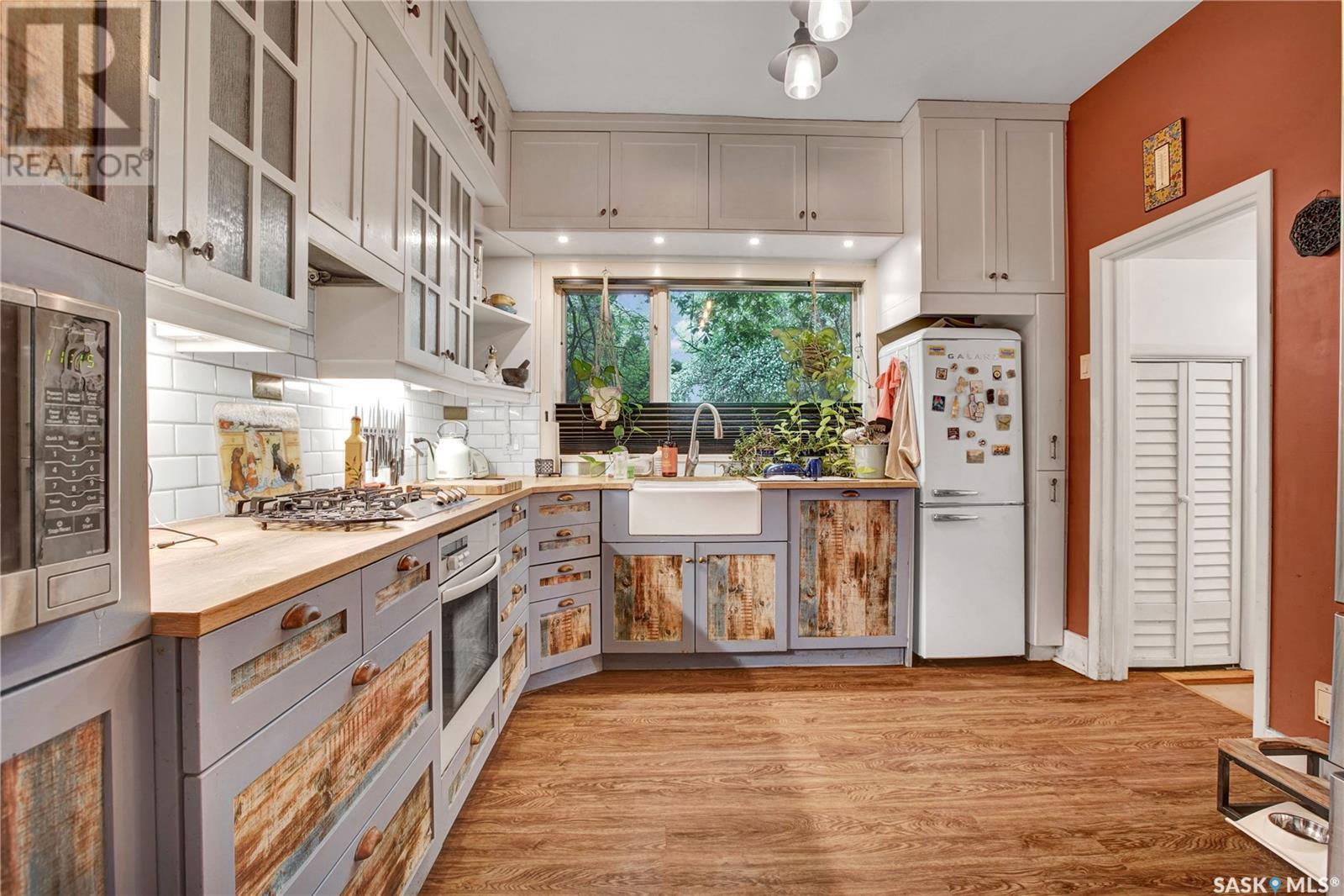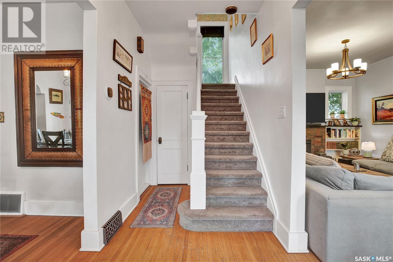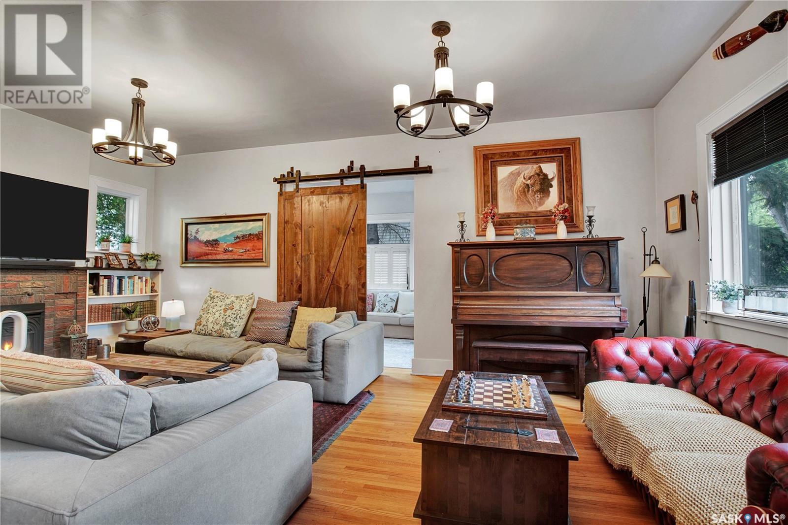 Situated in one of Saskatoon’s most sought-after neighbourhoods, this Dutch Colonial gem on historic University Drive blends timeless charm with thoughtful modern upgrades, just steps from the river. Built in 1926, the two-storey home features 4 bedrooms and 3 bathrooms, original hardwood floors, a cozy living room with fireplace, a stunning sunroom with shuttered windows, and formal dining with character-filled built-ins. The kitchen combines vintage appeal with modern function, featuring a Miele gas cooktop and oven, smart fridge-freezer, farmhouse sink, and garden views. Upstairs offers two secondary bedrooms, a 4-piece bath, and a spacious primary suite with a newly added shower room. The lower level includes a stylish rec room, guest bedroom, updated bathroom, and laundry with a high-end smart washer and dryer. Additional upgrades include a high-efficiency furnace & newer on-demand water heater. Delight in the expansive, tree-lined backyard—complete with a detached garage, additional parking, garden furniture, and bbq w/ gas hookup—offering a seamless blend of comfort and outdoor charm. This exceptional Nutana residence boasts unparalleled walkability to Broadway Avenue’s vibrant boutiques and cafes, as well as the scenic river trails. (id:43042)