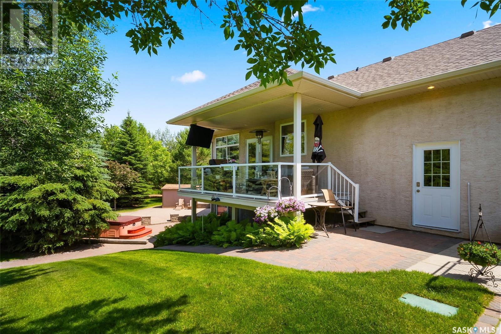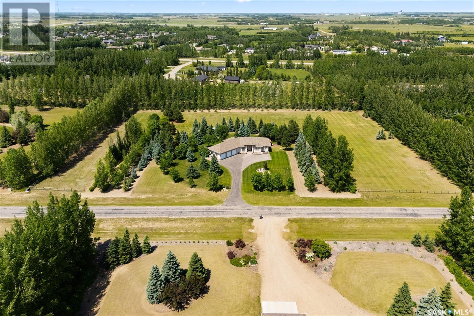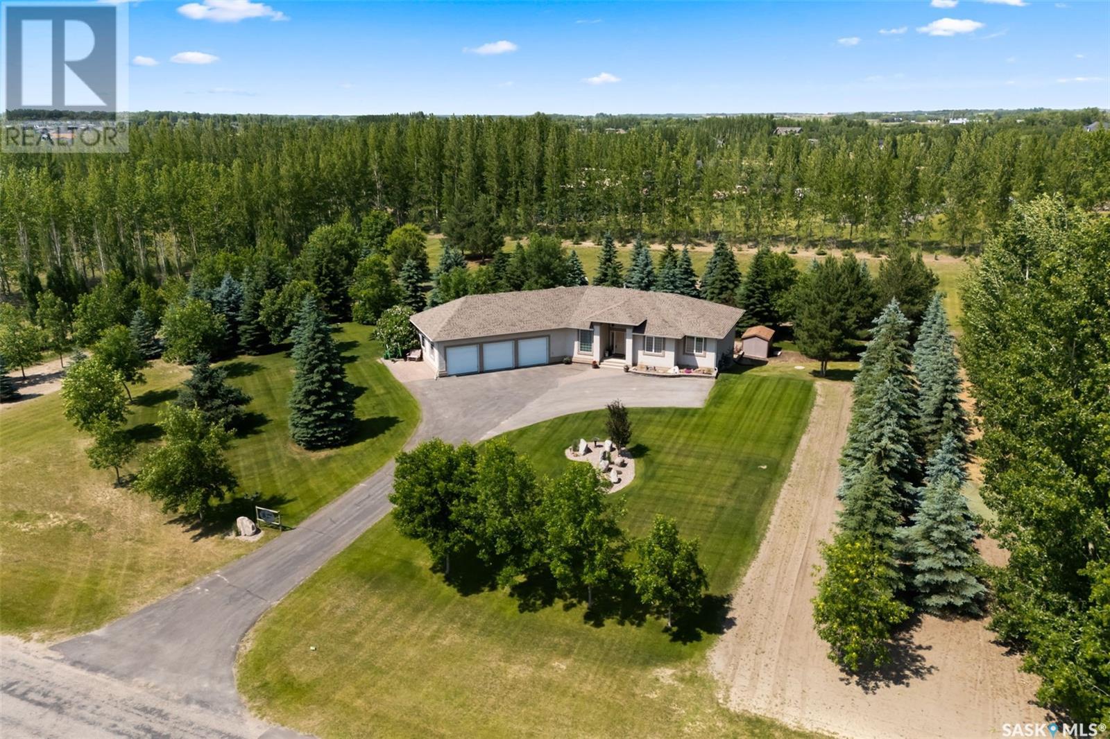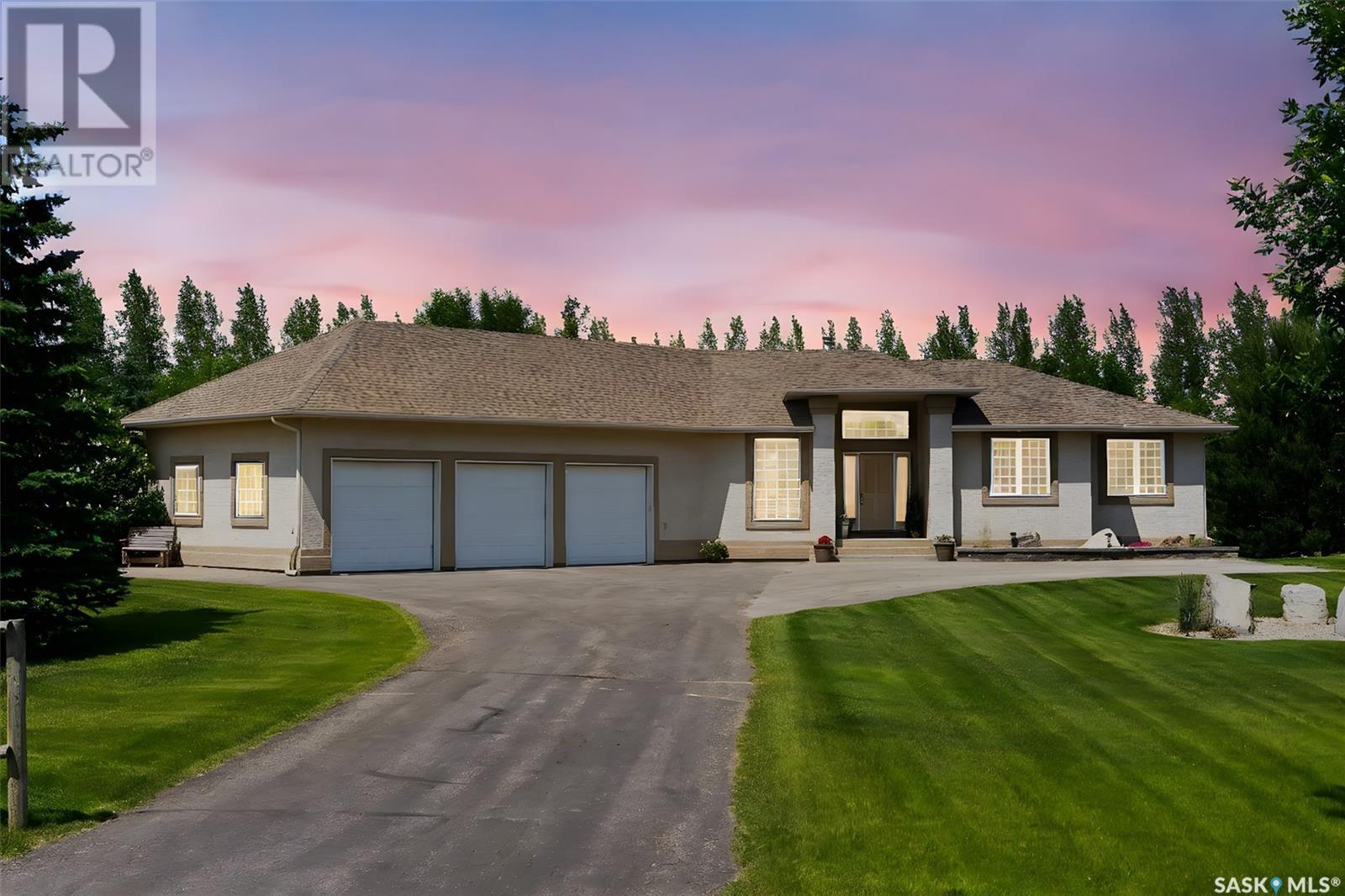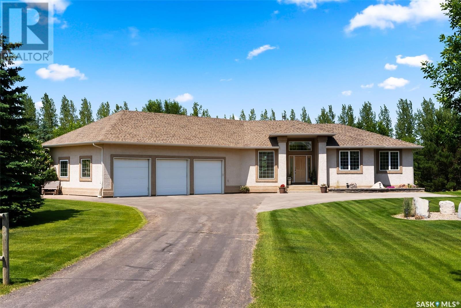Welcome to 8 Jaxon Road - a stunning walkout bungalow nestled on 4.99 acres of park-like paradise, right on the edge of White City. Pride of ownership is evident in every inch of this meticulously maintained property, lovingly cared for by the original owners over the past 20 years. Just a short drive from Regina, this home offers the best of both worlds - quiet country living with city convenience. Step into the spacious foyer, where a beautiful two-sided gas fireplace greets you and connects the entryway to the sun-filled living room. Enjoy views of your private, tree-lined yard through oversized windows, and cozy up in the living room with built-ins and a hidden TV. The open-concept main floor flows seamlessly into the dining room and kitchen, featuring granite countertops, a corner pantry, ample cabinetry, and a full stainless steel appliance package. The main level also boasts a large primary suite with a walk-in closet and ensuite, two additional bedrooms, a full 4pc bathroom, and a clever laundry chute leading to the lower level. Downstairs, the bright walkout basement with in-floor heat offers a massive rec room complete with a wet bar, perfect for entertaining! You’ll also find two more bedrooms, an additional bathroom, a large laundry room with built-in cabinets and ironing board, and a mechanical/storage room. A mudroom with custom lockers leads into the dream garage—an oversized triple with its own bathroom and a sports locker room ideal for hockey gear or outdoor toys. Step outside to your own private park-like yard. Enjoy the covered deck, sprawling lawn, concrete patio with built-in fire pit, and wired 220V service ready for a hot tub. Underground sprinklers and three yard hydrants (fed by an 85-foot well) make caring for the lush landscape easy, while the home itself is connected to town water. This incredible acreage offers space, privacy, and the comfort of thoughtful design—ready for a new family to love it as much as the current one has. (id:43042)