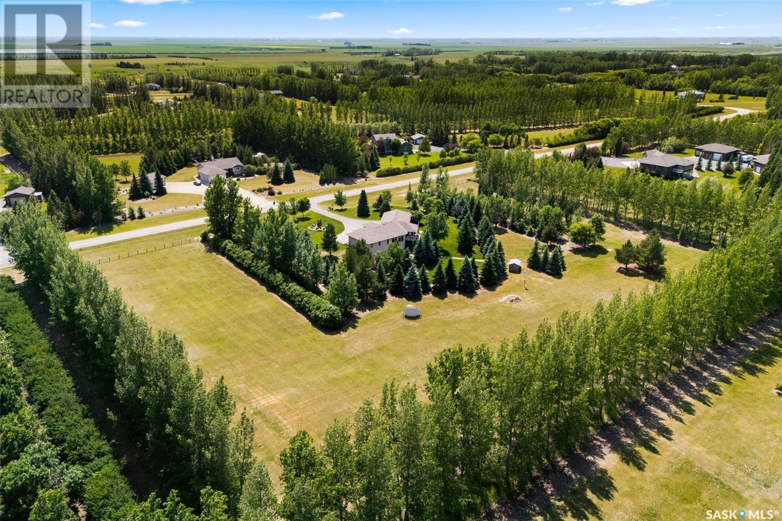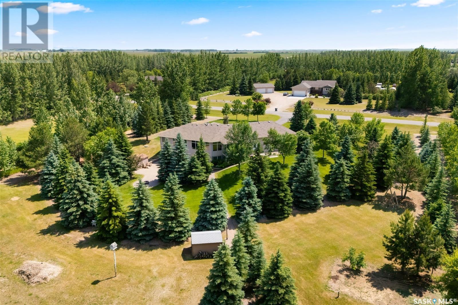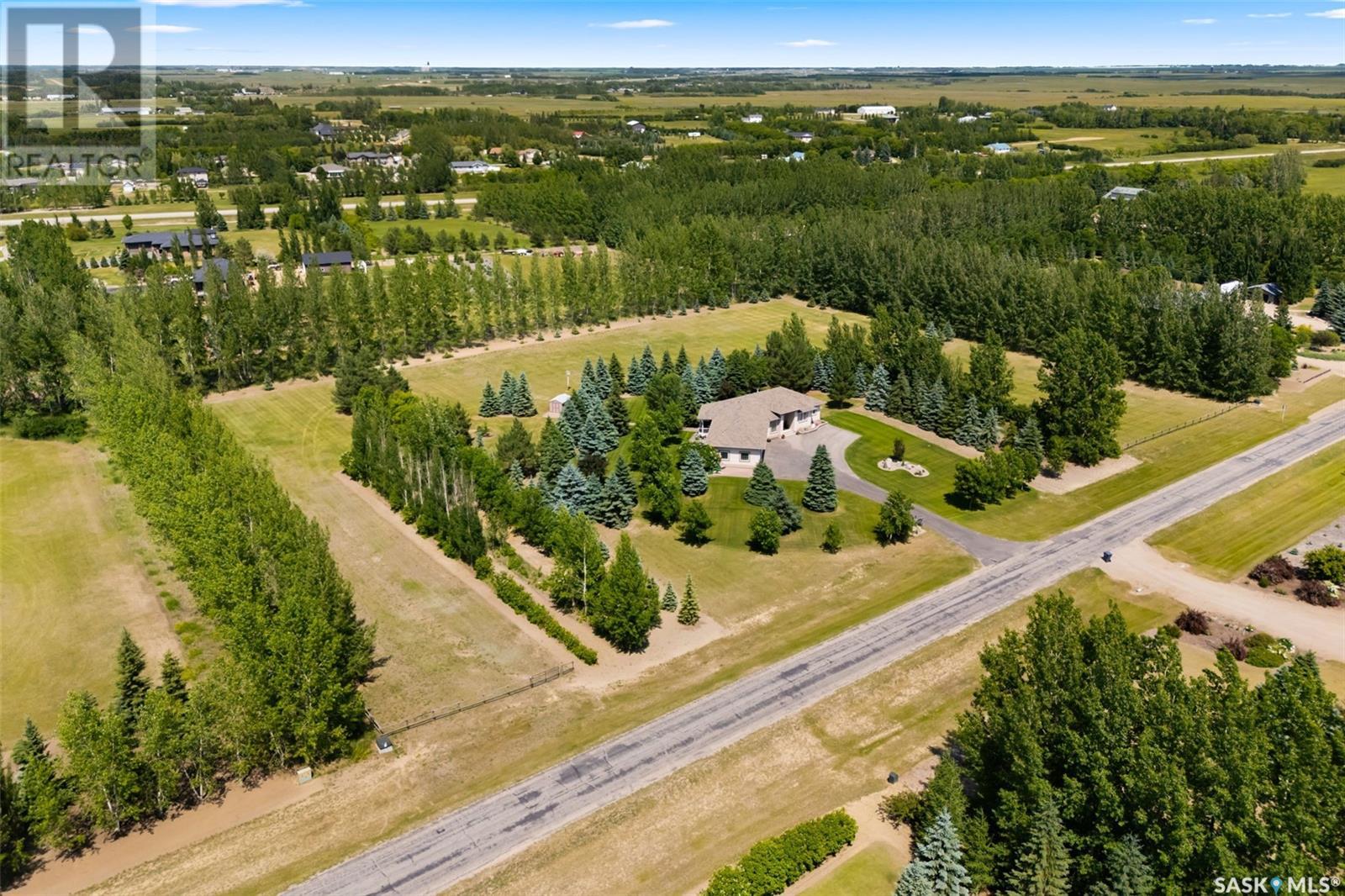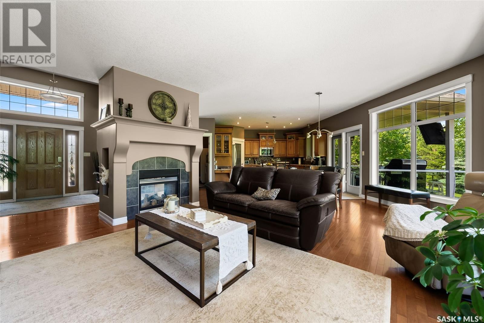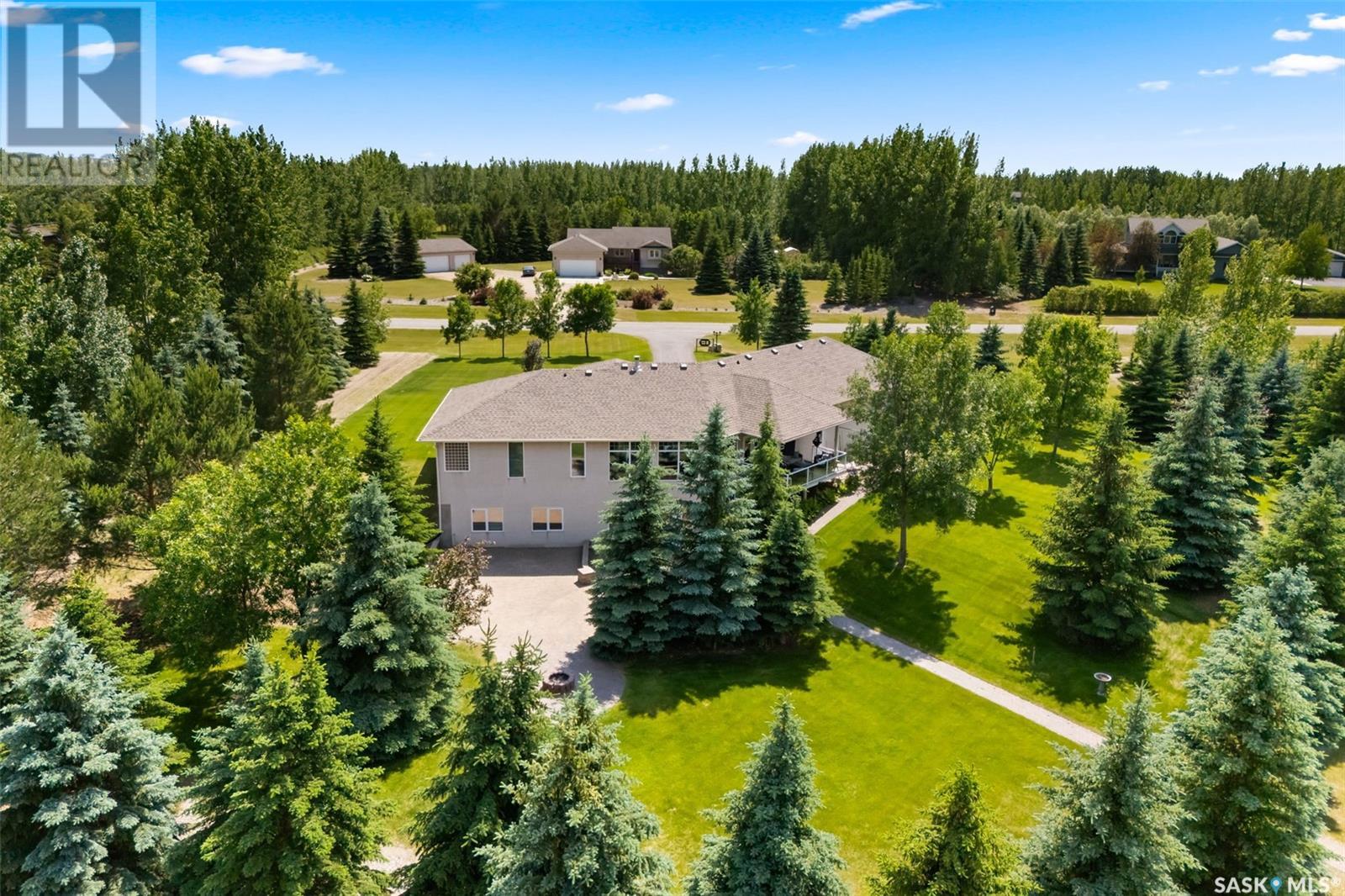Welcome to 8 Jaxon Road - a stunning walkout bungalow nestled on 4.99 acres of park-like paradise, right on the edge of White City. Pride of ownership is evident in every inch of this meticulously maintained property, lovingly cared for by the original owners over the past 20 years. Just a short drive from Regina, this home offers the best of both worlds - quiet country living with city convenience. Step into the spacious foyer, where a beautiful two-sided gas fireplace greets you and connects the entryway to the sun-filled living room. Enjoy views of your private, tree-lined yard through oversized windows, and cozy up in the living room with built-ins and a hidden TV. The open-concept main floor flows seamlessly into the dining room and kitchen, featuring granite countertops, a corner pantry, ample cabinetry, and a full stainless steel appliance package. The main level also boasts a large primary suite with a walk-in closet and ensuite, two additional bedrooms, a full 4pc bathroom, and a clever laundry chute leading to the lower level. Downstairs, the bright walkout basement with in-floor heat offers a massive rec room complete with a wet bar, perfect for entertaining! You’ll also find two more bedrooms, an additional bathroom, a large laundry room with built-in cabinets and ironing board, and a mechanical/storage room. A mudroom with custom lockers leads into the dream garage—an oversized triple with its own bathroom and a sports locker room ideal for hockey gear or outdoor toys. Step outside to your own private park-like yard. Enjoy the covered deck, sprawling lawn, concrete patio with built-in fire pit, and wired 220V service ready for a hot tub. Underground sprinklers and three yard hydrants (fed by an 85-foot well) make caring for the lush landscape easy, while the home itself is connected to town water. This incredible acreage offers space, privacy, and the comfort of thoughtful design—ready for a new family to love it as much as the current one has. (id:43042)