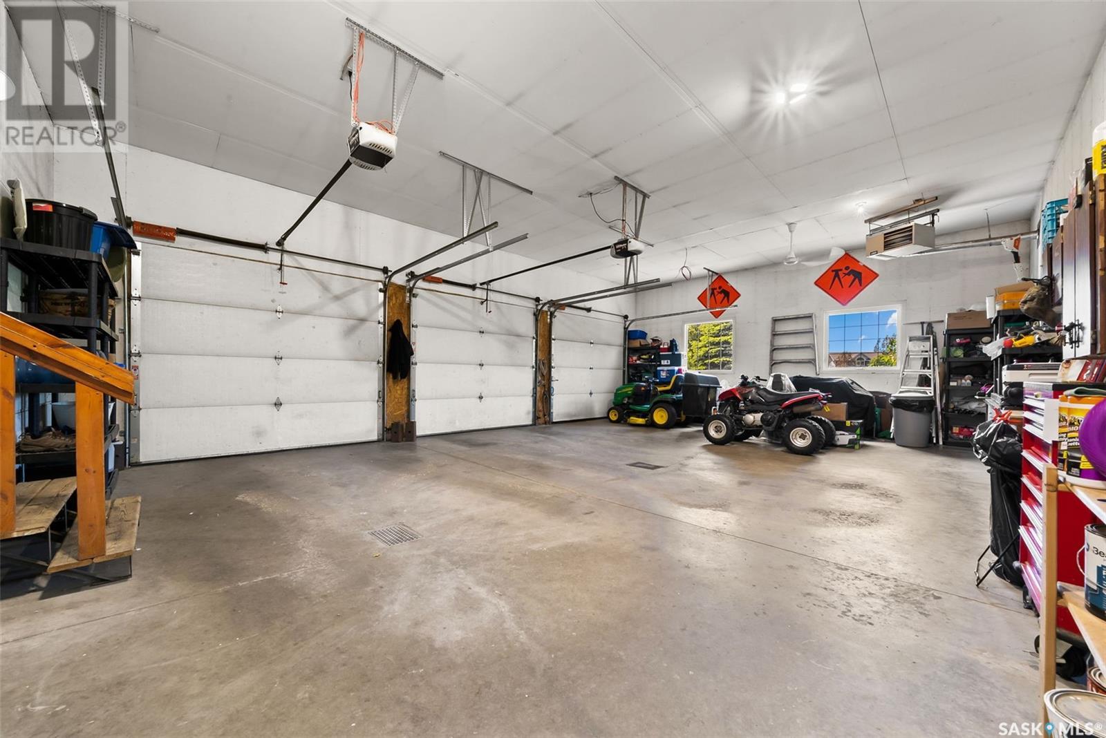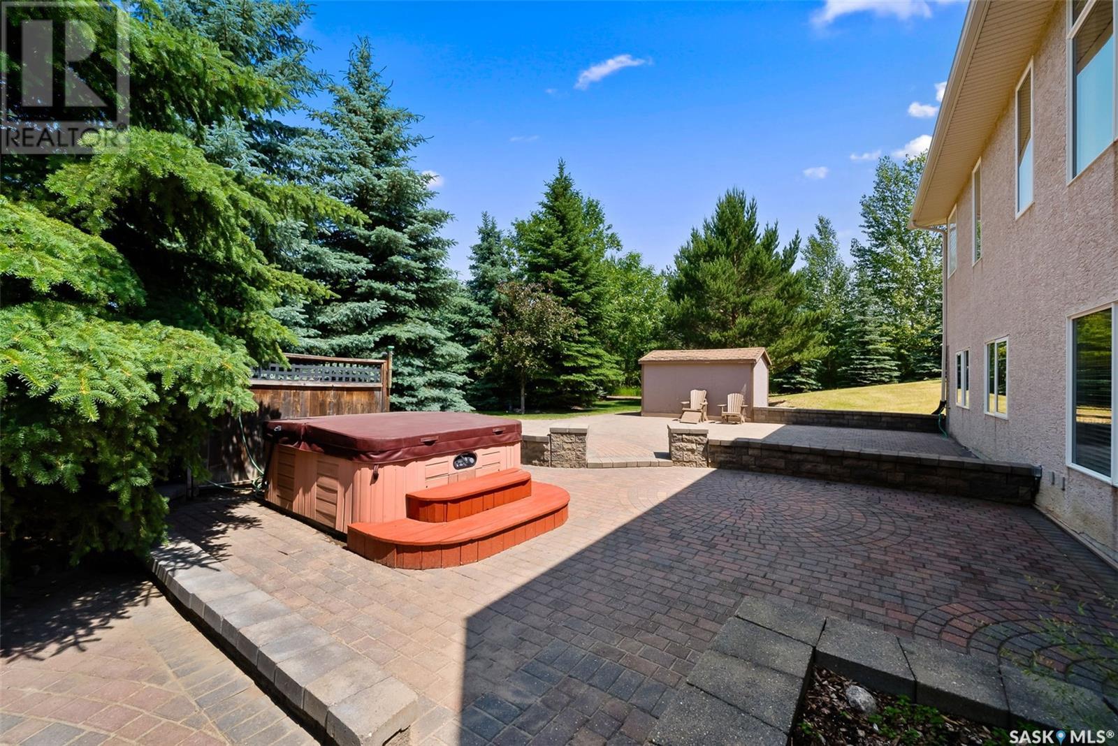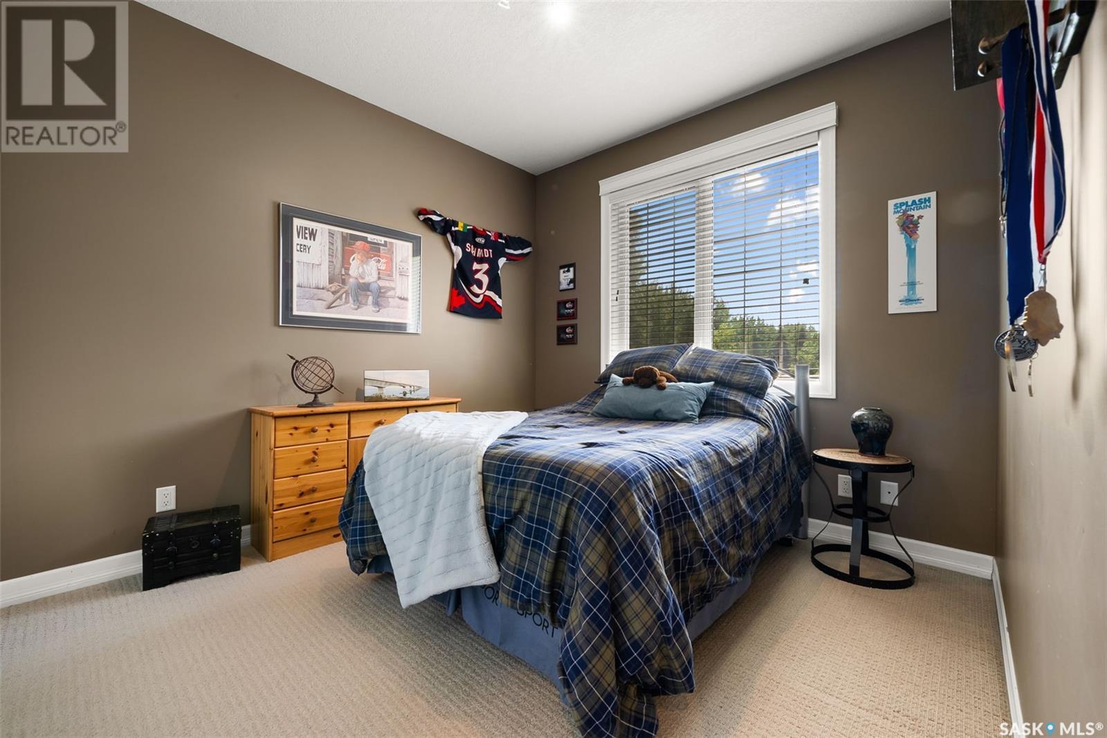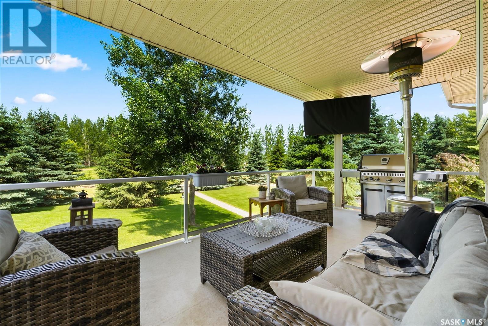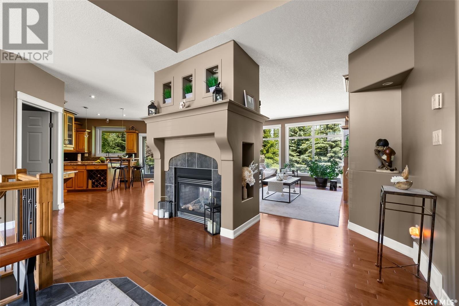 Welcome to 8 Jaxon Road - a stunning walkout bungalow nestled on 4.99 acres of park-like paradise, right on the edge of White City. Pride of ownership is evident in every inch of this meticulously maintained property, lovingly cared for by the original owners over the past 20 years. Just a short drive from Regina, this home offers the best of both worlds - quiet country living with city convenience. Step into the spacious foyer, where a beautiful two-sided gas fireplace greets you and connects the entryway to the sun-filled living room. Enjoy views of your private, tree-lined yard through oversized windows, and cozy up in the living room with built-ins and a hidden TV. The open-concept main floor flows seamlessly into the dining room and kitchen, featuring granite countertops, a corner pantry, ample cabinetry, and a full stainless steel appliance package. The main level also boasts a large primary suite with a walk-in closet and ensuite, two additional bedrooms, a full 4pc bathroom, and a clever laundry chute leading to the lower level. Downstairs, the bright walkout basement with in-floor heat offers a massive rec room complete with a wet bar, perfect for entertaining! You’ll also find two more bedrooms, an additional bathroom, a large laundry room with built-in cabinets and ironing board, and a mechanical/storage room. A mudroom with custom lockers leads into the dream garage—an oversized triple with its own bathroom and a sports locker room ideal for hockey gear or outdoor toys. Step outside to your own private park-like yard. Enjoy the covered deck, sprawling lawn, concrete patio with built-in fire pit, and wired 220V service ready for a hot tub. Underground sprinklers and three yard hydrants (fed by an 85-foot well) make caring for the lush landscape easy, while the home itself is connected to town water. This incredible acreage offers space, privacy, and the comfort of thoughtful design—ready for a new family to love it as much as the current one has. (id:43042)