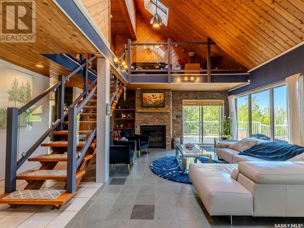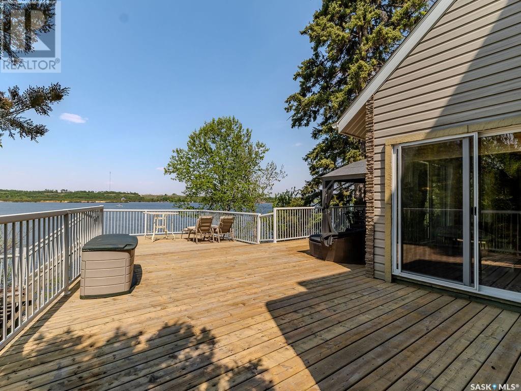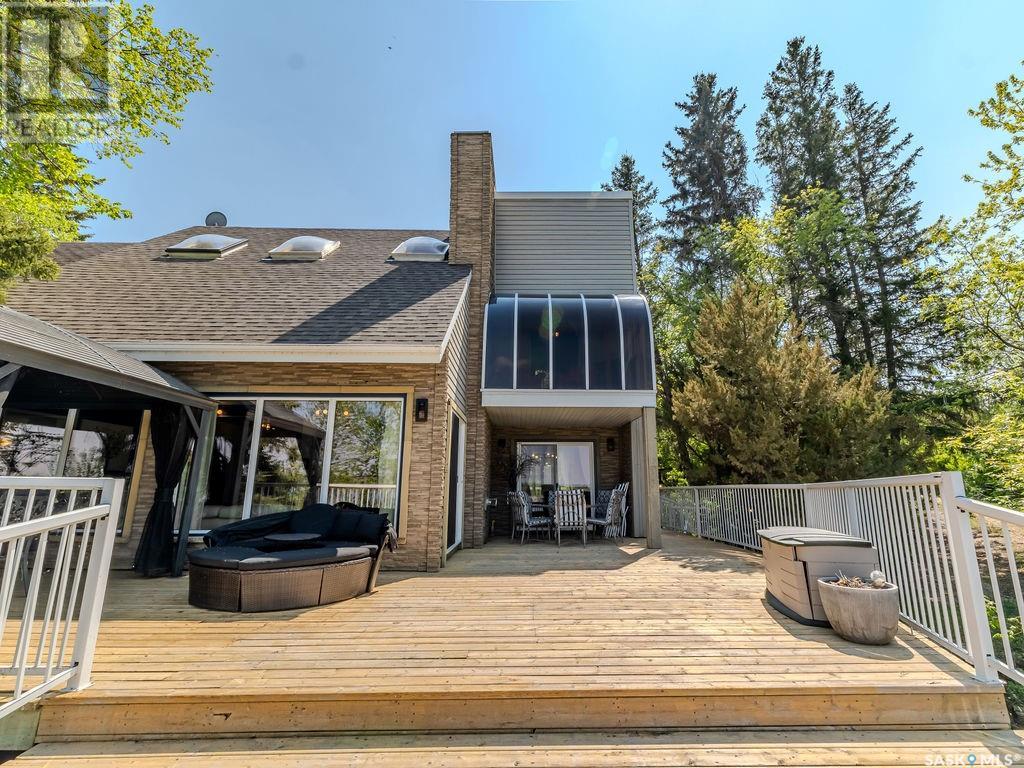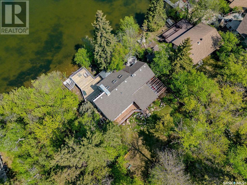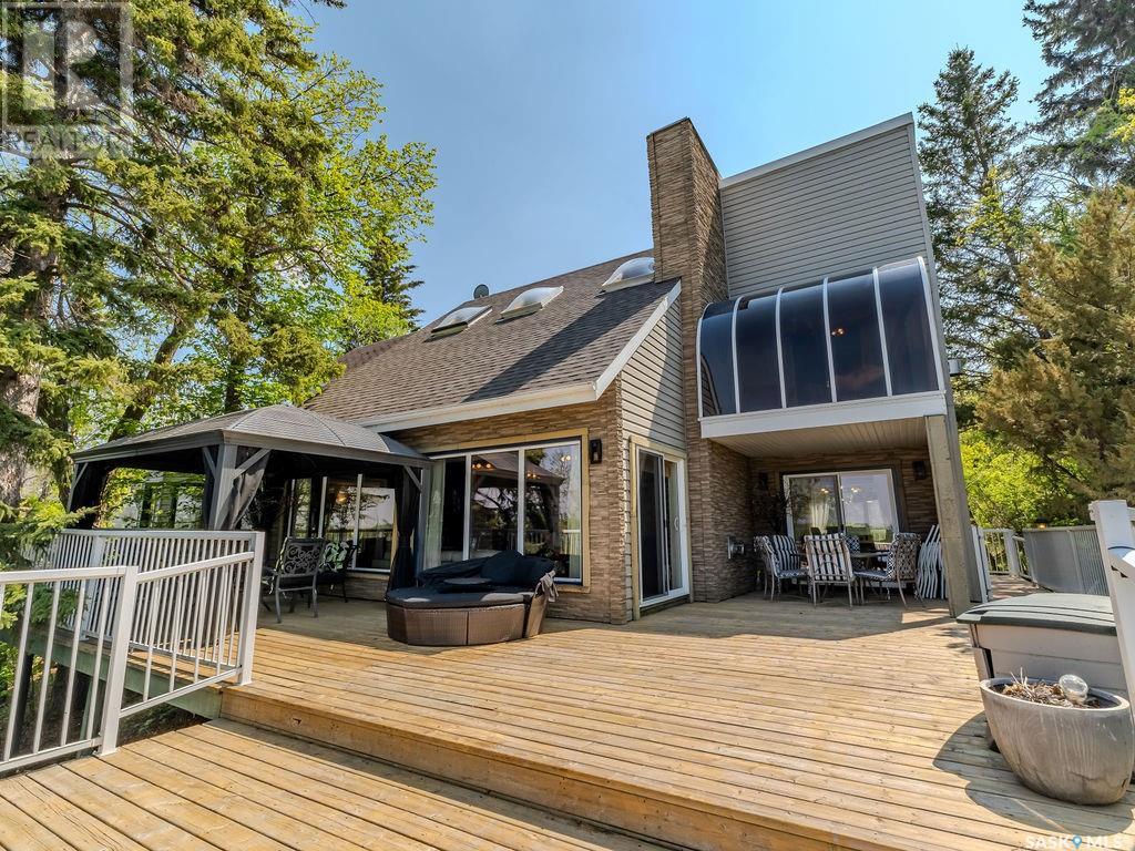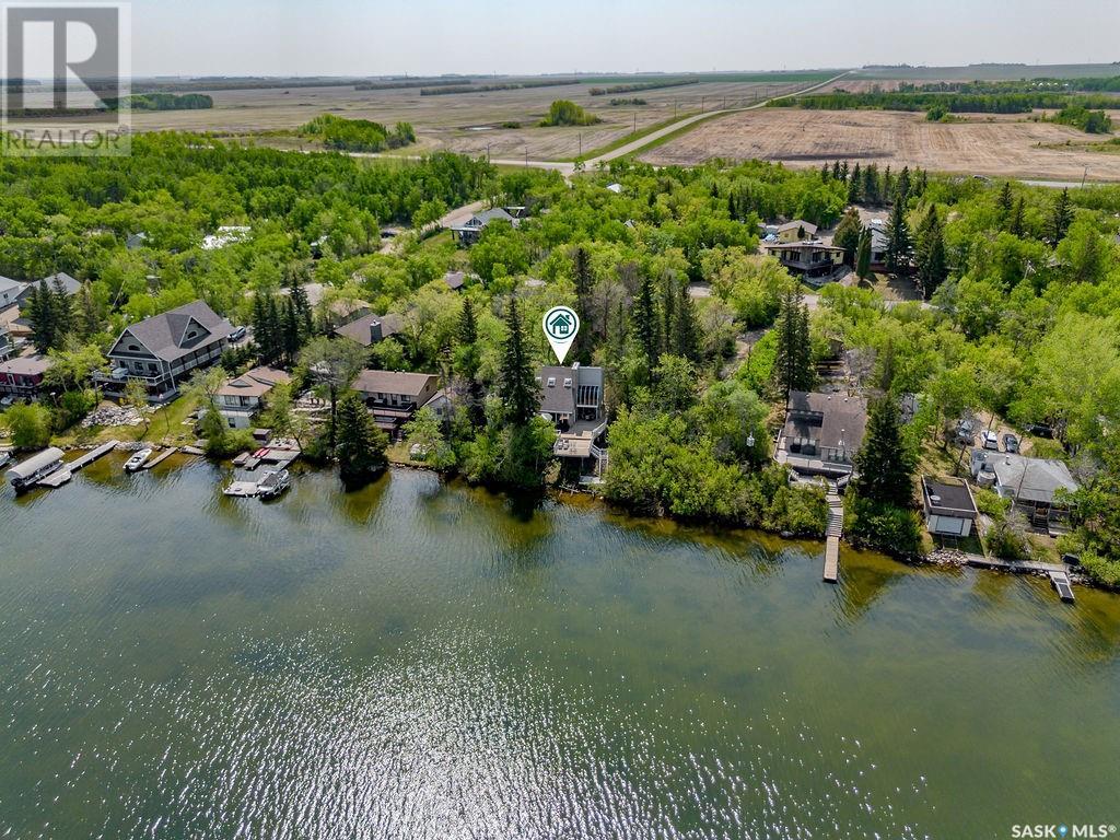 Outstanding, one of a kind, 4 season home on the best lot at Wakaw Lake! Welcome to 93 Crescent Ave at Poplar Beach, an impressive property boasting a 2000+sf home with three bedrooms and two bathrooms featuring an astonishing 130+ feet of lakefront. This completely private lot must be seen to be believed; with 0.6acres of property, you'll enjoy total privacy surrounded by a canopy of trees, offering a tranquil, natural environment to unwind from city life. Inside the home, buyers will love the soaring ceilings, huge windows and warm woodwork throughout the expansive main floor. Featuring heated tiled flooring in the entry and kitchen, Redl kitchen with high end stainless steel appliances including a gas stove, formal dining with wrap around windows, hot tub area, 2pc bath, main floor laundry and cozy gas fireplace, you're sure to be impressed with the unique details and stunning floor to ceiling views of the lake. Upstairs there's two guest bedrooms, one of which features a bright sunroom with more stunning lake views, 3 pc main bathroom and huge primary suite featuring a massive closet/glam room, and a private balcony shaded in tree cover and overlooking the water. Outside, the deck wraps around three sides of the house with separate dining spaces, outdoor kitchen, gazebo and a large area for sunbathing. Buyers will love the triple detached garage, boat/RV/trailer parking, and of course there's plenty of space for a dock. The home has 2500+ gallon holding tanks for the water in the basement and a 1200 gallon septic tank. More notable extras include central air, gas heat and the house can be sold fully furnished. Located steps from the beach and under an hour from the city, this is a once in a lifetime home that you're not going to want to miss. Contact your favourite SK real estate agent to arrange your viewing and don't forget to check out the video. (id:43042)