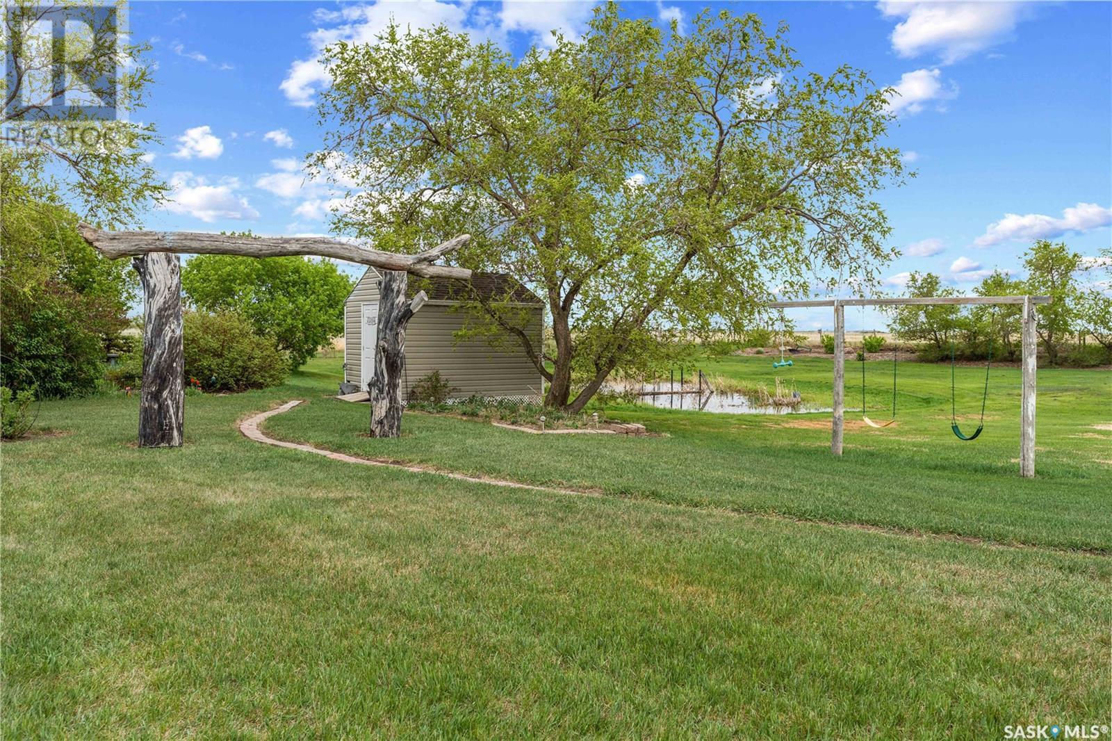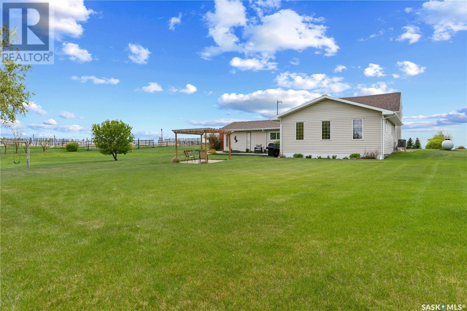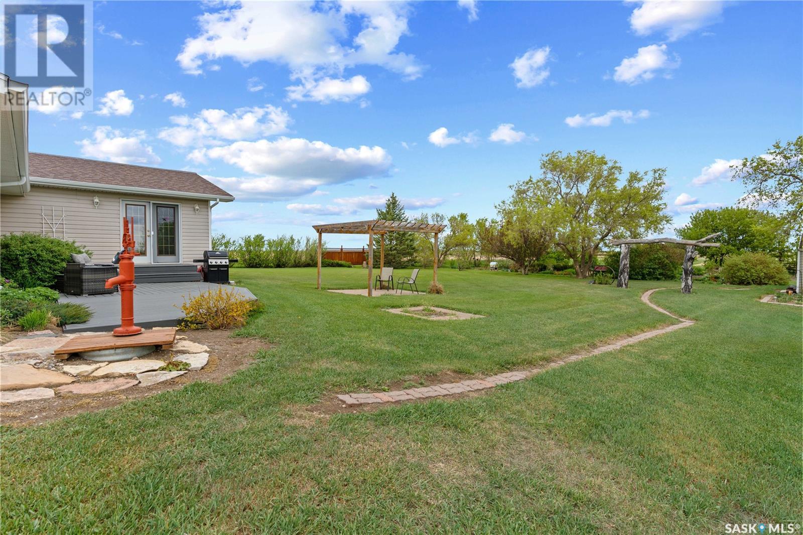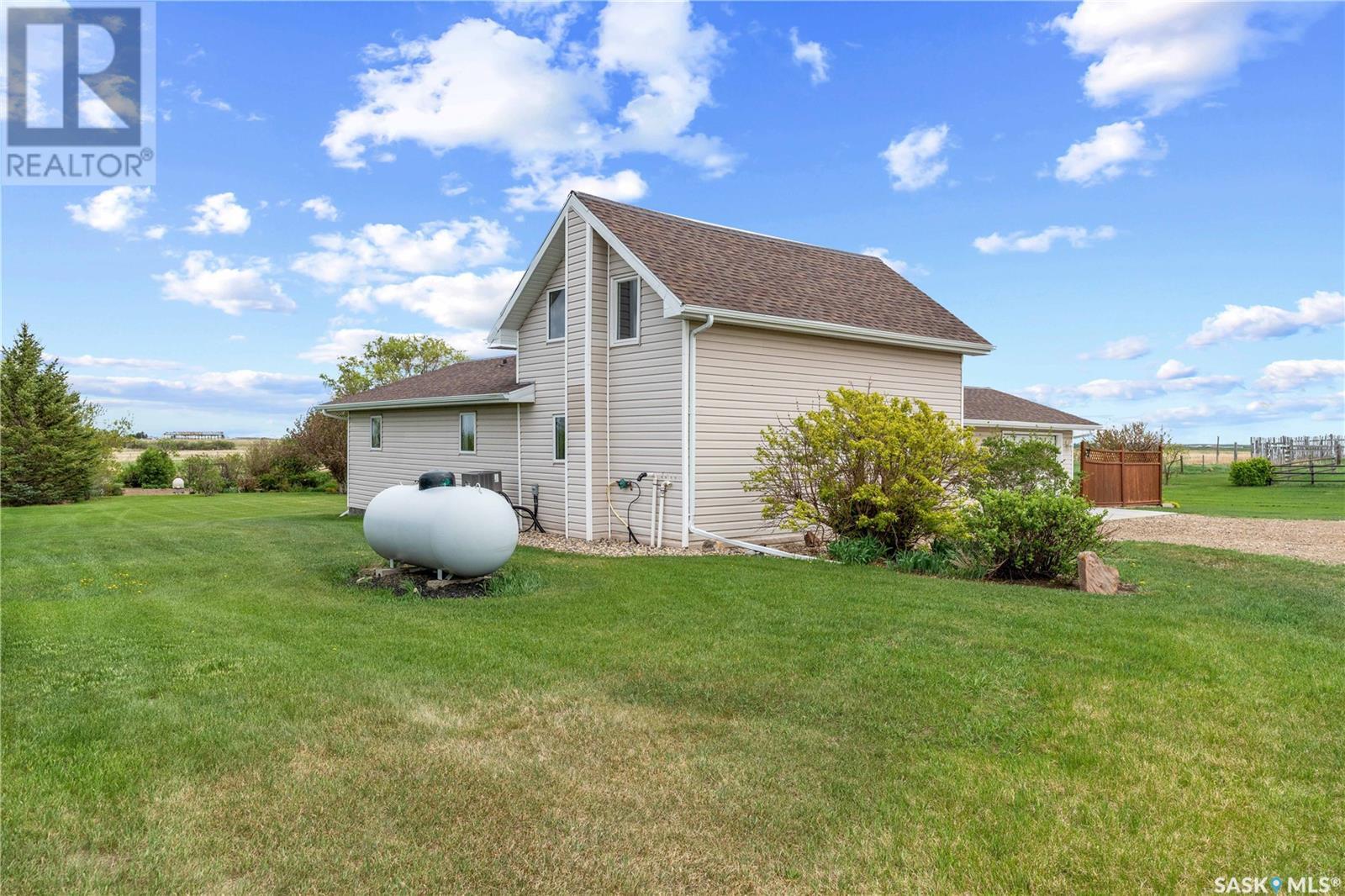 A picturesque rural acreage situated on 10 acres where you can truly get away from it all. Located just north of the Qu’appelle Valley and South of Bethune, off grid 642 with quick access to the K+ S Legacy road and Hwy 11. The property is partially fenced with corrals, water bowls, a 51’x56’ shed, a 30’x60’ storage bay, and water supply from the Dufferin Water Association. A beautiful 2-storey split home sits on the original homestead land, offering 1600 sq/ft of space with an addition that was built in 1998. You will enter the large foyer and kick off those boots before stepping into the main floor living space. The heart of this home is the large, eat-in kitchen with warm wood cabinets, modern appliances and generous counter space, a sit-up island with storage, and updated windows offering lots of natural light. French doors lead to the nicely landscaped yard featuring a sunny deck, pergola, mature trees, and a garden area. The updated 4-piece bath features vinyl tile flooring, a relaxing tub with tile surround, separate shower, and a large vanity. Also on the main floor, you’ll find a bright bedroom with modern laminate flooring, a private office ideal for remote work, and a large laundry room with built-in storage. Upstairs, 2 bedrooms offer ample cozy space and scenic country views. Value added items include all appliances and window coverings, and A/C. If you’ve always pictured a lifestyle surrounded by open space, the freedom to keep a horse or two, or grow a large garden, this is your chance. Call your agent today to schedule a showing. (id:43042)