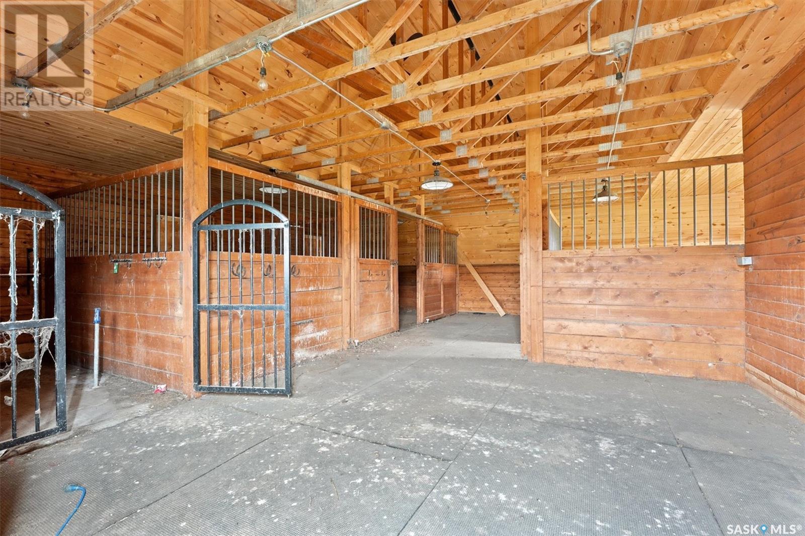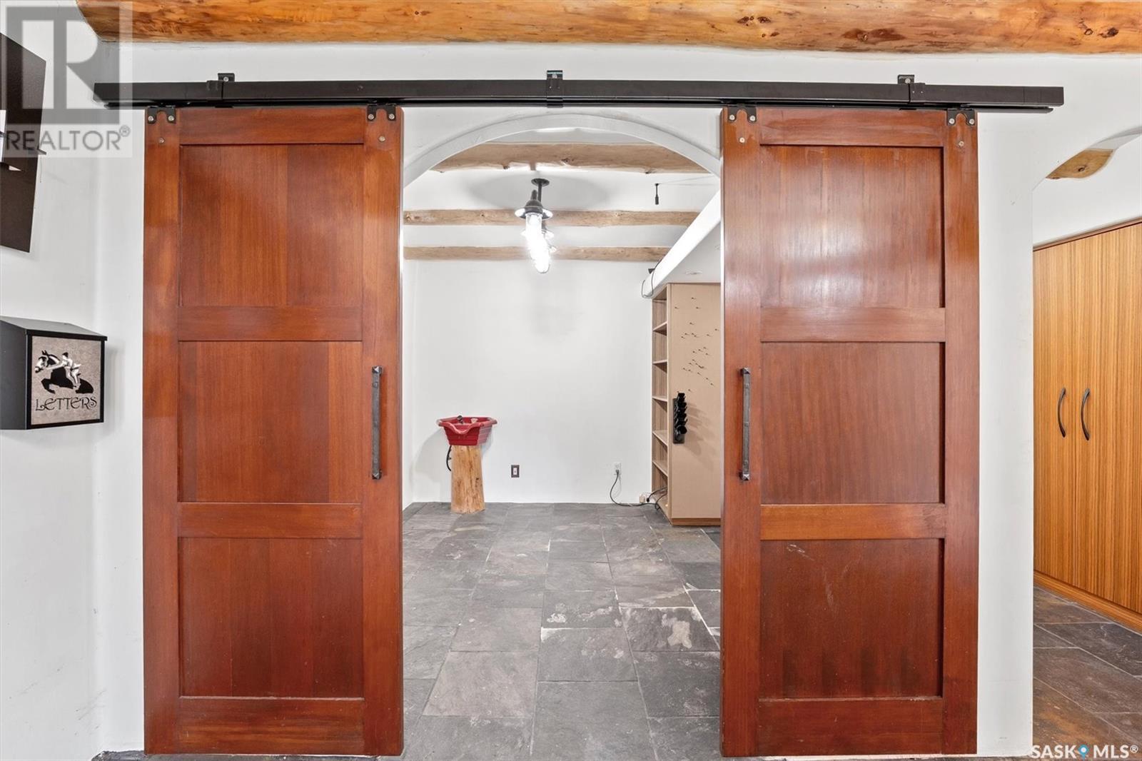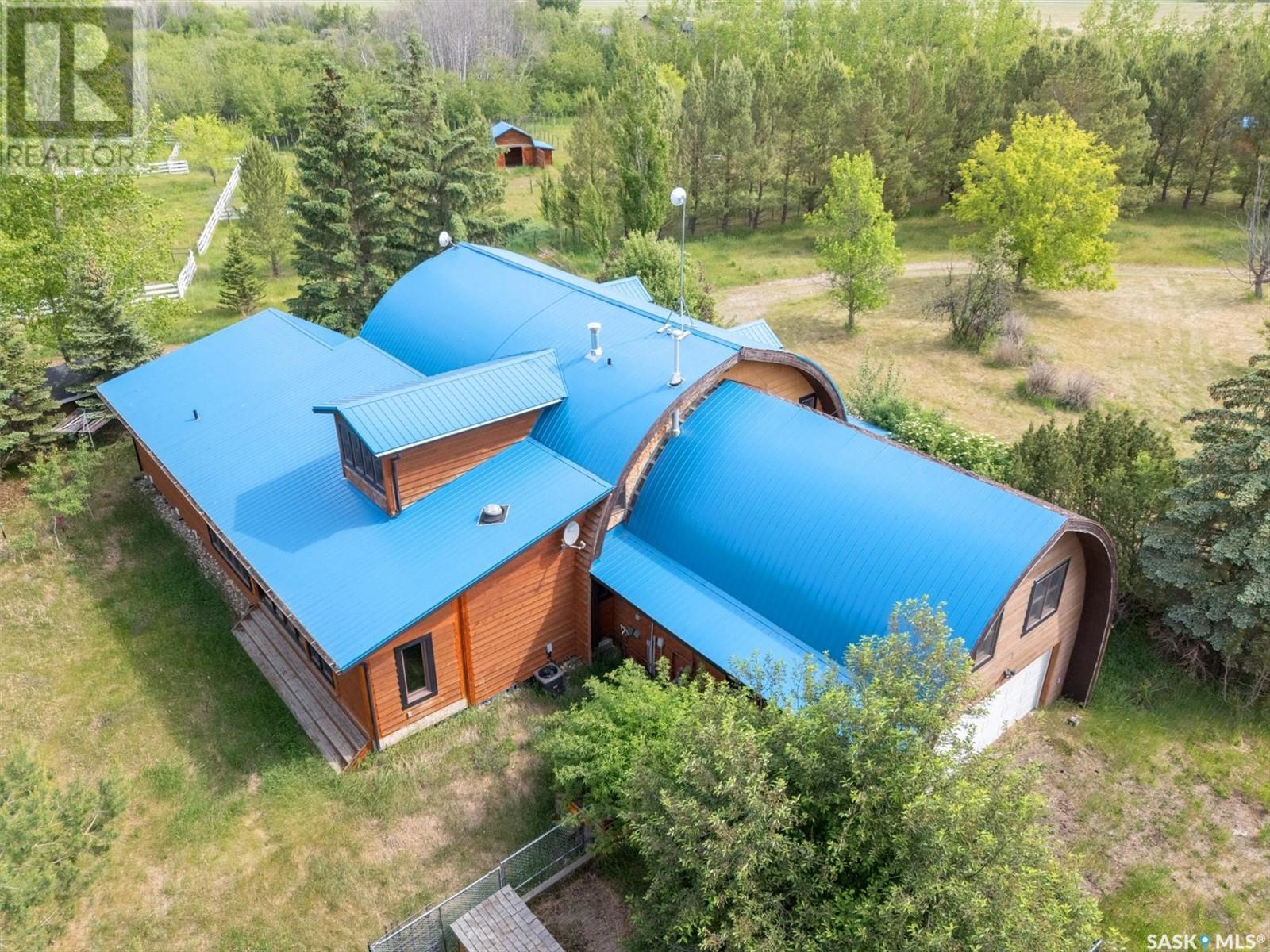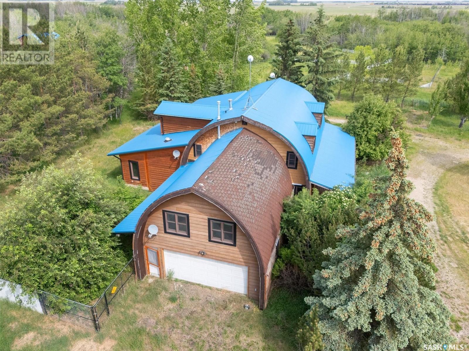 Check out this 21.96 ACRE parcel complete with a ONE-OF-A-KIND archrib style home with attached mother in-law suite; 32 x 36 insulated stable built in 2000; paddocks with shelters; a shelter for feed or equipment storage; and kennels and abundant planted and natural trees. Approx. 14 kilometers SE of Saskatoon. NOTE: the property has been vacant for some time and is being sold 'as is, where is'. The construction quality appears to be excellent in this custom built property. it features Adobe style finishing utilizing many natural products including exposed Douglas fir, cedar accents, rough cut & hand scraped pine, imported tiles from Mexico, custom cabinetry and African Babinga wood. THIS IS TRULY A DISTINCTIVE PROPERTY with Open dining area; two story great room with gas fireplace and very unique light fixtures; primary bedroom with TWO ensuite baths (5 pc bath with bidet & claw foot tub and a 3 pc bath with oversized shower), a gas fireplace, and raised walk-in closet; 2nd bedroom features a 3pc ensuite with a soaker tub and abundant closet space. The bonus room over the garage provides a very generous space for you to let your imagination take over. The attached one bedroom mother-in-law suite with separate entrance plus joining doors is fully equipped. The metal roof was installed in 2011(needs to be completed over the front side of the garage). The water supply was a connection to a high pressure, treated water line ( not drip system ). Out buildings include the 32’ by 36’ insulated stable, 3 stalls, tack and feed room, pine ceiling, 12’x 18’ barn, other animal shelters, a 25’ x 30’ open face feed or equipment storage building plus kennels, garden sheds & paddocks. This property offers many opportunities for the horse enthusiast. Call your real estate professional to view it today! (id:43042)