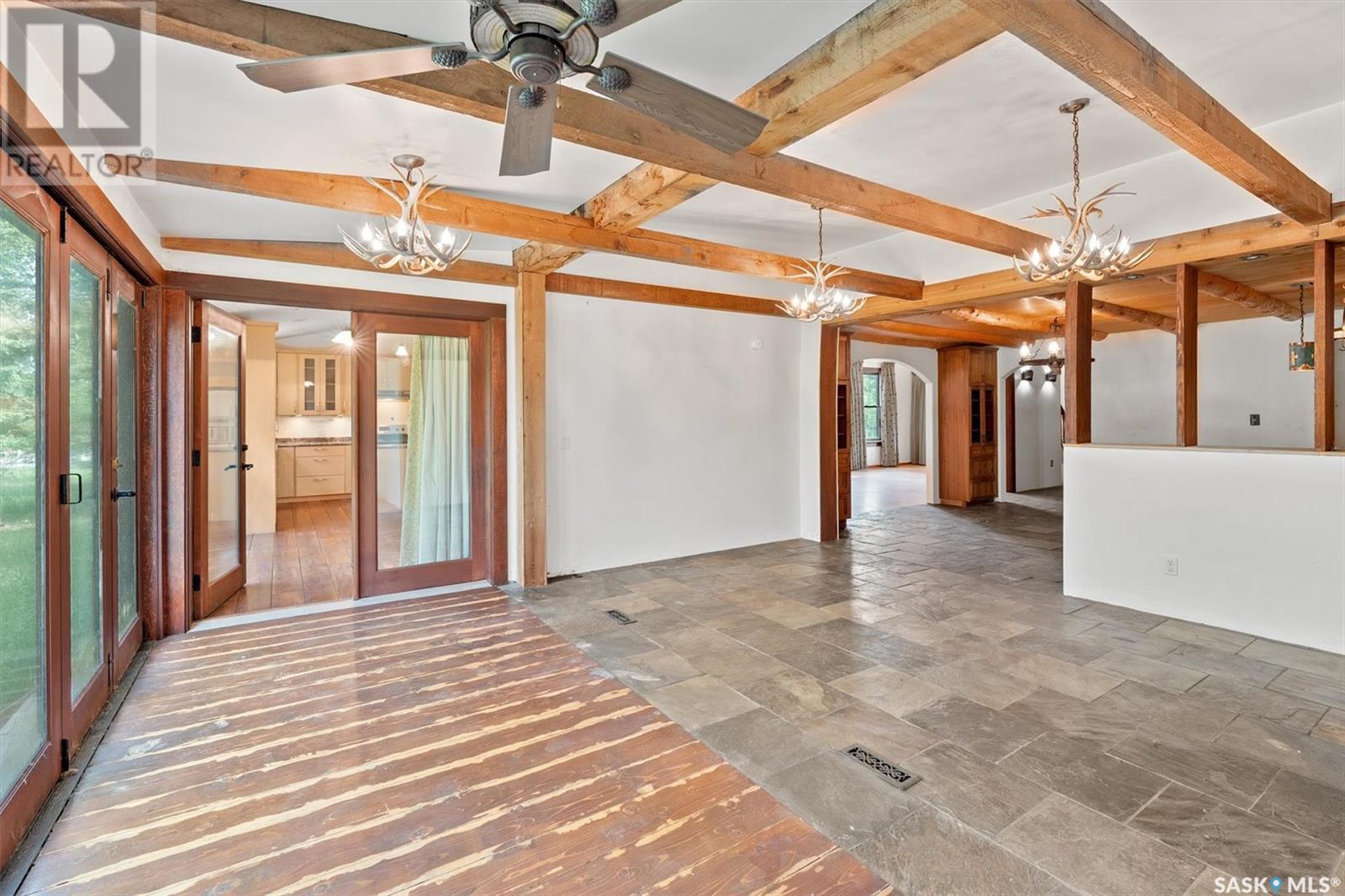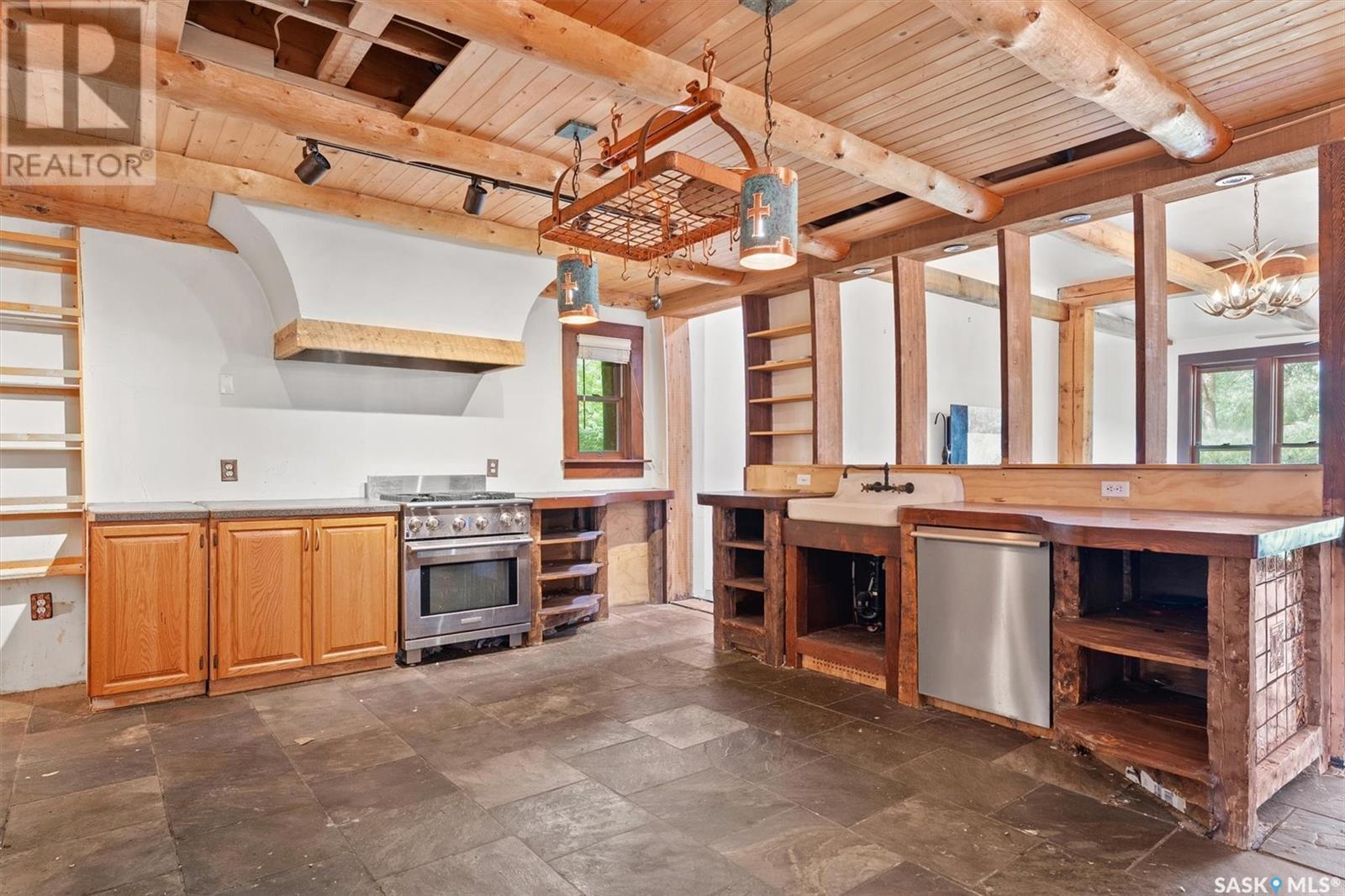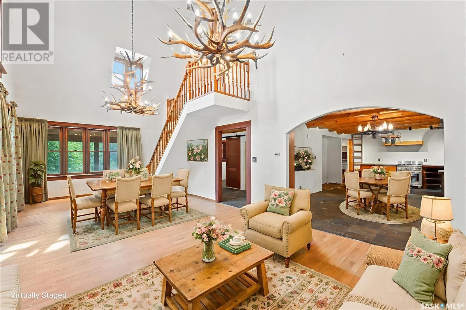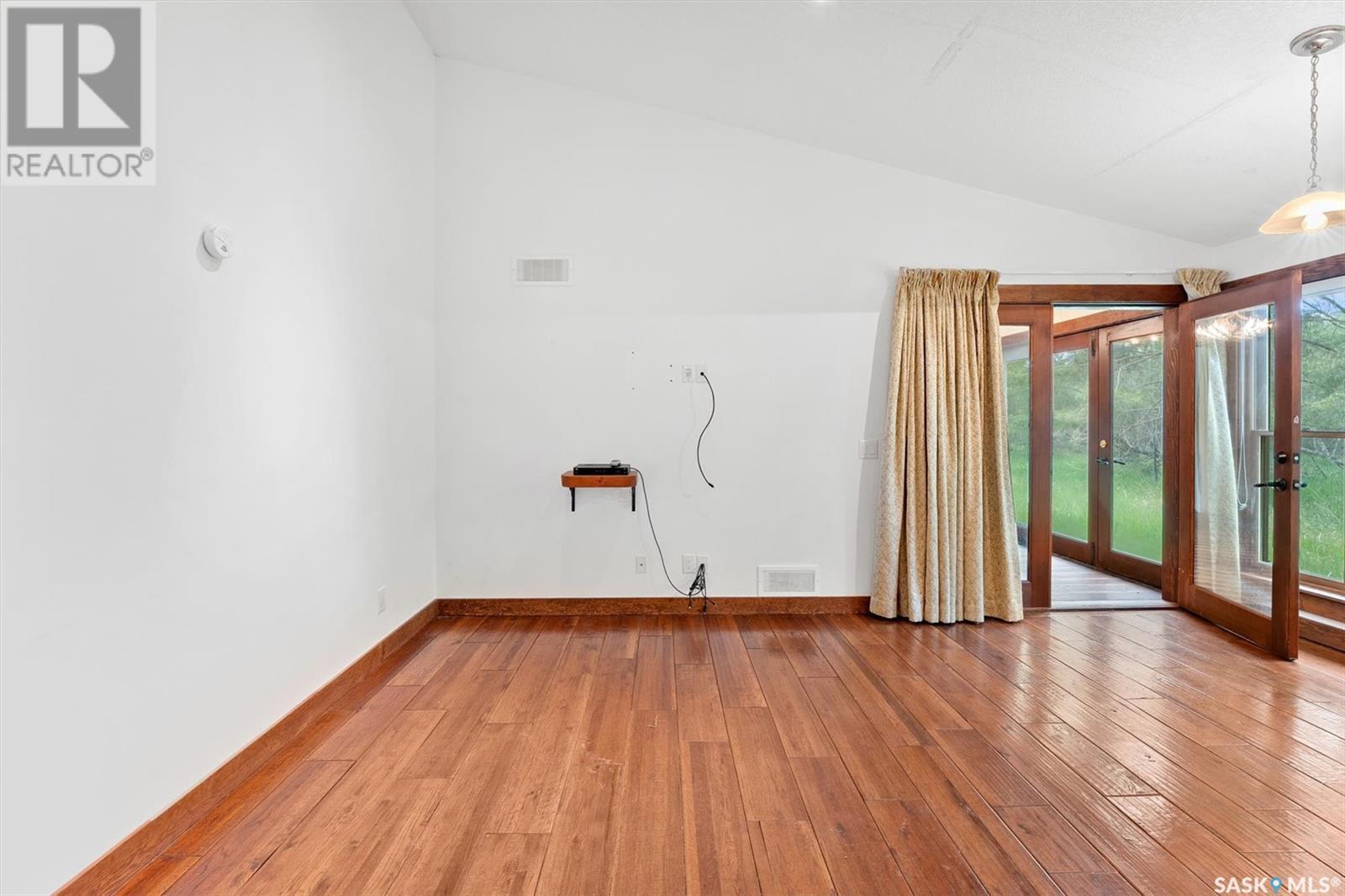 Check out this 21.96 ACRE parcel complete with a ONE-OF-A-KIND archrib style home with attached mother in-law suite; 32 x 36 insulated stable built in 2000; paddocks with shelters; a shelter for feed or equipment storage; and kennels and abundant planted and natural trees. Approx. 14 kilometers SE of Saskatoon. NOTE: the property has been vacant for some time and is being sold 'as is, where is'. The construction quality appears to be excellent in this custom built property. it features Adobe style finishing utilizing many natural products including exposed Douglas fir, cedar accents, rough cut & hand scraped pine, imported tiles from Mexico, custom cabinetry and African Babinga wood. THIS IS TRULY A DISTINCTIVE PROPERTY with Open dining area; two story great room with gas fireplace and very unique light fixtures; primary bedroom with TWO ensuite baths (5 pc bath with bidet & claw foot tub and a 3 pc bath with oversized shower), a gas fireplace, and raised walk-in closet; 2nd bedroom features a 3pc ensuite with a soaker tub and abundant closet space. The bonus room over the garage provides a very generous space for you to let your imagination take over. The attached one bedroom mother-in-law suite with separate entrance plus joining doors is fully equipped. The metal roof was installed in 2011(needs to be completed over the front side of the garage). The water supply was a connection to a high pressure, treated water line ( not drip system ). Out buildings include the 32’ by 36’ insulated stable, 3 stalls, tack and feed room, pine ceiling, 12’x 18’ barn, other animal shelters, a 25’ x 30’ open face feed or equipment storage building plus kennels, garden sheds & paddocks. This property offers many opportunities for the horse enthusiast. Call your real estate professional to view it today! (id:43042)