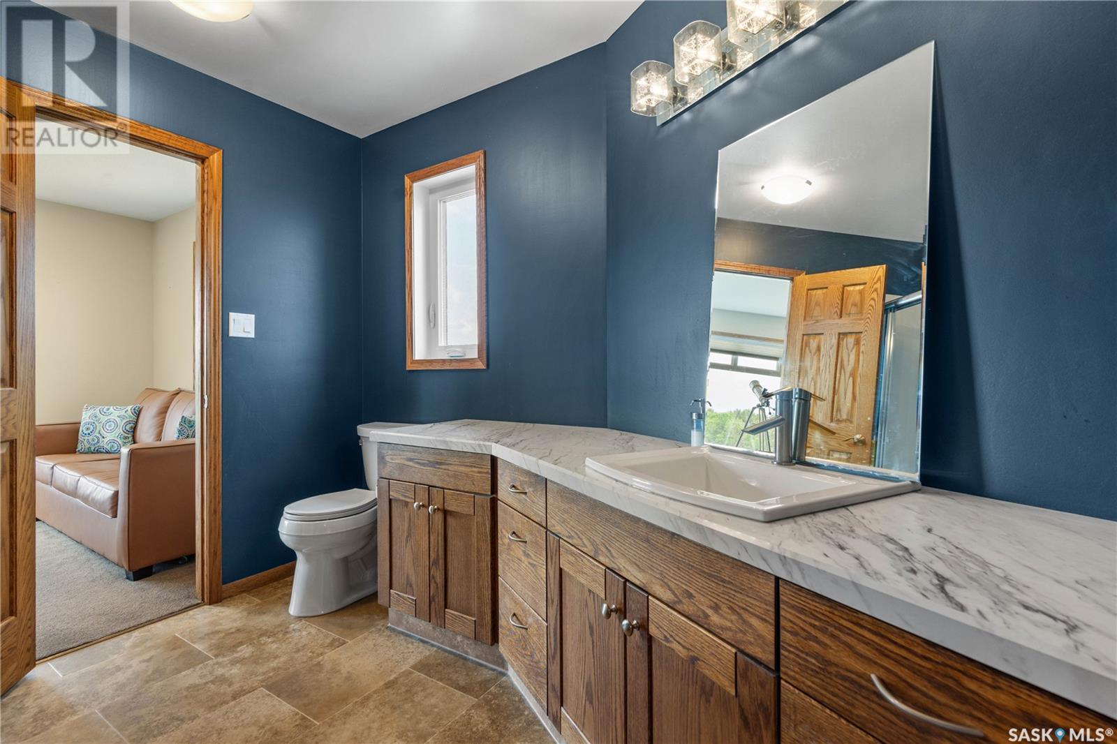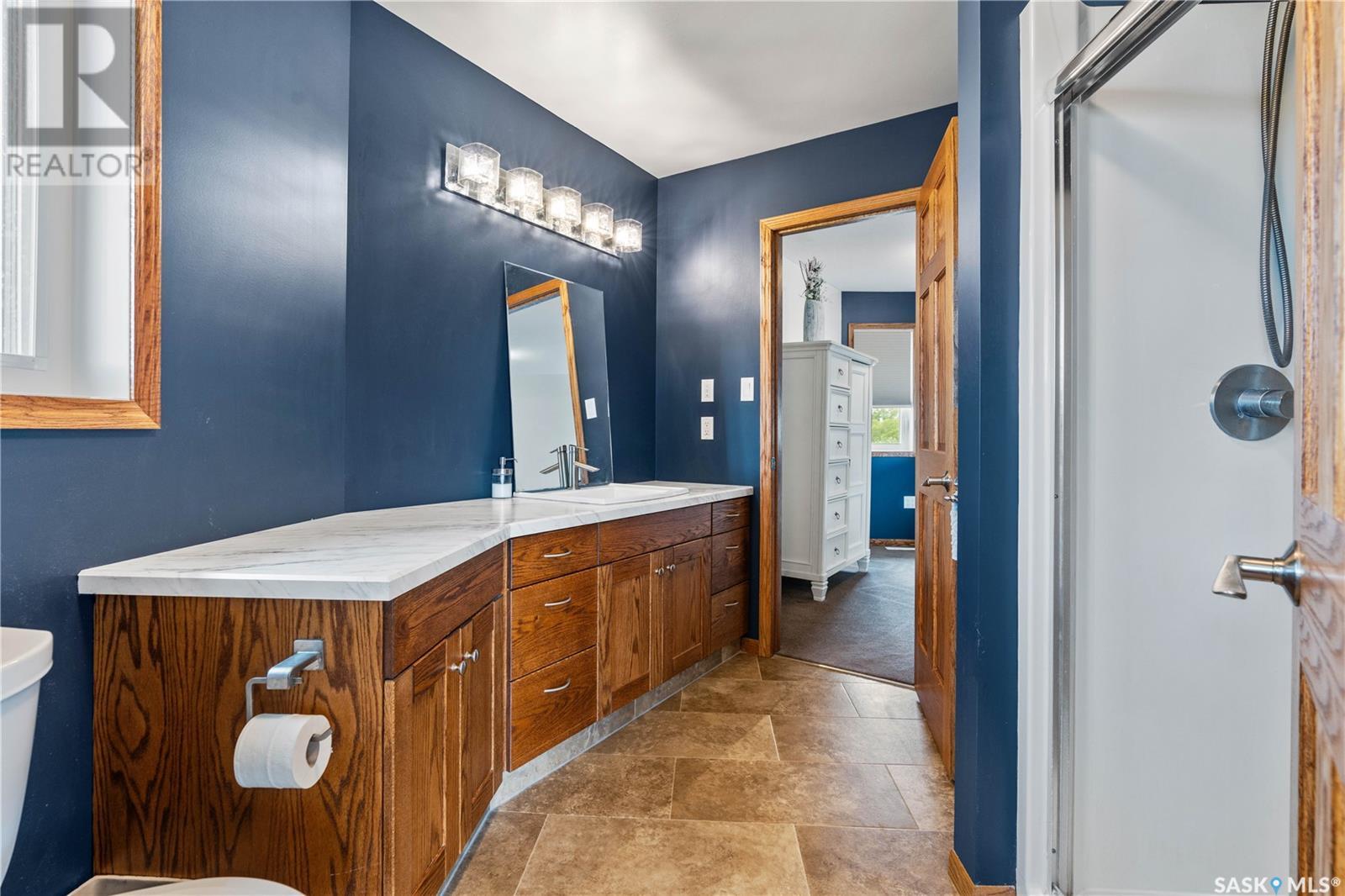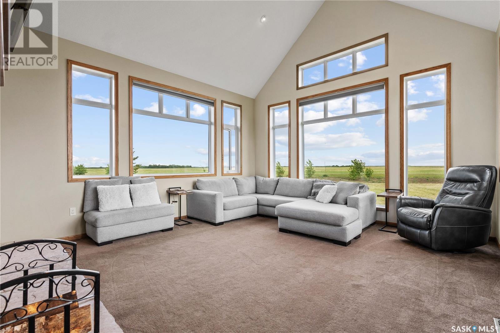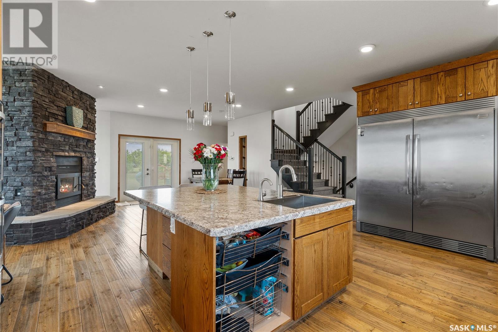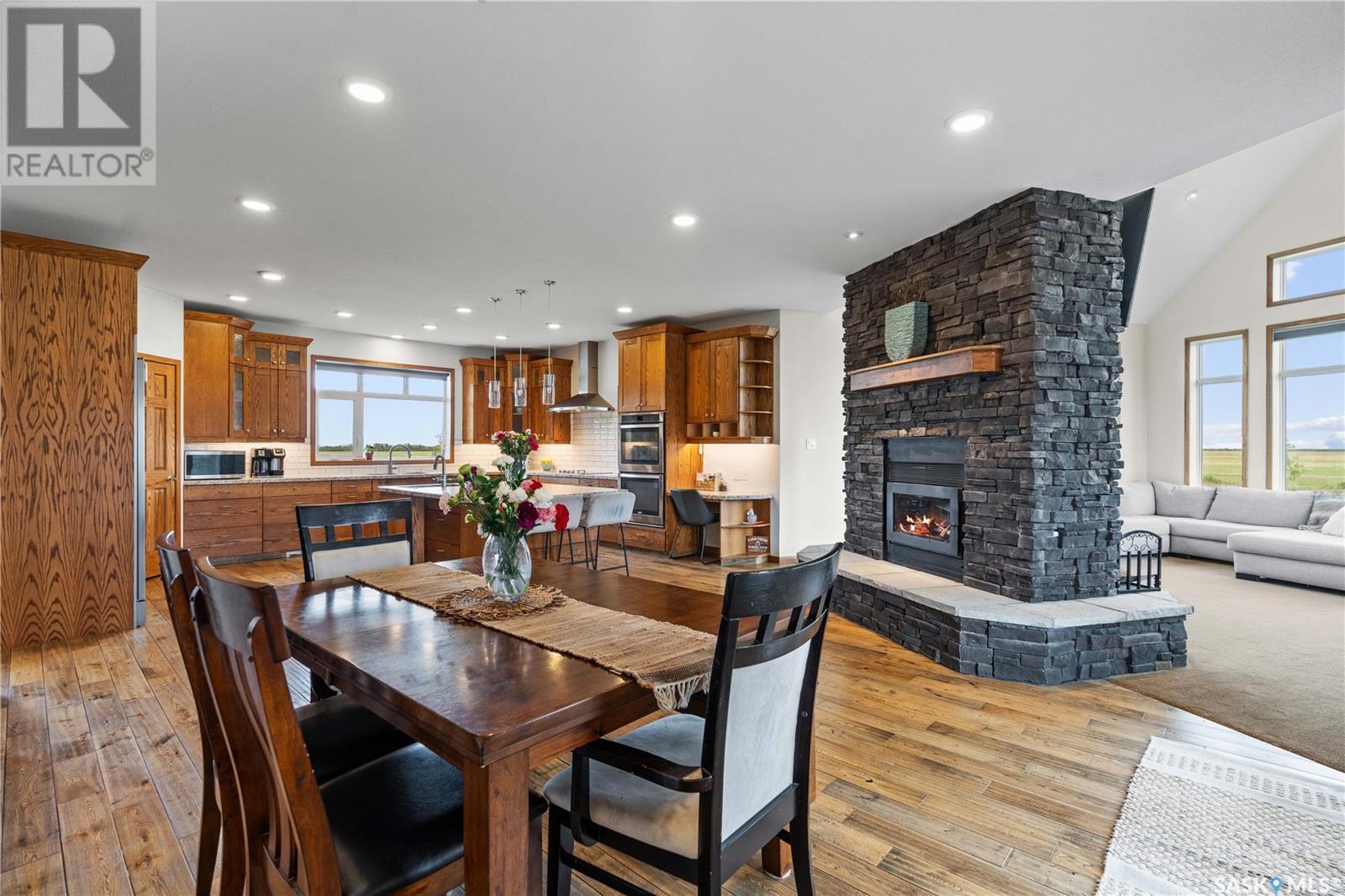 Welcome to your dream acreage! This gorgeous property offers 19.94 acres of meticulously maintained land. Whether you're looking for space, privacy, or a blend of agricultural and residential potential, this has it all. Step into the large, tiled front entry and feel right at home. Main floor showcases a spacious living room with massive windows and a striking stone fireplace, a formal dining area with rich hardwood floors, and a truly impressive kitchen. Designed for entertaining and family living, the kitchen features a large island with a secondary sink, stainless steel appliances, wall oven, tile backsplash, and abundant cabinetry. A convenient 2-piece bathroom rounds out the main level. Upstairs, double doors lead into the primary bedroom complete with a 3-piece ensuite featuring a stand-up shower, lots of counter space, and ample storage. You’ll also find 5 additional bedrooms, a 4-piece bathroom, a bonus room, a dedicated office, and laundry—all thoughtfully placed on the upper floor for comfort and functionality. The finished basement offers even more living space with a cozy family room, a recreation room currently used as a home gym, an additional 3-piece bathroom, utility room, 9 ft ceilings throughout and luxurious in-floor heating. The heated, insulated double attached garage also features in-floor heat—ideal for year-round use. There are two furnaces for the upstairs and main floor separately. A reverse osmosis system is included for the house tap. Iron filter/water softener system is in use. Property is professionally landscaped and offers an abundance of space for outdoor storage, gardening, or future development. Majority of open acres are currently rented to a local farmer who has planted durum wheat. Beautifully treed backyard with the property line that extends beyond the trees. Bus comes right to front door to the wonderful K-12 school in Imperial! Land is located across from crown land and national wildlife refuge! Call today! (id:43042)