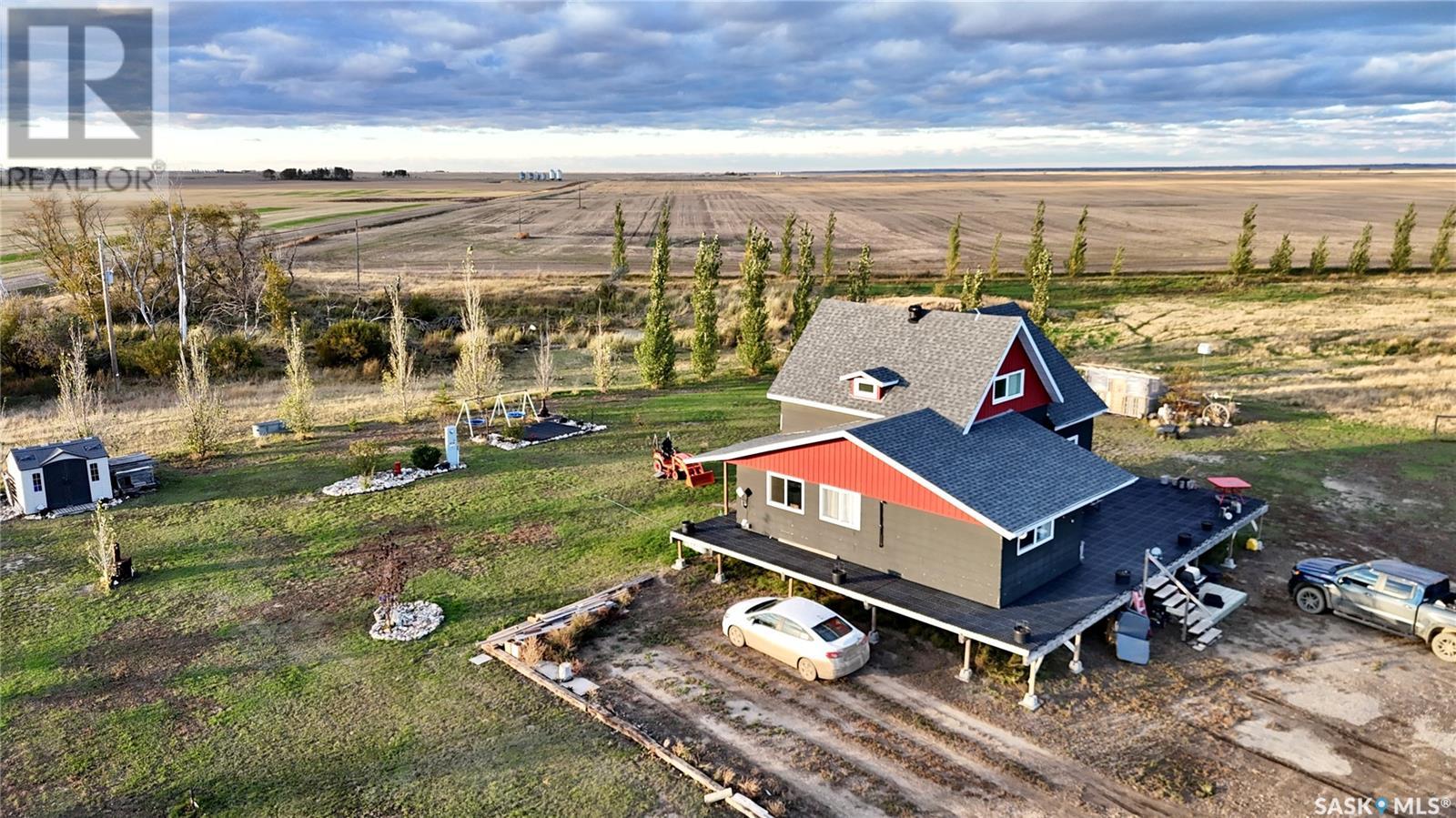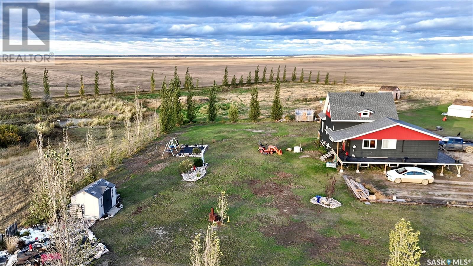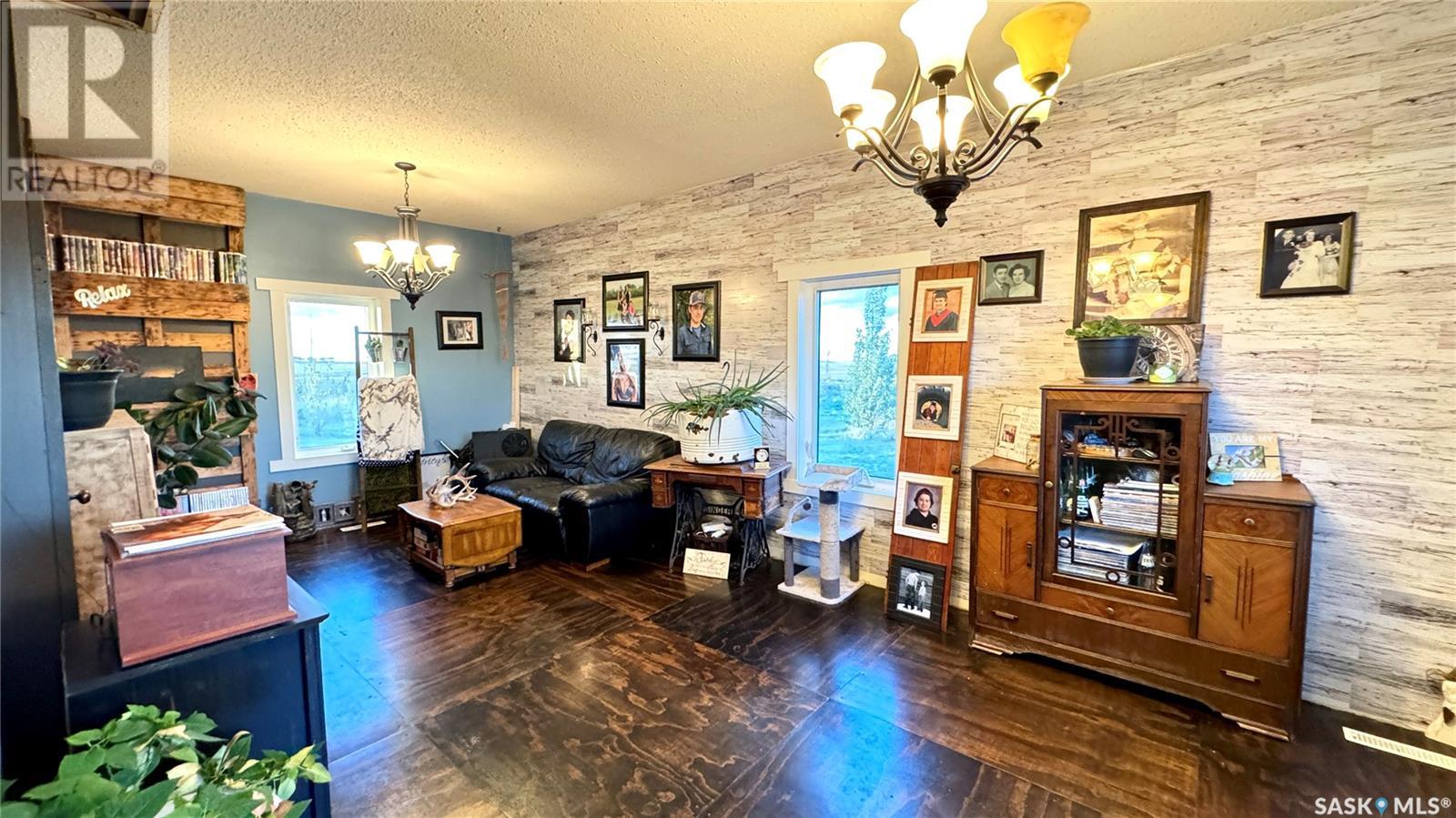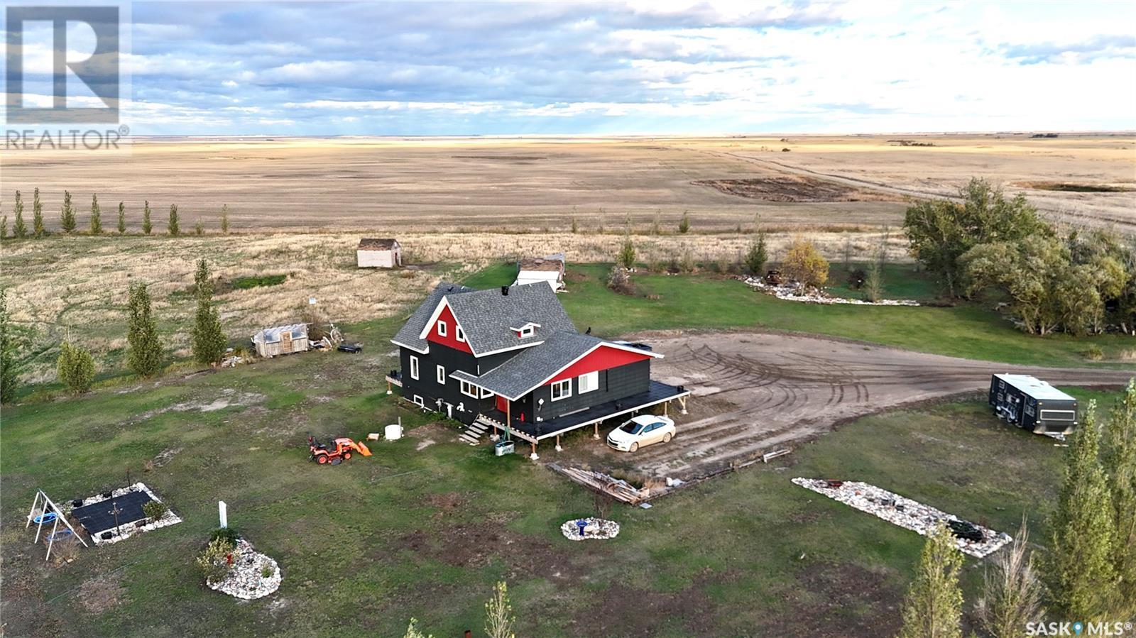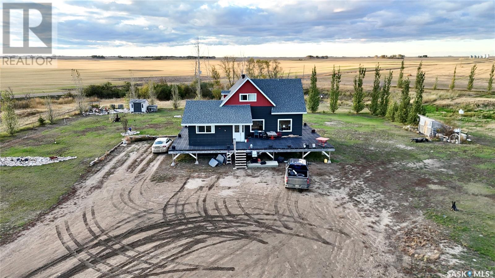 Located just 3.5 miles east of STRONGFIELD, SK, this 10-acre acreage offers modern comforts and COUNTRY CHARM, including MUNICIPAL WATER service. The 2,140 sq ft home, originally built in 1925 with a 1975 addition, was relocated in 2013 to its current location on a treated wood basement. With 6 bedrooms and 3 full bathrooms, this spacious home is perfect for families. The main floor features the master bedroom, a beautifully renovated bathroom with a free-standing soaker tub, an open-concept kitchen, dining, and living area, and the convenience of MAIN FLOOR LAUNDRY. Upstairs, there are 3 additional bedrooms and a full bathroom, while the basement includes 2 bedrooms, a large utility room, a combined rec room and family room, and plenty of storage. Recent updates include new triple-pane windows (2024), providing energy efficiency and abundant natural light. Outside, a 1,064 sq ft wrap-around deck offers plenty of space to relax and entertain while enjoying the peaceful surroundings. The property includes a few outbuildings, ideal for animals, and a dugout for watering animals, the lawn, and the garden. Plus, LAKE DIEFENBAKER is just 20 miles south on Highway 19, perfect for weekend lake getaways. This serene acreage combines space, comfort, and modern amenities. Don’t miss your chance to make it your own! Directions: 3.5 miles east of Strongfield, SK off of HWY 19. (id:43042)