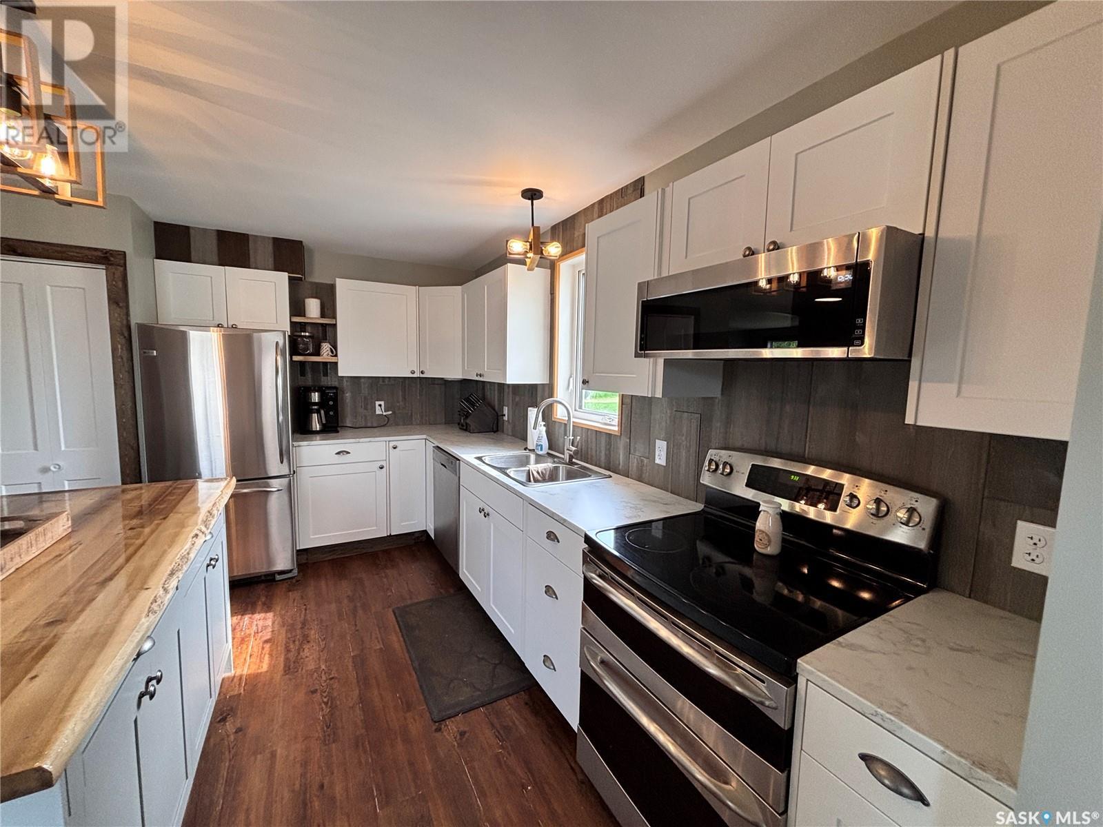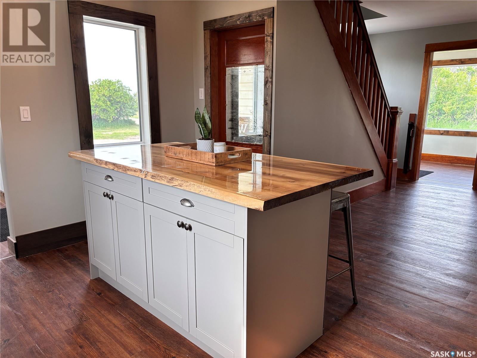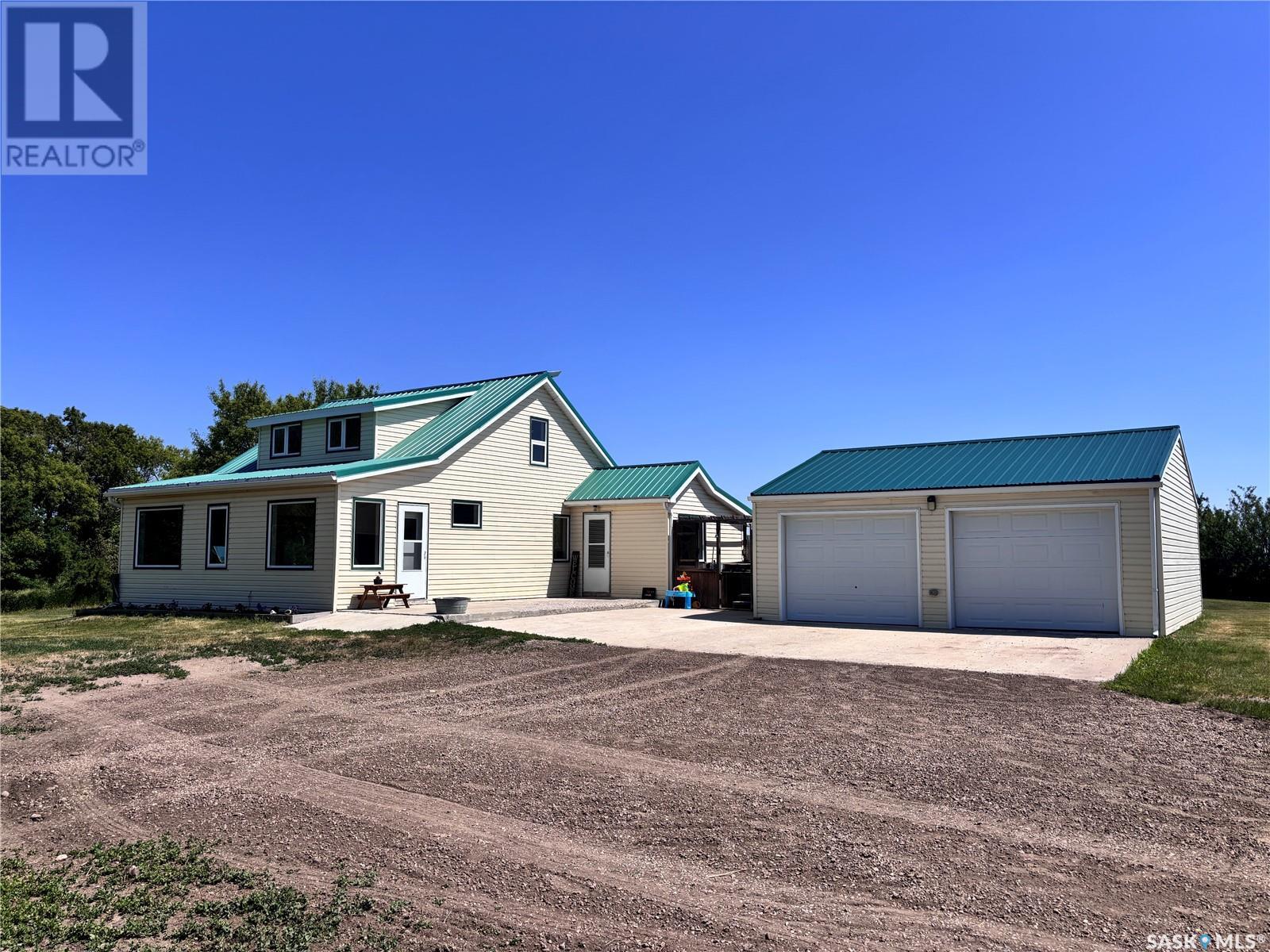Nestled on an expansive 40 acres, this exceptional property offers the perfect blend of rural living with the convenience of nearby amenities. At just under 1,400 sq ft, this charming 1940 built home has been lovingly maintained and thoughtfully upgraded. Step into the oversized mudroom, with laundry and 3pc bath steps away, a must for country living! The heart of the home features a spacious, upgraded kitchen with new cupboards, SS appliances, a functional island and open shelving with a coffee bar! The country charm continues upstairs with original wood stairs, banister and floors throughout. 2 bedrooms, 4pc fully renovated bath and 2 of the cutest wooden doors for all your storage needs! (complete with skeleton key) Energy efficiency is at the forefront, with a state-of-the-art geothermal heating and cooling system, on-demand hot water heater, upgraded windows, siding insulation, PEX water lines, sewer system, drilled well with potable water and underground power lines. Outside you will find a a double car garage and barn for storage, concrete pad and garage apron, plenty of room for gardening and just enjoying the views of Stockwell Lake! With its combination of upgraded features, historic charm and spanning greenspace, this is more than just a house- its an opportunity to live the lifestyle you have always dreamed off! Don't miss your chance to own this unique and versatile retreat! Distance to Outlook: 23 Minutes Saskatoon: 1h 17 Minutes Lake Diefenbaker: 27 Minutes Directions: Drive South (approx) 15KM on Surbiton Road (across from Conquest East access road) off Highway 15. Turn LEFT at sign, LEFT at end of shared road. Directions: Drive South (approx) 15KM on Surbiton Road (across from Conquest East access road) off Highway 15. Turn LEFT at sign, LEFT at end of shared road. (id:43042)