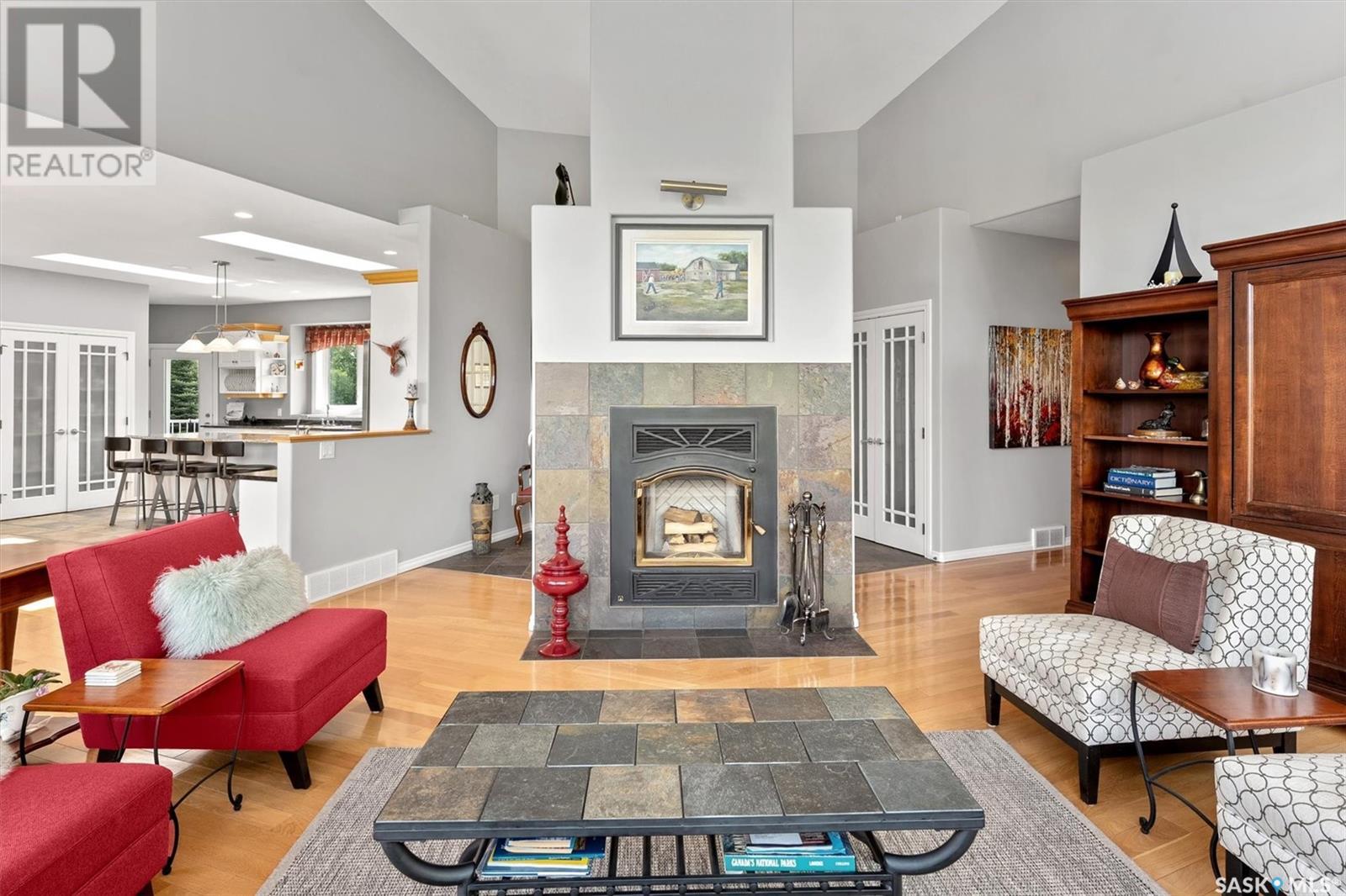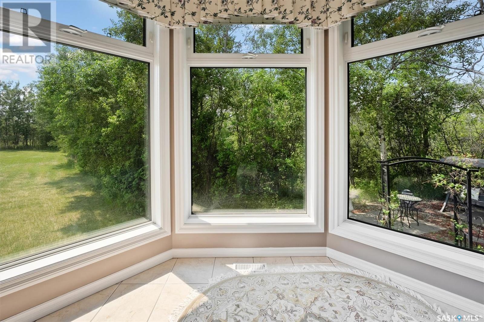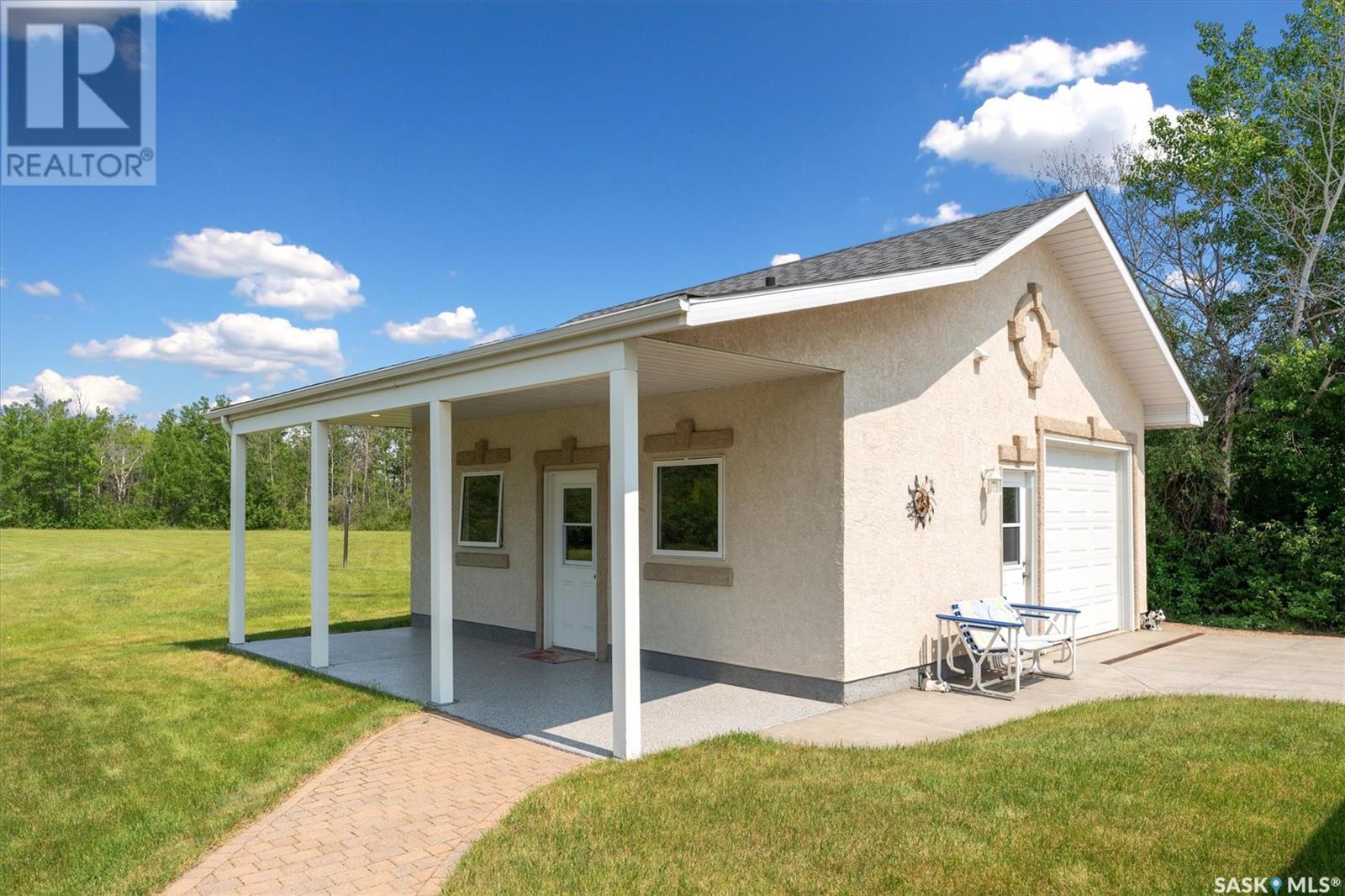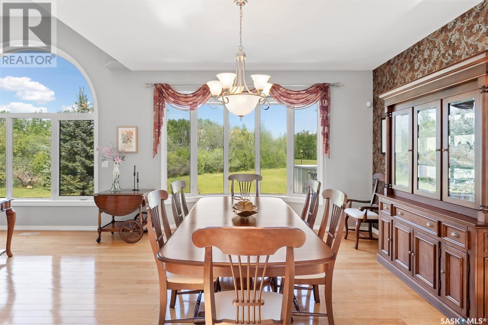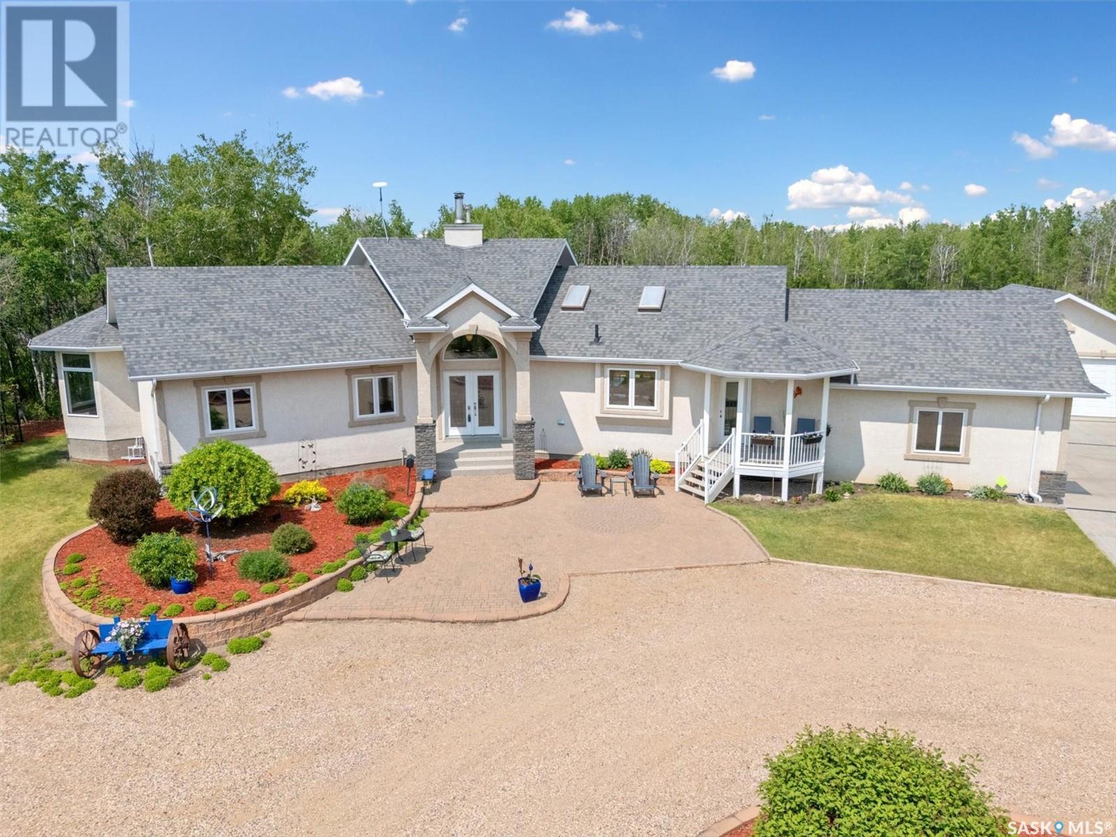Welcome to The Meadow, a rare opportunity to own 80 acres of pure serenity on the southeast doorstep of Saskatoon. This peaceful paradise offers the privacy and tranquility of country living, just minutes from Costco and Greenbryre Golf & Country Club. This sprawling, custom-built Ehrenburg bungalow is designed for comfort, beauty, and connection to the nature. The grand front entry welcomes you with soaring vaulted ceilings and a sweeping sense of space. The centerpiece of the great room is a stunning wood-burning fireplace, creating a warm, inviting atmosphere enhanced by floor-to-ceiling windows that frame breathtaking views of the wilderness waiting for you out your back door. White oak hardwood gleams throughout the main floor, paired with slate tile in the foyer and kitchen. The spacious kitchen features a large 8-foot granite island, gas stove, built in oven, ample cupboard space, and easy flow into a turret-shaped sun porch—perfect for morning coffee or sunny, lazy afternoons. This south-facing gem is flooded with natural light and designed to make the most of every season. The main floor also includes laundry, three well-appointed bathrooms, and three bedrooms. The primary bedroom offers a peaceful retreat, complete with a three-piece ensuite and a private turret-shaped sunroom for year-round quiet moments of rest and reflection. Additional features include a heated double attached garage and a wide single detached garage with shower and bathroom facilities—an ideal workshop with ample space for storage and tons of room for any project. The full basement is ready for your custom development, with in-floor heating lines already roughed in. Whether you're looking to raise a family, escape the city, or simply enjoy life in harmony with nature, The Meadow delivers the best of all worlds—privacy, space, and proximity to everything you need. Must be experienced to be fully appreciated. Call your favourite Realtor® to arrange a private viewing today! (id:43042)