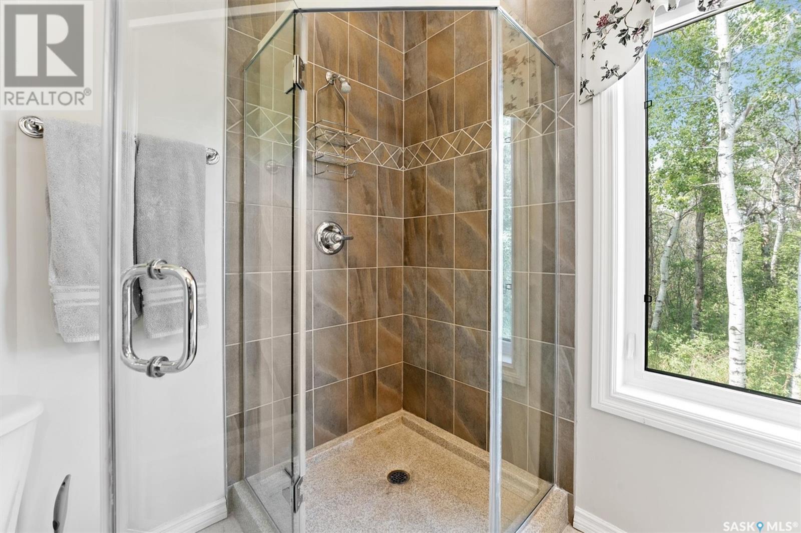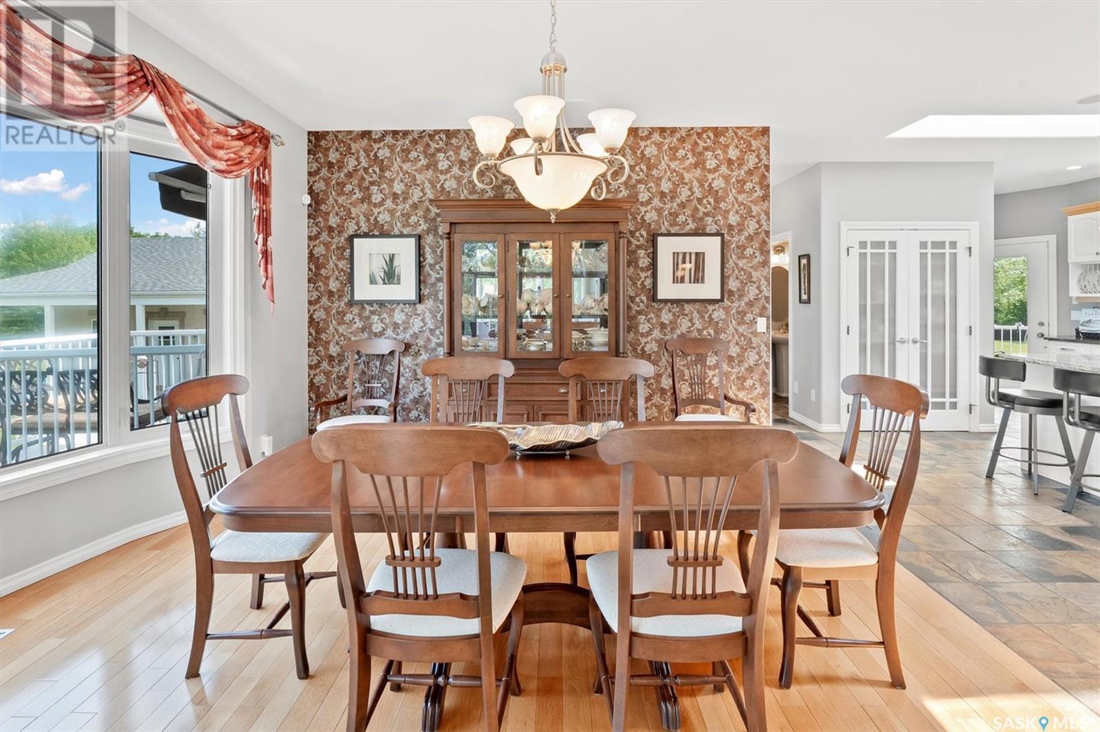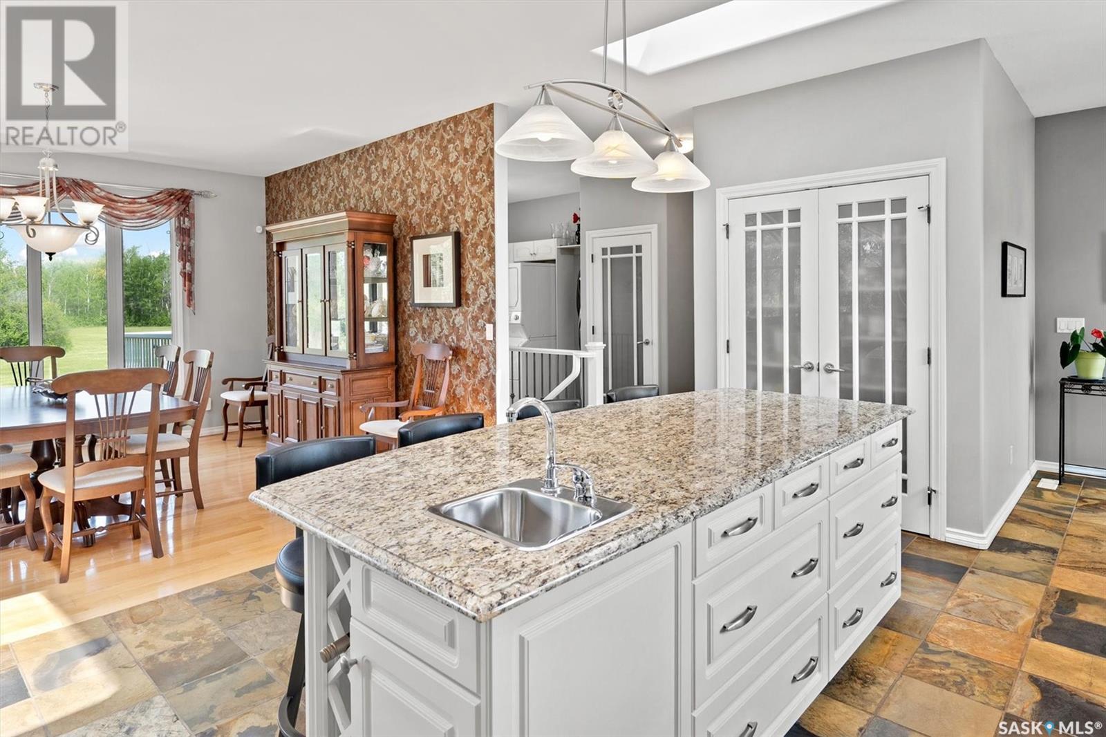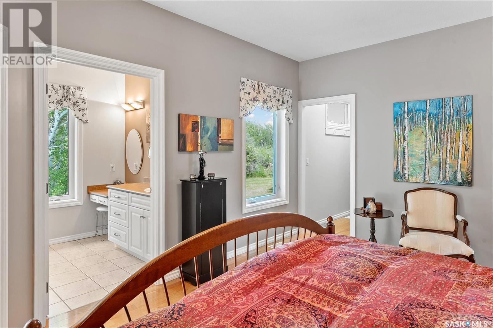 Welcome to The Meadow, a rare opportunity to own 80 acres of pure serenity on the southeast doorstep of Saskatoon. This peaceful paradise offers the privacy and tranquility of country living, just minutes from Costco and Greenbryre Golf & Country Club. This sprawling, custom-built Ehrenburg bungalow is designed for comfort, beauty, and connection to the nature. The grand front entry welcomes you with soaring vaulted ceilings and a sweeping sense of space. The centerpiece of the great room is a stunning wood-burning fireplace, creating a warm, inviting atmosphere enhanced by floor-to-ceiling windows that frame breathtaking views of the wilderness waiting for you out your back door. White oak hardwood gleams throughout the main floor, paired with slate tile in the foyer and kitchen. The spacious kitchen features a large 8-foot granite island, gas stove, built in oven, ample cupboard space, and easy flow into a turret-shaped sun porch—perfect for morning coffee or sunny, lazy afternoons. This south-facing gem is flooded with natural light and designed to make the most of every season. The main floor also includes laundry, three well-appointed bathrooms, and three bedrooms. The primary bedroom offers a peaceful retreat, complete with a three-piece ensuite and a private turret-shaped sunroom for year-round quiet moments of rest and reflection. Additional features include a heated double attached garage and a wide single detached garage with shower and bathroom facilities—an ideal workshop with ample space for storage and tons of room for any project. The full basement is ready for your custom development, with in-floor heating lines already roughed in. Whether you're looking to raise a family, escape the city, or simply enjoy life in harmony with nature, The Meadow delivers the best of all worlds—privacy, space, and proximity to everything you need. Must be experienced to be fully appreciated. Call your favourite Realtor® to arrange a private viewing today! (id:43042)
